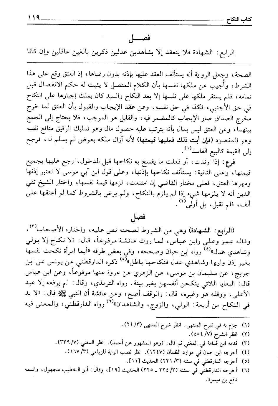 فصل (الرَّابِعُ: الشَّهَادَةُ) وَهِيَ مِنَ الشُّرُوطِ لِصِحَّتِهِ، نَصَّ عَلَيْهِ، وَاخْتَارَهُ الْأَصْحَابُ، وَقَالَهُ عُمَرُ، وَعَلِيٌّ، وَابْنُ عَبَّاسٍ ; لِمَا رَوَتْ عَائِشَةُ مَرْفُوعًا، قَالَ: «لَا نِكَاحَ إِلَّا بَوَلِيٍّ وَشَاهِدَيْ عَدْلٍ» رَوَاهُ ابْنُ حِبَّانَ وَصَحَّحَهُ، وَفِي بَعْضِ طُرُقِهِ «أَيُّمَا امْرَأَةٍ نَكَحَتْ نَفْسَهَا بِغَيْرِ إِذْنِ وَلَيِّهَا وَشَاهِدَيْ عَدْلٍ، فَنِكَاحُهَا بَاطِلٌ» ذَكَرَهُ الدَّارَقُطْنِيُّ عَنْ يُونُسَ، عَنِ ابْنِ جُرَيْجٍ، عَنْ سُلَيْمَانَ بْنِ مُوسَى، عَنِ الزُّهْرِيِّ، عَنْ عُرْوَةَ، عَنْهَا مَرْفُوعًا، وَعَنِ ابْنِ عَبَّاسٍ قَالَ: الْبَغَايَا اللَّائِي يُنْكِحْنَ أَنْفُسَهُنَّ بِغَيْرِ بَيِّنَةٍ. رَوَاهُ التِّرْمِذِيُّ وَقَالَ: لَمْ يَرْفَعْهُ إِلَّا عَبْدُ الْأَعْلَى وَوَقَفَهُ هُوَ وَغَيْرُهُ، قَالَ: وَالْوَقْفُ أَصَحُّ، وَعَنْ عَائِشَةَ أَنَّ النَّبِيَّ - صَلَّى اللَّهُ عَلَيْهِ وَسَلَّمَ - قَالَ: «لَا بُدَّ فِي النِّكَاحِ مِنْ أَرْبَعَةٍ: الْوَلِيُّ، وَالزَّوْجُ، وَالشَّاهِدَانِ» رَوَاهُ الدَّارَقُطْنِيُّ، وَالْمَعْنَى فِيهِ: