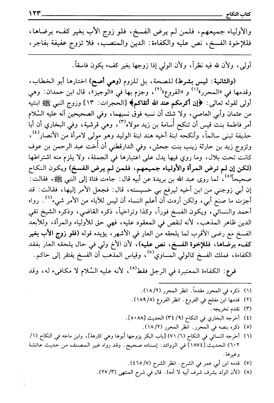 (وَالثَّانِيَةُ: لَيْسَ بِشَرْطٍ) لِلصِّحَّةِ، بَلْ لِلِّزُومِ (وَهِيَ أَصَحُّ) اخْتَارَهَا أَبُو الْخَطَّابِ، وَقَدَّمَهَا فِي " الْمُحَرَّرِ " و" الْفُرُوعِ "، وَجَزَمَ بِهَا فِي " الْوَجِيزِ "، قَالَ ابْنُ حَمْدَانَ: وَهِيَ أَوْلَى ; لِقَوْلِهِ تَعَالَى {إِنَّ أَكْرَمَكُمْ عِنْدَ اللَّهِ أَتْقَاكُمْ} [الحجرات: 13] وَزَوَّجَ النَّبِيُّ - صَلَّى اللَّهُ عَلَيْهِ وَسَلَّمَ - ابْنَتَيْهِ مِنْ عُثْمَانَ وَأَبِي الْعَاصِي، وَلَا شَكَّ أَنَّ نَسَبَهُ فَوْقَ نَسَبِهِمَا، وَفِي الصَّحِيحَيْنِ «أَنَّهُ - عَلَيْهِ السَّلَامُ - أَمَرَ فَاطِمَةَ بِنْتَ قَيْسٍ أَنْ تَنْكِحَ أُسَامَةَ بْنَ زَيْدٍ مَوْلَاهُ، وَهِيَ قُرَشِيَّةٌ» ، وَفِي الْبُخَارِيِّ: أَنَّ أَبَا حُذَيْفَةَ تَبَنَّى سَالِمًا وَأَنْكَحَهُ ابْنَةَ أَخِيهِ هِنْدَ ابْنَةَ الْوَلِيدِ، وَهُوَ مَوْلًى لِامْرَأَةٍ مِنَ الْأَنْصَارِ، وَتَزَوَّجَ زَيْدُ بْنُ حَارِثَةَ زَيْنَبَ بِنْتَ جَحْشٍ، وَفِي الدَّارَقُطْنِيِّ أَنَّ أُخْتَ عَبْدِ الرَّحْمَنِ بْنِ عَوْفٍ كَانَتْ تَحْتَ بِلَالٍ، وَمَا رُوِيَ فِيهَا يَدُلُّ عَلَى اعْتِبَارِهَا فِي الْجُمْلَةِ، وَلَا يَلْزَمُ مِنْهُ اشْتِرَاطُهَا (لَكِنْ إِنْ لَمْ تَرْضَ الْمَرْأَةُ وَالْأَوْلِيَاءُ جَمِيعُهُمْ، فَلِمَنْ لَمْ يَرْضَ الْفَسْخُ) ، وَيَكُونُ النِّكَاحُ صَحِيحًا ; لِمَا رَوَى عَبْدُ اللَّهِ بْنُ بُرَيْدَةَ، عَنْ أَبِيهِ، قَالَ: «جَاءَتْ فَتَاةٌ إِلَى النَّبِيِّ - صَلَّى اللَّهُ عَلَيْهِ وَسَلَّمَ - فَقَالَتْ: إِنَّ أَبِي زَوَّجَنِي مِنِ ابْنِ أَخِيهِ ; لِيَرْفَعَ بِي خَسِيسَتَهُ، قَالَ: فَجَعَلَ الْأَمْرَ إِلَيْهَا، فَقَالَتْ: قَدْ أَجَزْتُ مَا صَنَعَ أَبِي، وَلَكِنْ أَرَدْتُ أَنْ أُعَلِّمَ النِّسَاءَ أَنْ لَيْسَ لِلْآبَاءِ مِنَ الْأَمْرِ شَيْءٌ» رَوَاهُ أَحْمَدُ وَالنَّسَائِيُّ، وَيَكُونُ الْفَسْخُ فَوْرًا، وَكَذَا وَتَرَاخِيًا، ذَكَرَهُ الْقَاضِي، وَذَكَرَهُ الشَّيْخُ تَقِيُّ الدِّينِ، ظَاهِرُ الْمَذْهَبِ ; لِأَنَّهُ لِنَقْصٍ فِي الْمَعْقُودِ عَلَيْهِ، فَهِيَ حَقُّ الْأَوْلِيَاءِ وَالْمَرْأَةِ، وَلِلْأَبْعَدِ الْفَسْخُ مَعَ رِضَا الْأَقْرَبِ ; لِمَا يَلْحَقُهُ مِنَ الْعَارِ فِي الْأَشْهَرِ، يُؤَيِّدُهُ قَوْلُهُ: (فَلَوْ زَوَّجَ الْأَبُ بِغَيْرِ كُفْءٍ بِرِضَاهَا، فَلِلْأُخْوَةِ الْفَسْخُ، نَصَّ عَلَيْهِ) ; لِأَنَّ الْأَخَ وَلِيٌّ فِي حَالٍ يَلْحَقُهُ الْعَارُ بِفَقْدِ الْكَفَاءَةِ، فَمَلَكَ الْفَسْخَ كَالْوَلِيِّ الْمُسَاوِي، وَقِيَاسُ الْمَذْهَبِ أَنَّ الْفَسْخَ يَفْتَقِرُ إِلَى حَاكِمٍ.
