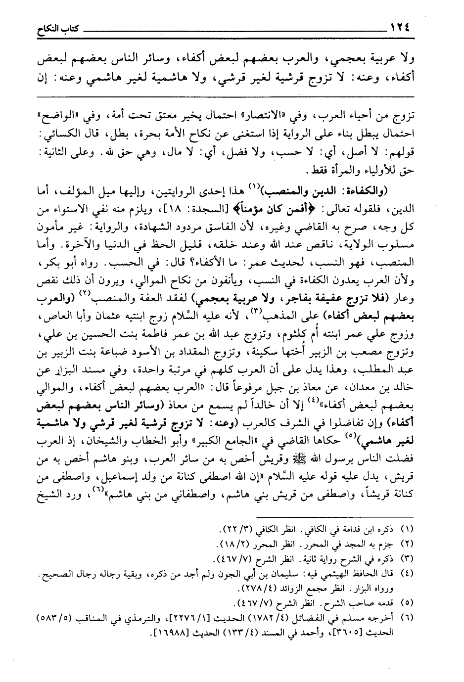 وَلَا عَرَبِيَّةٌ بِعَجَمِيٍّ، وَالْعَرَبُ بَعْضُهُمْ لِبَعْضٍ أَكْفَاءٌ، وَسَائِرُ النَّاسِ بَعْضُهُمْ لِبَعْضٍ أَكْفَاءٌ، وَعَنْهُ: لَا تُزَوَّجُ قُرَشِيَّةٌ لِغَيْرِ قُرَشِيٍّ، وَلَا هَاشِمِيَّةٌ لِغَيْرِ هَاشِمِيٍّ، وَعَنْهُ: أَنَّ