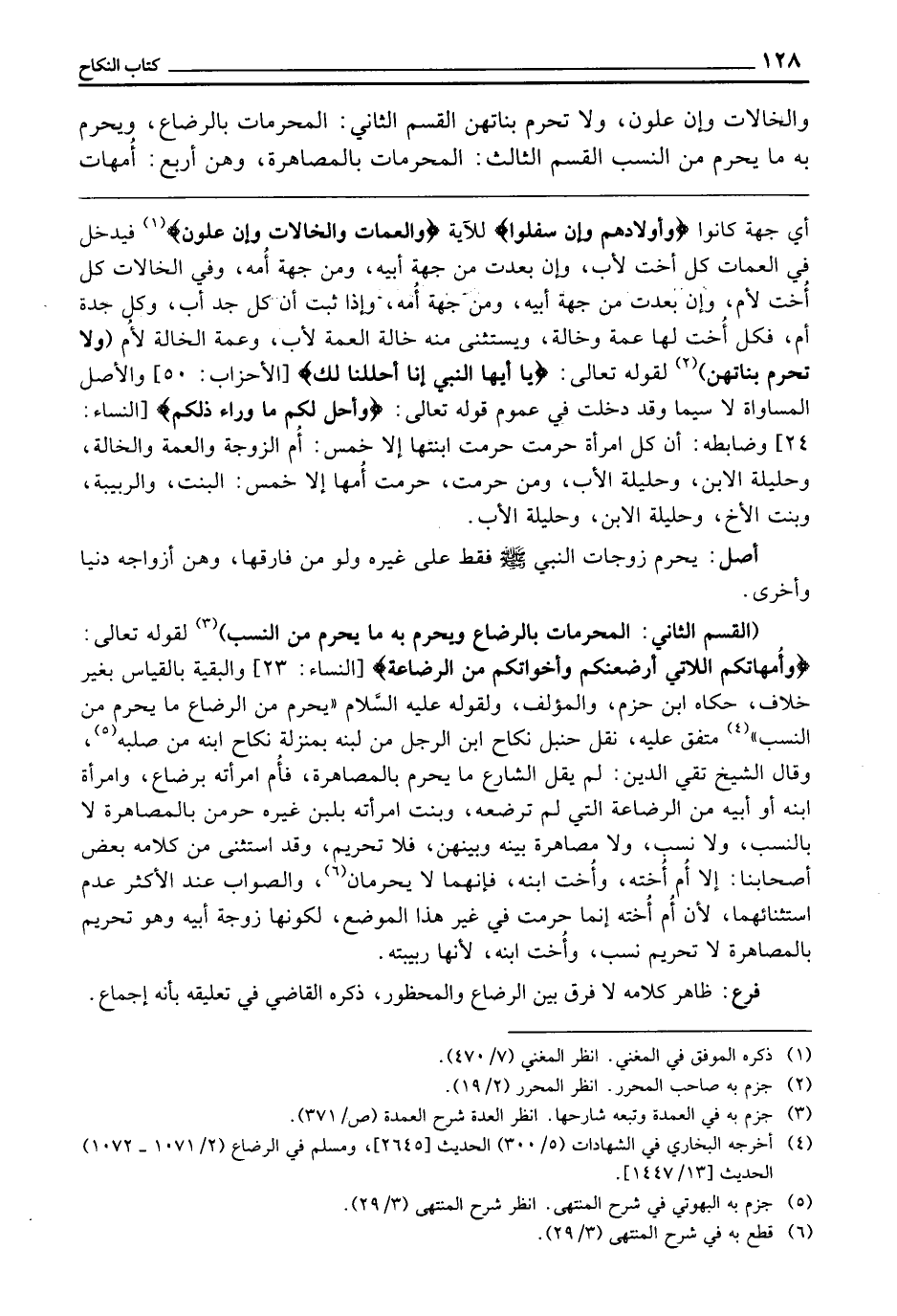 (الْقِسْمُ الثَّانِي: الْمُحَرَّمَاتُ بِالرَّضَاعِ، وَيَحْرُمُ بِهِ مَا يَحْرُمُ مِنَ النَّسَبِ) ; لِقَوْلِهِ تَعَالَى {وَأُمَّهَاتُكُمُ اللاتِي أَرْضَعْنَكُمْ وَأَخَوَاتُكُمْ مِنَ الرَّضَاعَةِ} [النساء: 23] وَالْبَقِيَّةُ بِالْقِيَاسِ بِغَيْرِ خِلَافٍ، حَكَاهُ ابْنُ حَزْمٍ وَالْمُؤَلِّفِ ; وَلِقَوْلِهِ - عَلَيْهِ السَّلَامُ -: «يَحْرُمُ مِنَ الرِّضَاعِ مَا يَحْرُمُ مِنَ النَّسَبِ» مُتَّفَقٌ عَلَيْهِ، نَقَلَ حَنْبَلٌ: نِكَاحُ ابْنِ الرَّجُلِ مِنْ لَبَنِهِ بِمَنْزِلَةِ نِكَاحِ ابْنِهِ مِنْ صُلْبِهِ. وَقَالَ الشَّيْخُ تَقِيُّ الدِّينِ: لَمْ يَقُلِ الشَّارِعُ مَا يَحْرُمُ بِالْمُصَاهَرَةِ، فَأُمُّ امْرَأَتِهِ بِرَضَاعٍ، وَامْرَأَةُ ابْنِهِ أَوْ أَبِيهِ مِنَ الرَّضَاعَةِ الَّتِي لَمْ تُرْضِعْهُ، وَبَنَتُ امْرَأَتِهِ بِلَبَنِ غَيْرِهِ، حُرِّمْنَ بِالْمُصَاهَرَةِ لَا بِالنَّسَبِ، وَلَا نَسَبَ وَلَا مُصَاهَرَةَ بَيْنَهُ وَبَيْنَهُنَّ، فَلَا تَحْرِيمَ، وَقَدِ اسْتَثْنَى مِنْ كَلَامِهِ بَعْضُ أَصْحَابِنَا: إِلَّا أُمَّ أُخْتِهِ وَأُخْتَ ابْنِهِ، فَإِنَّهُمَا لَا يَحْرُمَانِ، وَالصَّوَابُ عِنْدَ الْأَكْثَرِ عَدَمُ اسْتِثْنَائِهِمَا ; لِأَنَّ أُمَّ أُخْتِهِ إِنَّمَا حَرُمَتْ فِي غَيْرِ هَذَا الْمَوْضِعِ ; لِكَوْنِهَا زَوْجَةَ أَبِيهِ، وَهُوَ تَحْرِيمٌ بِالْمُصَاهَرَةِ لَا تَحْرِيمَ نَسَبٍ، وَأُخْتَ ابْنِهِ ; لِأَنَّهَا رَبِيبَتُهُ.