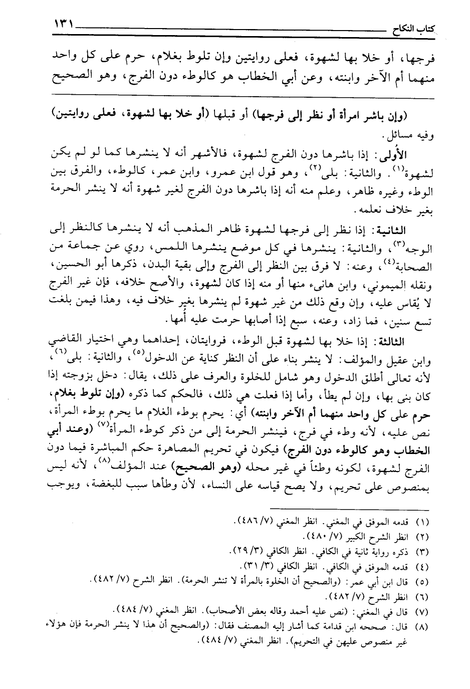 الثَّالِثَةُ: إِذَا خَلَا بِهَا لِشَهْوَةٍ قَبْلَ الْوَطْءِ، فَرِوَايَتَانِ إِحْدَاهُمَا - وَهِيَ اخْتِيَارُ الْقَاضِي، وَابْنِ عَقِيلٍ، وَالْمُؤَلِّفِ -: لَا يَنْشُرُ بِنَاءً عَلَى أَنَّ النَّظَرَ كِنَايَةٌ عَنِ الدُّخُولِ. وَالثَّانِيَةُ: بَلَى ; لِأَنَّهُ تَعَالَى أَطْلَقَ الدُّخُولَ، وَهُوَ شَامِلٌ لِلْخَلْوَةِ، وَالْعُرْفُ عَلَى ذَلِكَ، يُقَالُ: دَخَلَ بِزَوْجَتِهِ، إِذَا كَانَ بَنَى بِهَا وَإِنْ لَمْ يَطَأْ، وَأَمَّا إِذَا فَعَلَتْ هِيَ ذَلِكَ فَالْحُكْمُ كَمَا ذَكَرَهُ (وَإِنْ تَلَوَّطَ بِغُلَامٍ، حَرُمَ عَلَى كُلِّ وَاحِدٍ مِنْهُمَا أُمُّ الْآخَرِ وَابْنَتُهُ) أَيْ: يَحْرُمُ بِوَطْءِ الْغُلَامِ مَا يَحْرُمُ بِوَطْءِ الْمَرْأَةِ، نَصَّ عَلَيْهِ ; لِأَنَّهُ وَطْءٌ فِي فَرْجٍ، فَيَنْشُرُ الْحُرْمَةَ إِلَى مَنْ ذُكِرَ كَوَطْءِ الْمَرْأَةِ (وَعَنْد أَبِي الْخَطَّابِ: هُوَ كَالْوَطْءِ دُونَ الْفَرْجِ) فَيَكُونُ فِي تَحْرِيمِ الْمُصَاهَرَةِ حُكْمُ الْمُبَاشَرَةِ فِيمَا دُونَ الْفَرْجِ لشَهْوَةً ; لِكَوْنِهِ وَطَئا فِي غَيْرِ مَحَلِّهِ (وَهُوَ الصَّحِيحُ) عِنْدَ الْمُؤَلِّفِ ; لِأَنَّهُ لَيْسَ بِمَنْصُوصٍ عَلَى تَحْرِيمٍ، وَلَا يَصِحُّ قِيَاسُهُ عَلَى النِّسَاءِ ; لِأَنَّ وَطْأَهَا سَبَبٌ لِلْبُغْضَةِ، وَيُوجِبُ
