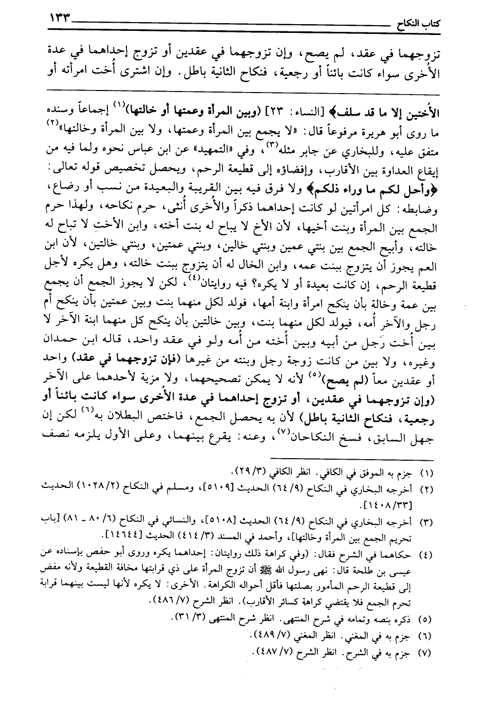 ـــــــــــــــــــــــــــــQ {وَأَنْ تَجْمَعُوا بَيْنَ الأُخْتَيْنِ إِلا مَا قَدْ سَلَفَ} [النساء: 23] (وَبَيْنَ الْمَرْأَةِ وَعَمَّتِهَا أَوْ خَالَتِهَا) إِجْمَاعًا، وَسَنَدُهُ مَا رَوَى أَبُو هُرَيْرَةَ مَرْفُوعًا، قَالَ: «لَا يُجْمَعُ بَيْنَ الْمَرْأَةِ وَعَمَّتِهَا، وَلَا بَيْنَ الْمَرْأَةِ وَخَالَتِهَا» مُتَّفَقٌ عَلَيْهِ، وَلِلْبُخَارِيِّ عَنْ جَابِرٍ مِثْلَهُ، وَفِي " التَّمْهِيدِ " عَنِ ابْنِ عَبَّاسٍ نَحْوَهُ، وَلِمَا فِيهِ مِنْ إِيقَاعِ الْعَدَاوَةِ بَيْنَ الْأَقَارِبِ، وَإِفْضَاؤُهُ إِلَى قَطِيعَةِ الرَّحِمِ، وَيَحْصُلُ تَخْصِيصُ قَوْله تَعَالَى: {وَأُحِلَّ لَكُمْ مَا وَرَاءَ ذَلِكُمْ} [النساء: 24] وَلَا فَرْقَ فِيهِ بَيْنَ الْقَرِيبَةِ وَالْبَعِيدَةِ مِنْ نَسَبٍ أَوْ رَضَاعٍ، وَضَابِطُهُ: كُلُّ امْرَأَتَيْنِ لَوْ كَانَتْ إِحْدَاهُمَا ذَكَرًا وَالْأُخْرَى أُنْثَى حَرُمَ نِكَاحُهُ، وَلِهَذَا حَرُمَ الْجَمْعُ بَيْنَ الْمَرْأَةِ وَبِنْتِ أَخِيهَا ; لِأَنَّ الْأَخَ لَا يُبَاحُ لَهُ بِنْتُ أُخْتِهِ، وَابْنُ الْأُخْتِ لَا تُبَاحُ لَهُ خَالَتُهُ، وَأُبِيحَ الْجَمْعُ بَيْنَ بِنْتَيْ عَمَّيْنِ وَبِنْتَيْ خَالَيْنِ، وَبِنْتَيْ عَمَّتَيْنِ وَبِنْتَيْ خَالَتَيْنِ ; لِأَنَّ ابْنَ الْعَمِّ يَجُوزُ أَنْ يَتَزَوَّجَ بِبِنْتِ عَمِّهِ، وَابْنُ الْخَالِ لَهُ أَنْ يَتَزَوَّجَ بِبِنْتِ خَالَتِهِ، وَهَلْ يُكْرَهُ لِأَجْلِ قَطِيعَةِ الرَّحِمِ إِنْ كَانَتْ بَعِيدَةً أَوْ لَا يُكْرَهُ؟ فِيهِ رِوَايَتَانِ، لَكِنْ لَا يَجُوزُ الْجَمْعُ أَنْ يَجْمَعَ بَيْنَ عَمَّةٍ وَخَالَةٍ، بِأَنْ يَنْكِحَ امْرَأَةً وَابْنُهُ أُمُّهَا، فَوُلِدَ لِكُلٍّ مِنْهُمَا بِنْتٌ، وَبَيْنَ عَمَّتَيْنِ بِأَنْ يَنْكِحَ أُمَّ رَجُلٍ وَالْآخَرُ أُمَّهُ، فَيُولَدُ لِكُلٍّ مِنْهُمَا بِنْتٌ، وَبَيْنَ خَالَتَيْنِ بِأَنْ يَنْكِحَ كُلٌّ مِنْهُمَا ابْنَةَ الْآخَرِ لَا بَيْنَ أُخْتِ رَجُلٍ مِنْ أَبِيهِ وَبَيْنَ أُخْتِهِ مِنْ أُمِّهِ وَلَوْ فِي عَقْدٍ وَاحِدٍ، قَالَهُ ابْنُ حَمْدَانَ وَغَيْرُهُ، وَلَا بَيْنَ مَنْ كَانَتْ زَوْجَةَ رَجُلٍ، وَبِنْتُهُ مِنْ غَيْرِهَا (فَإِنَّ تَزَوَّجَهُمَا فِي عَقْدٍ) وَاحِدٍ أَوْ عَقْدَيْنِ مَعًا (لَمْ يَصِحَّ) ; لِأَنَّهُ لَا يُمْكِنُ تَصْحِيحُهُمَا، وَلَا مَزِيَّةَ لِأَحَدِهِمَا عَلَى الْآخَرِ، (وَإِنْ تَزَوَّجَهُمَا فِي عَقْدَيْنِ، أَوْ تَزَوَّجَ إِحْدَاهُمَا فِي عِدَّةِ الْأُخْرَى سَوَاءٌ كَانَتْ بَائِنًا أَوْ رَجْعِيَّةً، فَنِكَاحُ الثَّانِيَةِ بَاطِلٌ) ; لِأَنَّ بِهِ يَحْصُلُ الْجَمْعُ، فَاخْتَصَّ الْبُطْلَانُ بِهِ، لَكِنْ إِنْ جُهِلَ السَّابِقُ فُسِخَ النِّكَاحَانِ، وَعَنْهُ: يُقْرَعُ بَيْنَهُمَا، وَعَلَى الْأَوَّلِ يَلْزَمُهُ نِصْفُ