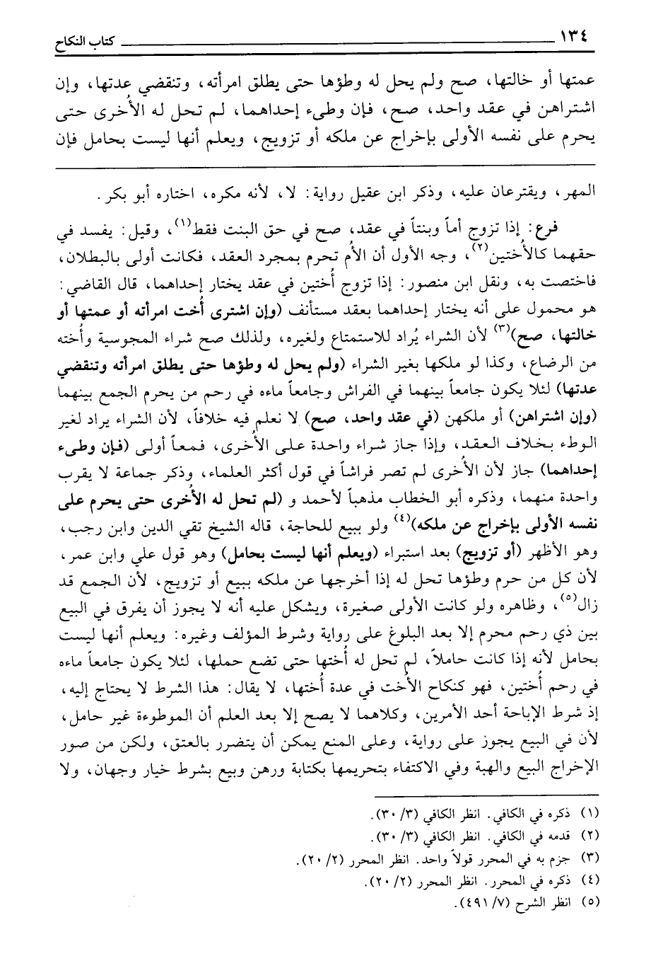 فَرْعٌ: إِذَا تَزَوَّجَ أُمًّا وَبِنْتًا فِي عَقْدٍ، صَحَّ فِي حَقِّ الْبِنْتِ فَقَطْ، وَقِيلَ: يَفْسُدُ فِي حَقِّهِمَا كَالْأُخْتَيْنِ، وَجْهُ الْأَوَّلِ أَنَّ الْأُمَّ تَحْرُمُ بِمُجَرَّدِ الْعَقْدِ، فَكَانَتْ أَوْلَى بِالْبُطْلَانِ، فَاخْتَصَّتْ بِهِ، وَنَقَلَ ابْنُ مَنْصُورٍ: إِذَا تَزَوَّجَ أُخْتَيْنِ فِي عَقْدٍ، يَخْتَارُ إِحْدَاهُمَا، قَالَ الْقَاضِي: هُوَ مَحْمُولٌ عَلَى أَنَّهُ يَخْتَارُ إِحْدَاهُمَا بِعَقْدٍ مُسْتَأْنَفٍ (وَإِنِ اشْتَرَى أُخْتَ امْرَأَتِهِ أَوْ عَمَّتَهَا أَوْ خَالَتَهَا، صَحَّ) ; لِأَنَّ الشِّرَاءَ يُرَادُ لِلِاسْتِمْتَاعِ وَلِغَيْرِهِ، وَلِذَلِكَ صَحَّ شِرَاءُ الْمَجُوسِيَّةِ وَأُخْتِهِ مِنَ الرَّضَاعِ، وَكَذَا لَوْ مَلَكَهَا بِغَيْرِ الشِّرَاءِ (وَلَمْ يَحِلَّ له وَطْؤُهَا حَتَّى يُطَلِّقَ امْرَأَتَهُ وَتَنْقَضِيَ عِدَّتُهَا) ; لِئَلَّا يَكُونَ جَامِعًا بَيْنَهُمَا فِي الْفِرَاشِ وَجَامِعًا مَاءَهُ فِي رَحِمِ مَنْ يَحْرُمُ الْجَمْعُ بَيْنَهُمَا (وَإِنِ اشْتَرَاهُنَّ) أَوْ مَلَكَهُنَّ (فِي عَقْدٍ وَاحِدٍ، صَحَّ) لَا نَعْلَمُ فِيهِ خِلَافًا ; لِأَنَّ الشِّرَاءَ يُرَادُ لِغَيْرِ الْوَطْءِ بِخِلَافِ الْعَقْدِ، وَإِذَا جَازَ شِرَاءُ وَاحِدَةٍ عَلَى الْأُخْرَى، فَمَعًا أَوْلَى (فَإِنْ وَطِئَ إِحْدَاهُمَا) جَازَ ; لِأَنَّ الْأُخْرَى لَمْ تَصِرْ فِرَاشًا فِي قَوْلِ أَكْثَرِ الْعُلَمَاءِ، وَذَكَرَ جَمَاعَةٌ: لَا يَقْرُبُ وَاحِدَةً مِنْهُمَا، وَذَكَرَهُ أَبُو الْخَطَّابِ مَذْهَبًا لِأَحْمَدَ و (لَمْ تَحِلَّ لَهُ الْأُخْرَى حَتَّى يُحَرِّمَ عَلَى نَفْسِهِ الْأُولَى بِإِخْرَاجٍ عَنْ مِلْكِهِ) وَلَوْ بِبَيْعٍ لِلْحَاجَةِ، قَالَهُ الشَّيْخُ تَقِيُّ الدِّينِ، وَابْنُ رَجَبٍ، وَهُوَ الْأَظْهَرُ (أَوْ تَزْوِيجٍ) بَعْدَ اسْتِبْرَاءٍ (وَيَعْلَمَ أَنَّهَا لَيْسَتْ بِحَامِلٍ) وَهُوَ قَوْلُ عَلِيٍّ وَابْنِ عُمَرَ ; لِأَنَّ كُلَّ مَنْ حَرُمَ وَطْؤُهَا تَحِلُّ لَهُ إِذَا أَخْرَجَهَا عَنْ مِلْكِهِ بِبَيْعٍ أَوْ تَزْوِيجٍ ; لِأَنَّ الْجَمْعَ قَدْ زَالَ، وَظَاهِرُهُ: وَلَوْ كَانَتِ الْأُولَى صَغِيرَةً، وَيَشْكُلُ عَلَيْهِ أَنَّهُ لَا يَجُوزُ أَنْ يُفَرِّقَ فِي الْبَيْعِ بَيْنَ ذِي رَحِمٍ مُحَرَّمٍ إِلَّا بَعْدَ الْبُلُوغِ عَلَى رِوَايَةٍ، وَشَرَطَ الْمُؤَلِّفُ وَغَيْرُهُ: (وَيَعْلَمَ أَنَّهَا لَيْسَتْ بِحَامِلٍ) ; لِأَنَّهُ إِذَا كَانَتْ حَامِلًا لَمْ تَحِلَّ لَهُ أُخْتُهَا حَتَّى تَضَعَ حَمْلَهَا ; لِئَلَّا يَكُونَ جَامِعًا مَاءَهُ فِي رَحِمِ أُخْتَيْنِ، فَهُوَ كَنِكَاحِ الْأُخْتِ فِي عِدَّةِ أُخْتِهَا، لَا يُقَالُ: هَذَا الشَّرْطُ لَا يُحْتَاجُ إِلَيْهِ، إِذْ شَرْطُ الْإِبَاحَةِ أَحَدُ الْأَمْرَيْنِ، وَكِلَاهُمَا لَا يَصِحُّ إِلَّا بَعْدَ الْعِلْمِ أَنَّ الْمَوْطُوءَةَ غَيْرُ حَامِلٍ ; لِأَنَّ فِي الْبَيْعِ يَجُوزُ عَلَى رِوَايَةٍ، وَعَلَى الْمَنْعِ يُمْكِنُ أَنْ يَتَضَرَّرَ بِالْعِتْقِ، وَلَكِنْ مِنْ صُوَرِ الْإِخْرَاجِ الْبَيْعُ وَالْهِبَةُ، وَفِي الِاكْتِفَاءِ بِتَحْرِيمِهَا بِكِتَابَةٍ وَرَهْنٍ وَبَيْعٍ بِشَرْطِ خِيَارٍ وَجْهَانِ، وَلَا