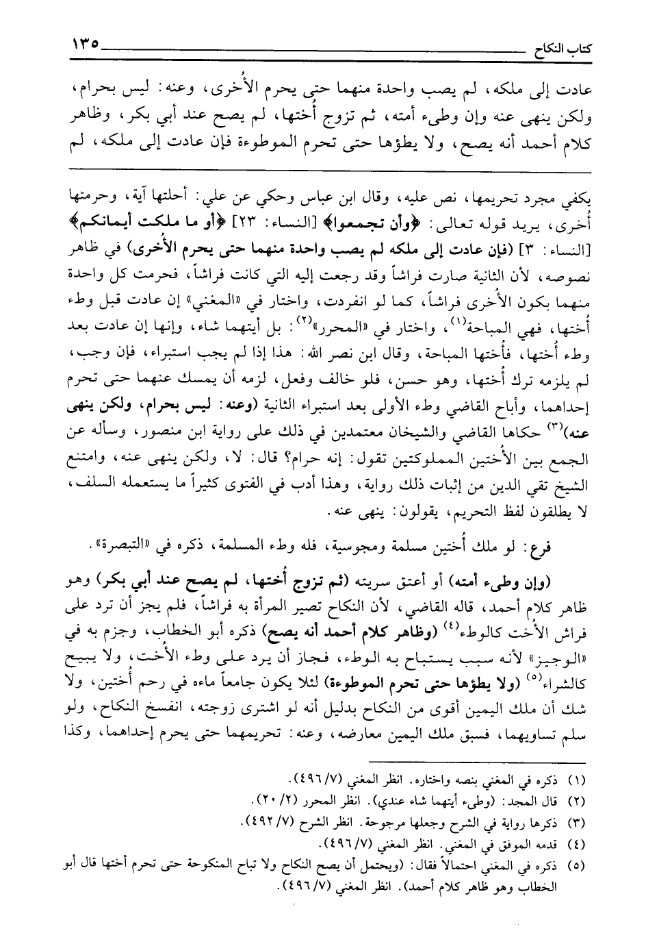 ـــــــــــــــــــــــــــــQيَكْفِي مُجَرَّدُ تَحْرِيمِهَا، نَصَّ عَلَيْهِ، وَقَالَ ابْنُ عَبَّاسٍ - وَحُكِيَ عَنْ عَلِيٍّ -: أَحَلَّتْهَا آيَةٌ، وَحَرَّمَتْهَا أُخْرَى، يُرِيدُ قَوْله تَعَالَى: {وَأَنْ تَجْمَعُوا} [النساء: 23] {أَوْ مَا مَلَكَتْ أَيْمَانُكُمْ} [النساء: 3] (فَإِنْ عَادَتْ إِلَى مِلْكِهِ لَمْ يُصِبْ وَاحِدَةً مِنْهُمَا حَتَّى يُحَرِّمَ الْأُخْرَى) فِي ظَاهِرِ نُصُوصِهِ ; لِأَنَّ الثَّانِيَةَ صَارَتْ فِرَاشًا، وَقَدْ رَجَعَتْ إِلَيْهِ الَّتِي كَانَتْ فِرَاشًا، فَحَرُمَتْ كُلُّ وَاحِدَةٍ مِنْهُمَا بِكَوْنِ الْأُخْرَى فِرَاشًا، كَمَا لَوِ انْفَرَدَتْ، وَاخْتَارَ فِي " الْمُغْنِي ": إِنْ عَادَتْ قَبْلَ وَطْءِ أُخْتِهَا فَهِيَ الْمُبَاحَةُ، وَاخْتَارَ فِي " الْمُحَرَّرِ ": بَلْ أَيَّتَهُمَا شَاءَ، وَأَنَّهَا إِنْ عَادَتْ بَعْدَ وَطْءِ أُخْتِهَا فَأُخْتُهَا الْمُبَاحَةُ، وَقَالَ ابْنُ نَصْرِ اللَّهِ: هَذَا إِذَا لَمْ يَجِبِ اسْتِبْرَاءٌ، فَإِنْ وَجَبَ لَمْ يَلْزَمْهُ تَرْكُ أُخْتِهَا، وَهُوَ حَسَنٌ، فَلَوْ خَالَفَ وَفَعَلَ لَزِمَهُ أَنْ يُمْسِكَ عَنْهُمَا حَتَّى تَحْرُمَ إِحْدَاهُمَا، وَأَبَاحَ الْقَاضِي وَطْءَ الْأُولَى بَعْدَ اسْتِبْرَاءِ الثَّانِيَةِ (وَعَنْهُ: لَيْسَ بِحَرَامٍ، وَلَكِنْ يُنْهَى عَنْهُ) حَكَاهَا الْقَاضِي وَالشَّيْخَانِ مُعْتَمِدِينَ فِي ذَلِكَ عَلَى رِوَايَةِ ابْنِ مَنْصُورٍ، وَسَأَلَهُ عَنِ الْجَمْعِ بَيْنَ الْأُخْتَيْنِ الْمَمْلُوكَتَيْنِ تَقُولُ: إِنَّهُ حَرَامٌ؟ قَالَ: لَا، وَلَكِنْ يُنْهَى عَنْهُ، وَامْتَنَعَ الشَّيْخُ تَقِيُّ الدِّينِ مِنْ إِثْبَاتِ ذَلِكَ رِوَايَةً، وَهَذَا أَدَبٌ فِي الْفَتْوَى، كَثِيرًا مَا يَسْتَعْمِلُهُ السَّلَفُ، لَا يُطْلِقُونَ لَفْظَ التَّحْرِيمِ، يَقُولُونَ: يُنْهَى عَنْهُ.