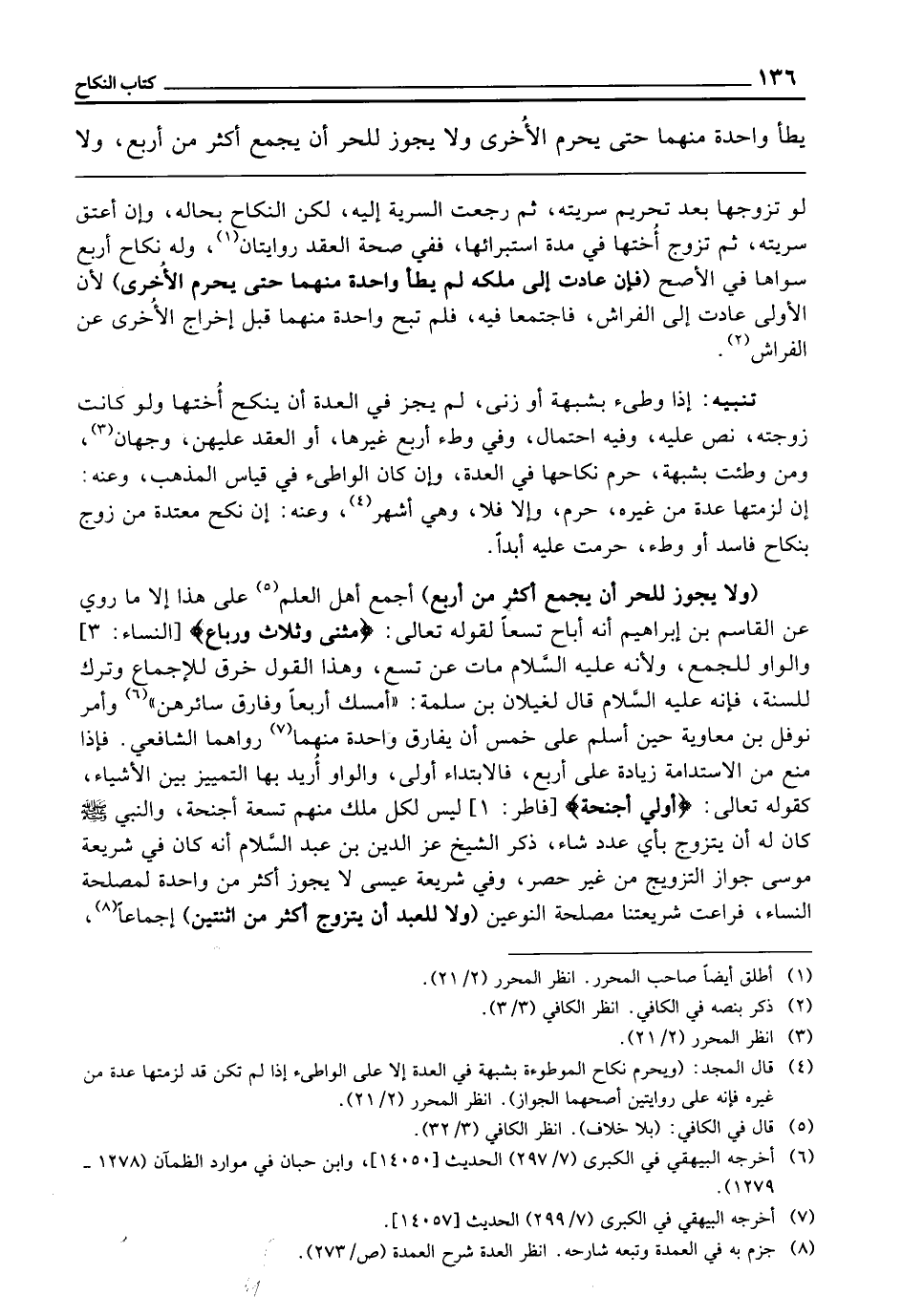 (وَلَا يَجُوزُ لِلْحُرِّ أَنْ يَجْمَعَ أَكْثَرَ مِنْ أَرْبَعٍ) أَجْمَعَ أَهْلُ الْعِلْمِ عَلَى هَذَا، إِلَّا مَا رُوِيَ عَنِ الْقَاسِمِ بْنِ إِبْرَاهِيمَ أَنَّهُ أَبَاحَ تِسْعًا لِقَوْلِهِ: {مَثْنَى وَثُلاثَ وَرُبَاعَ} [النساء: 3] وَالْوَاوُ لِلْجَمْعِ ; وَلِأَنَّهُ - عَلَيْهِ السَّلَامُ - مَاتَ عَنْ تِسْعٍ، وَهَذَا الْقَوْلُ خَرْقٌ لِلْإِجْمَاعِ وَتَرْكٌ لِلسُّنَّةِ، فَإِنَّهُ «- عَلَيْهِ السَّلَامُ - قَالَ لِغَيْلَانَ بْنِ سَلَمَةَ: أَمْسِكْ أَرْبَعًا وَفَارِقْ سَائِرَهُنَّ» وَأَمَرَ نَوْفَلَ بْنَ مُعَاوِيَةَ حِينَ أَسْلَمَ عَلَى خَمْسٍ أَنْ يُفَارِقَ وَاحِدَةً مِنْهَن، رَوَاهُمَا الشَّافِعِيُّ. فَإِذَا مُنِعَ مِنَ الِاسْتِدَامَةِ زِيَادَةً عَلَى أَرْبَعٍ فَالِابْتِدَاءُ أَوْلَى، وَالْوَاوُ أُرِيدَ بِهَا التَّمْيِيزُ بَيْنَ الْأَشْيَاءِ، كَقَوْلِهِ تَعَالَى: {أُولِي أَجْنِحَةٍ} [فاطر: 1] الْآيَةَ، لَيْسَ لِكُلِّ مَلَكٍ مِنْهُمْ تِسْعَةٌ، وَالنَّبِيُّ - صَلَّى اللَّهُ عَلَيْهِ وَسَلَّمَ - كَانَ لَهُ أَنْ يَتَزَوَّجَ بِأَيِّ عَدَدٍ شَاءَ، ذَكَرَ الشَّيْخُ عِزُّ الدِّينِ بْنُ عَبْدِ السَّلَامِ أَنَّهُ كَانَ فِي شَرِيعَةِ مُوسَى جَوَازُ التَّزْوِيجِ مِنْ غَيْرِ حَصْرٍ، وَفِي شَرِيعَةِ عِيسَى لَا يَجُوزُ أَكْثَرُ مِنْ وَاحِدَةٍ ; لِمَصْلَحَةِ النِّسَاءِ، فَرَاعَتْ شَرِيعَتُنَا مَصْلَحَةَ النَّوْعَيْنِ (وَلَا لِلْعَبْدِ أَنْ يَتَزَوَّجَ أَكْثَرَ مِنَ اثْنَتَيْنِ) إِجْمَاعًا،
