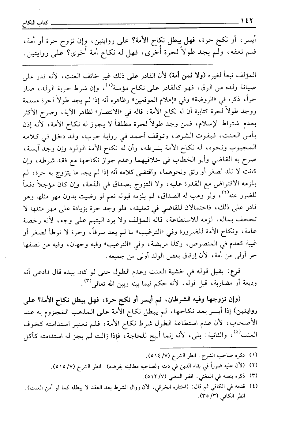 ـــــــــــــــــــــــــــــQالْمُؤَلِّفُ تَبَعًا لِغَيْرِهِ (وَلَا ثَمَنَ أَمَةٍ) ; لِأَنَّ الْقَادِرَ عَلَى ذَلِكَ غَيْرُ خَائِفٍ الْعَنَتَ ; لِأَنَّهُ قَدَرَ عَلَى صِيَانَةِ وَلَدِهِ مِنَ الرِّقِّ، فَهُوَ كَالْقَادِرِ عَلَى نِكَاحِ مُؤْمِنَةٍ، وَإِنْ شَرَطَ حُرِّيَّةَ الْوَلَدِ صَارَ حُرًّا، ذَكَرَهُ فِي " الرَّوْضَةِ " وَفِي " إِعْلَامِ الْمُوَقِّعِينَ "، وَظَاهِرُهُ: أَنَّهُ إِذَا لَمْ يَجِدْ طَوْلًا لِحُرَّةٍ مُسْلِمَةٍ وَوَجَدَ طَوْلًا لِحُرَّةٍ كِتَابِيَّةٍ - أَنَّ لَهُ نِكَاحَ الْأَمَةِ، قَالَهُ فِي " الِانْتِصَارِ " ; لِظَاهِرِ الْآيَةِ، وَصَرَّحَ الْأَكْثَرُ بِعَدَمِ اشْتِرَاطِ الْإِسْلَامِ، فَمَنْ وَجَدَ طَوْلًا لِحُرَّةٍ مُطْلَقًا لَا يَجُوزُ لَهُ نِكَاحُ الْأَمَةِ ; لِأَنَّهُ إِذَنْ يَأْمَنُ الْعَنَتَ، فَيَفُوتُ الشَّرْطُ، وَتَوَقَّفَ أَحْمَدُ فِي رِوَايَةِ حَرْبٍ، وَقَدْ دَخَلَ فِي كَلَامِهِ الْمَجْبُوبُ وَنَحْوُهُ، لَهُ نِكَاحُ الْأَمَةِ بِشَرْطِهِ، وَأَنَّ لَهُ نِكَاحَ الْأَمَةِ الْوَلُودِ، وَإِنْ وَجَدَ آيِسَةً، صَرَّحَ بِهِ الْقَاضِي وَأَبُو الْخَطَّابِ فِي خِلَافَيْهِمَا وَعَدَمِ جَوَازِ نِكَاحِهَا مَعَ فَقْدِ شَرْطِهِ، وَإِنْ كَانَتْ لَا تَلِدُ لِصِغَرٍ أَوْ رَتْقٍ وَنَحْوِهِمَا، وَاقْتَضَى كَلَامُهُ أَنَّهُ إِذَا لَمْ يَجِدْ مَا يَتَزَوَّجُ بِهِ حُرَّةً لَمْ يَلْزَمْهُ الِاقْتِرَاضُ مَعَ الْقُدْرَةِ عَلَيْهِ، وَلَا التَّزَوُّجُ بِصَدَاقٍ فِي الذِّمَّةِ وَإِنْ كَانَ مُؤَجَّلًا ; دَفْعًا لِلضَّرَرِ عَنْهُ، وَلَوْ وَهَبَ لَهُ الصَّدَاقَ لَمْ يَلْزَمْهُ قَبُولُهُ، نَعَمْ، لَوْ رَضِيَتْ بِدُونِ مَهْرِ مِثْلِهَا وَهُوَ قَادِرٌ عَلَى ذَلِكَ فَاحْتِمَالَانِ لِلْقَاضِي فِي " تَعْلِيقِهِ " فَلَوْ وَجَدَ حُرَّةً بِزِيَادَةٍ عَلَى مَهْرِ مِثْلِهَا لَا تُجْحِفُ بِمَالِهِ لَزِمَهُ لِلِاسْتِطَاعَةِ، قَالَهُ الْمُؤَلِّفُ، وَلَا يُرَدُّ الْيَتِيمُ عَلَى وَجْهٍ ; لِأَنَّهُ رُخْصَةٌ عَامَّةٌ، وَنِكَاحُ الْأَمَةِ لِلضَّرُورَةِ وَفِي " التَّرْغِيبِ ": مَا لَمْ يَعُدْ سَرَفًا، وَحُرَّةٌ لَا تُوطَأُ لِصِغَرٍ أَوْ غَيْبَةٍ كَعَدَمٍ، فِي الْمَنْصُوصِ، وَكَذَا مَرِيضَةٌ، وَفِي " التَّرْغِيبِ " وَفِيهِ وَجْهَانِ، وَفِيهِ مَنْ نِصْفُهَا حُرٌّ أَوْلَى مِنْ أَمَةٍ ; لِأَنَّ إِرْقَاقَ بَعْضِ الْوَلَدِ أَوْلَى مِنْ جَمِيعِهِ.
