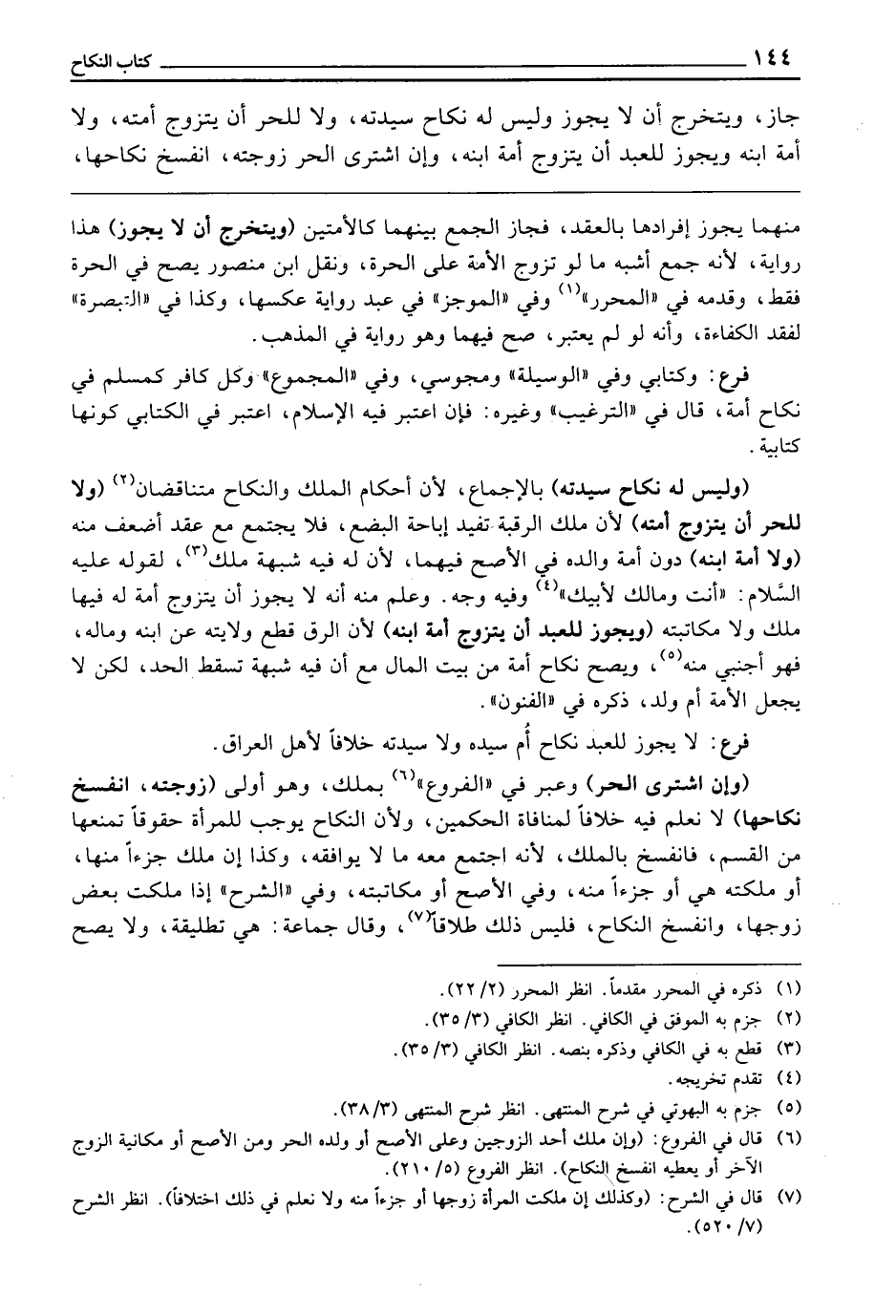 ـــــــــــــــــــــــــــــQمِنْهُمَا يَجُوزُ إِفْرَادُهَا بِالْعَقْدِ، فَجَازَ الْجَمْعُ بَيْنَهُمَا كَالْأَمَتَيْنِ (وَيَتَخَرَّجُ أَنْ لَا يَجُوزَ) هَذَا رِوَايَةٌ ; لِأَنَّهُ جَمَعَ، أَشْبَهَ مَا لَوْ تَزَوَّجَ الْأَمَةَ عَلَى الْحُرَّةِ، وَنَقَلَ ابْنُ مَنْصُورٍ: يَصِحُّ فِي الْحُرَّةِ فَقَطْ، وَقَدَّمَهُ فِي " الْمُحَرَّرِ " وَفِي " الْمُوجَزِ ": فِي عَبْدٍ، رِوَايَةٌ عَكْسُهَا، وَكَذَا فِي " التَّبْصِرَةِ " ; لِفَقْدِ الْكَفَاءَةِ، وَأَنَّهُ لَوْ لَمْ يُعْتَبَرْ، صَحَّ فِيهِمَا وَهُوَ رِوَايَةٌ فِي الْمَذْهَبِ.