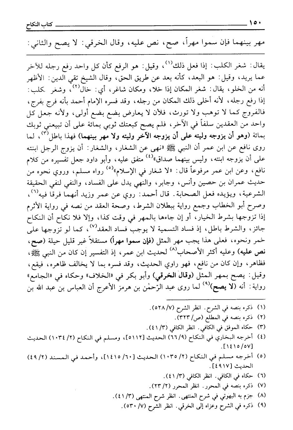 ـــــــــــــــــــــــــــــQيُقَالُ: شَغَرَ الْكَلْبُ، إِذَا فَعَلَ ذَلِكَ، وَقِيلَ: هُوَ الرَّفْعُ، كَأَنَّ كُلَّ وَاحِدٍ رَفَعَ رِجْلَهُ لِلْآخَرِ عَمَّا يُرِيدُ، وَقِيلَ: هُوَ الْبُعْدُ، كَأَنَّهُ بَعُدَ عَنْ طَرِيقِ الْحَقِّ، وَقَالَ الشَّيْخُ تَقِيُّ الدِّينِ: الْأَظْهَرُ أَنَّهُ مِنَ الْخُلُوِّ، يُقَالُ: شَغَرَ الْمَكَانُ إِذَا خَلَا، وَمَكَانٌ شَاغِرٌ: أَيْ: خَالٍ، وَشَغَرَ الْكَلْبُ: إِذَا رَفَعَ رِجْلَهُ ; لِأَنَّهُ أَخْلَى ذَلِكَ الْمَكَانَ مِنْ رِجْلِهِ، وَقَدْ فَسَّرَهُ الْإِمَامُ أَحْمَدُ بِأَنَّهُ فَرْجٌ بِفَرْجٍ، فَالْفُرُوجُ كَمَا لَا تُوهَبُ وَلَا تُورَثُ، فَلِأَنْ لَا يُعَارَضَ بُضْعٌ بِبُضْعٍ أَوْلَى ; وَلِأَنَّهُ جَعَلَ كُلَّ وَاحِدٍ مِنَ الْعَقْدَيْنِ سَلَفًا فِي الْآخَرِ، فَلَمْ يَصِحَّ، كَبِعْتُكَ ثَوْبِي بِمِائَةٍ عَلَى أَنْ تَبِيعَنِي ثَوْبَكَ بِمِائَةٍ، (وَهُوَ أَنْ يُزَوِّجَهُ وَلِيَّتَهُ عَلَى أَنْ يُزَوِّجَهُ الْآخَرُ وَلِيَّتَهُ وَلَا مَهْرَ بَيْنَهُمَا) فَهَذَا بَاطِلٌ ; لِمَا رَوَى نَافِعٌ، عَنِ ابْنِ عُمَرَ «أَنَّ النَّبِيَّ - صَلَّى اللَّهُ عَلَيْهِ وَسَلَّمَ - نَهَى عَنِ الشِّغَارِ» ، وَالشِّغَارُ: أَنْ يُزَوِّجَ الرَّجُلُ ابْنَتَهُ عَلَى أَنْ يُزَوِّجَهُ ابْنَتَهُ وَلَيْسَ بَيْنَهُمَا صَدَاقٌ مُتَّفَقٌ عَلَيْهِ، وَأَبُو دَاوُدَ جَعَلَ تَفْسِيرَهُ مِنْ كَلَامِ نَافِعٍ، وَعَنِ ابْنِ عُمَرَ مَرْفُوعًا، قَالَ: «لَا شِغَارَ فِي الْإِسْلَامِ» رَوَاهُ مُسْلِمٌ، وَرُوِيَ نَحْوُهُ مِنْ حَدِيثِ عِمْرَانَ بْنِ حُصَيْنٍ، وَأَنَسٍ، وَجَابِرٍ، وَالنَّهْيُ يَدُلُّ عَلَى الْفَسَادِ، وَالنَّفْيُ لِنَفْيِ الْحَقِيقَةِ الشَّرْعِيَّةِ ; وَيُؤَيِّدُهُ فِعْلُ الصَّحَابَةِ. قَالَ أَحْمَدُ: رُوِيَ عَنْ عُمَرَ وَزَيْدٍ أَنَّهُمَا فَرَّقَا فِيهِ، وَصَرَّحَ أَبُو الْخَطَّابِ وَجَمَعَ - رِوَايَةً بِبُطْلَانِ الشَّرْطِ، وَصِحَّةِ الْعَقْدِ مِنْ نَصِّهِ فِي رِوَايَةِ الْأَثْرَمِ إِذَا تَزَوَّجَهَا بِشَرْطِ الْخِيَارِ، أَوْ إِنْ جَاءَهَا بِالْمَهْرِ فِي وَقْتِ كَذَا، وَإِلَّا فَلَا نِكَاحَ أَنَّ النِّكَاحَ جَائِزٌ، والشَّرْطُ بَاطِلٌ ; إِذْ فَسَادُ التَّسْمِيَةِ لَا يُوجِبُ فَسَادَ الْعَقْدِ، كَمَا لَوْ تَزَوَّجَهَا عَلَى خَمْرٍ وَنَحْوِهِ، فَعَلَى هَذَا يَجِبُ مَهْرُ الْمِثْلِ (فَإِنْ سَمُّوا مَهْرًا) مُسْتَقِلًّا غَيْرَ قَلِيلٍ حِيلَةً (صَحَّ، نَصَّ عَلَيْهِ) وَعَلَيْهِ أَكْثَرُ الْأَصْحَابِ ; لِحَدِيثِ ابْنِ عُمَرَ إِذِ التَّفْسِيرُ إِنْ كَانَ مِنَ النَّبِيِّ - صَلَّى اللَّهُ عَلَيْهِ وَسَلَّمَ - فَظَاهِرٌ، وَإِنْ كَانَ مِنْ نَافِعٍ فَهُوَ رَاوِي الْحَدِيثِ بِمَا لَا يُخَالِفُ ظَاهِرَهُ، فَيَقَعُ، وَقِيلَ: يَصِحُّ بِمَهْرِ الْمِثْلِ (وَقَالَ الْخِرَقِيُّ) وَأَبُو بَكْرٍ فِي " الْخِلَافِ "، وَحَكَاهُ فِي " الْجَامِعِ " رِوَايَةً: أنَّهُ (لَا يَصِحُّ) ; لِمَا رَوَى عَبْدُ الرَّحْمَنِ بْنُ هُرْمُزَ الْأَعْرَجُ أَنَّ الْعَبَّاسَ بْنَ عَبْدِ اللَّهِ بْنِ
