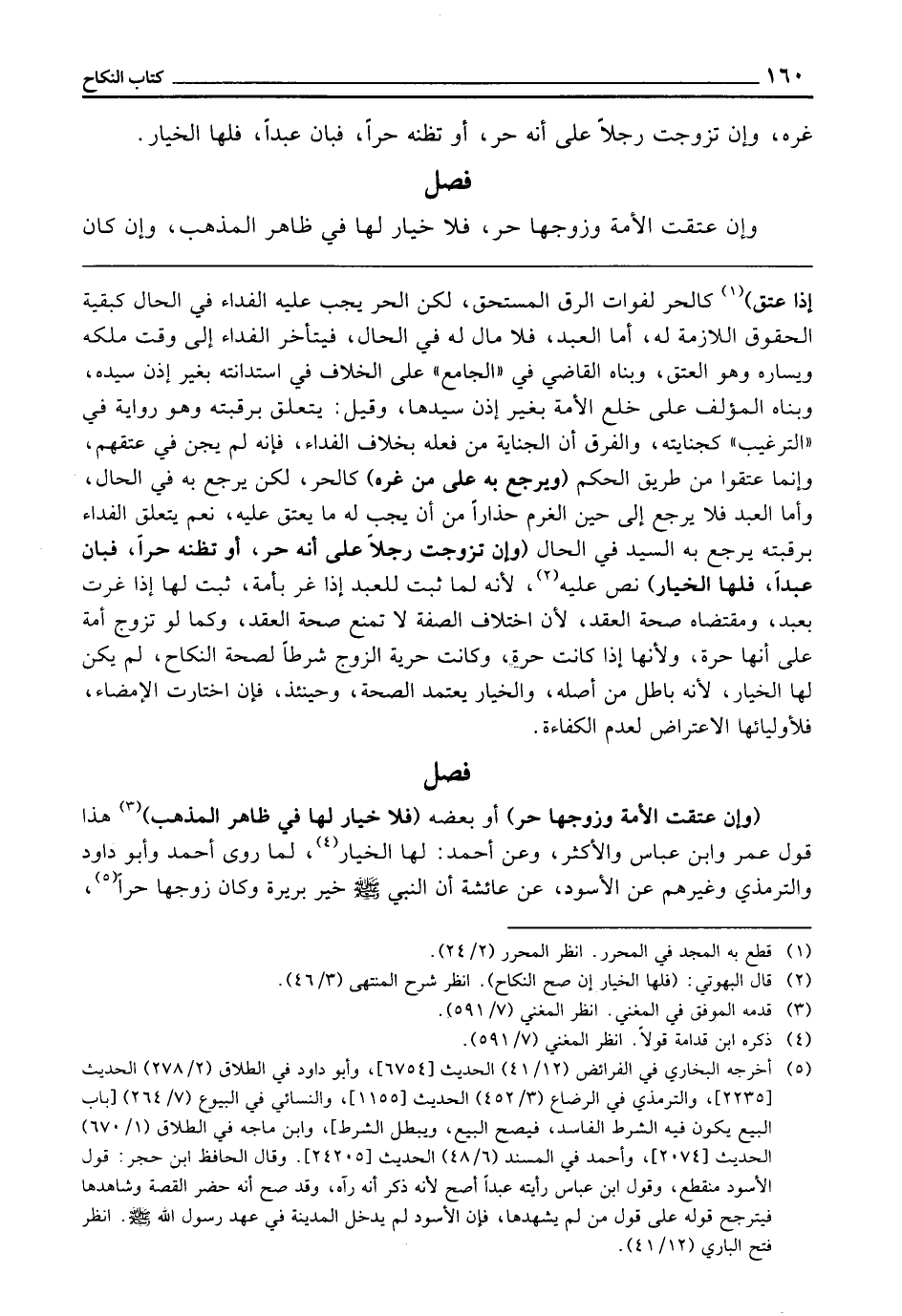 فَصْلٌ (وَإِنْ عُتِقَتِ الْأَمَةُ وَزَوْجُهَا حُرٌّ) أَوْ بَعْضُهُ (فَلَا خِيَارَ لَهَا فِي ظَاهِرِ الْمَذْهَبِ) هَذَا قَوْلُ عُمَرَ، وَابْنِ عَبَّاسٍ، وَالْأَكْثَرِ، وَعَنْ أَحْمَدَ: لَهَا الْخِيَارُ ; لِمَا رَوَى أَحْمَدُ، وَأَبُو دَاوُدَ، وَالتِّرْمِذِيُّ، وَغَيْرُهُمْ، عَنِ الْأَسْوَدِ، عَنْ عَائِشَةَ «أَنَّ النَّبِيَّ - صَلَّى اللَّهُ عَلَيْهِ وَسَلَّمَ - خَيَّرَ بَرِيرَةَ، وَكَانَ زَوْجُهَا حُرًّا