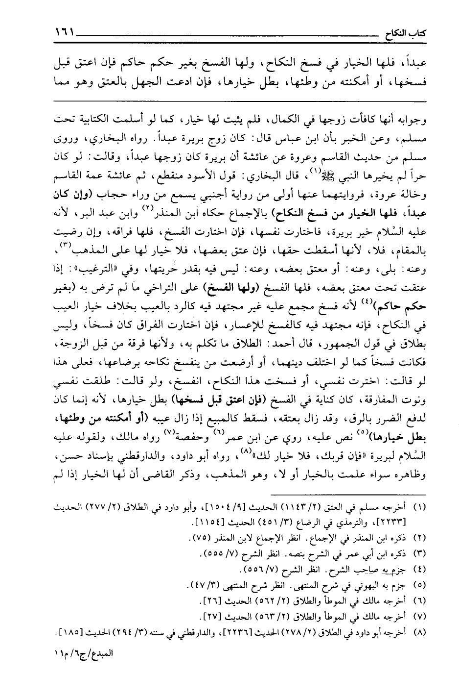 ـــــــــــــــــــــــــــــQ» وَجَوَابُهُ أَنَّهَا كَافَأَتْ زَوْجَهَا فِي الْكَمَالِ، فَلَمْ يَثْبُتْ لَهَا خِيَارٌ، كَمَا لَوْ أَسْلَمَتِ الْكِتَابِيَّةُ تَحْتَ مُسْلِمٍ، وَعَنِ الْخَبَرِ بِأَنَّ ابْنَ عَبَّاسٍ قَالَ: كَانَ زَوْجُ بَرِيرَةَ عَبْدًا - رَوَاهُ الْبُخَارِيُّ، وَرَوَى مُسْلِمٌ مِنْ حَدِيثِ الْقَاسِمِ وَعُرْوَةَ، عَنْ عَائِشَةَ «أَنَّ بَرِيرَةَ كَانَ زَوْجُهَا عَبْدًا، وَقَالَتْ: لَوْ كَانَ حُرًّا لَمْ يُخَيِّرْهَا النَّبِيُّ - صَلَّى اللَّهُ عَلَيْهِ وَسَلَّمَ -» قَالَ الْبُخَارِيُّ: قَوْلُ الْأَسْوَدِ مُنْقَطِعٌ، ثُمَّ عَائِشَةُ عَمَّةُ الْقَاسِمِ وَخَالَةُ عُرْوَةَ، فَرِوَايَتُهُمَا عَنْهَا أَوْلَى مِنْ رِوَايَةِ أَجْنَبِيٍّ يَسْمَعُ مِنْ وَرَاءِ حِجَابٍ (وَإِنْ كَانَ عَبْدًا، فَلَهَا الْخِيَارُ مِنْ فَسْخِ النِّكَاحِ) بِالْإِجْمَاعِ، حَكَاهُ ابْنُ الْمُنْذِرِ وَابْنُ عَبْدِ الْبَرِّ ; لِأَنَّهُ - عَلَيْهِ السَّلَامُ - خَيَّرَ بَرِيرَةَ فَاخْتَارَتْ نَفْسَهَا، فَإِنِ اخْتَارَتِ الْفَسْخَ فَلَهَا فِرَاقُهُ، وَإِنْ رَضِيَتْ بِالْمُقَامِ فَلَا ; لِأَنَّهَا أَسْقَطَتْ حَقَّهَا، فَإِنْ عُتِقَ بَعْضُهَا، فَلَا خِيَارَ لَهَا عَلَى الْمَذْهَبِ، وَعَنْهُ: بَلَى، وَعَنْهُ: أَوْ مُعْتَقٌ بَعْضُهُ، وَعَنْهُ: لَيْسَ فِيهِ بِقَدْرِ حُرِّيَّتِهَا، وَفِي " التَّرْغِيبِ ": إِذَا عُتِقَتْ تَحْتَ مُعْتَقٍ بَعْضُهُ، فَلَهَا الْفَسْخُ (وَلَهَا الْفَسْخُ) عَلَى التَّرَاخِي مَا لَمْ تَرْضَ بِهِ (بِغَيْرِ حُكْمِ حَاكِمٍ) ; لِأَنَّهُ فَسْخٌ مُجْمَعٌ عَلَيْهِ غَيْرُ مُجْتَهَدٍ فِيهِ كَالرَّدِّ بِالْعَيْبِ، بِخِلَافِ خِيَارِ الْعَيْبِ فِي النِّكَاحِ، فَإِنَّهُ مُجْتَهَدٌ فِيهِ كَالْفَسْخِ لِلْإِعْسَارِ، فَإِنِ اخْتَارَتِ الْفِرَاقَ كَانَ فَسْخًا وَلَيْسَ بِطَلَاقٍ فِي قَوْلِ الْجُمْهُورِ، قَالَ أَحْمَدُ: الطَّلَاقُ مَا تَكَلَّمَ بِهِ ; وَلِأَنَّهَا فُرْقَةٌ مِنْ قِبَلِ الزَّوْجَةِ، فَكَانَتْ فَسْخًا كَمَا لَوِ اخْتَلَفَ دِينُهَما أَوْ أَرْضَعَتْ مَنْ يُنفْسَخُ نِكَاحُهُ بِرَضَاعِهَا، فَعَلَى هَذَا لَوْ قَالَتْ: اخْتَرْتُ نَفْسِي، أَوْ فَسَخْتُ هَذَا النِّكَاحَ انْفَسَخَ، وَلَوْ قَالَتْ: طَلَّقْتُ نَفْسِي، وَنَوَتِ الْمُفَارَقَةَ - كَانَ كِنَايَةً فِي الْفَسْخِ (فَإِنْ أُعْتِقَ قَبْلَ فَسْخِهَا) بَطَلَ خِيَارُهَا ; لِأَنَّهُ إِنَّمَا كَانَ لِدَفْعِ الضَّرَرِ بِالرِّقِّ، وَقَدْ زَالَ بِعِتْقِهِ، فَسَقَطَ كَالْمَبِيعِ إِذَا زَالَ عَيْبُهُ (أَوْ أَمْكَنَتْهُ مِنْ وَطْئِهَا، بَطَلَ خِيَارُهَا) نَصَّ عَلَيْهِ، رُوِيَ عَنِ ابْنِ عُمَرَ، وَحَفْصَةَ - رَوَاهُ مَالِكٌ ; «وَلِقَوْلِهِ - عَلَيْهِ السَّلَامُ - لَبَرِيرَةَ: فَإِنْ قَرَبَكِ، فَلَا خِيَارَ لَكِ» رَوَاهُ أَبُو دَاوُدَ، وَالدَّارَقُطْنِيُّ بِإِسْنَادٍ حَسَنٍ، وَظَاهِرُهُ سَوَاءٌ عَلِمَتْ بِالْخِيَارِ أَوْ لَا، وَهُوَ الْمَذْهَبُ، وَذَكَرَ الْقَاضِي أَنَّ لَهَا الْخِيَارَ إِذَا لَمْ