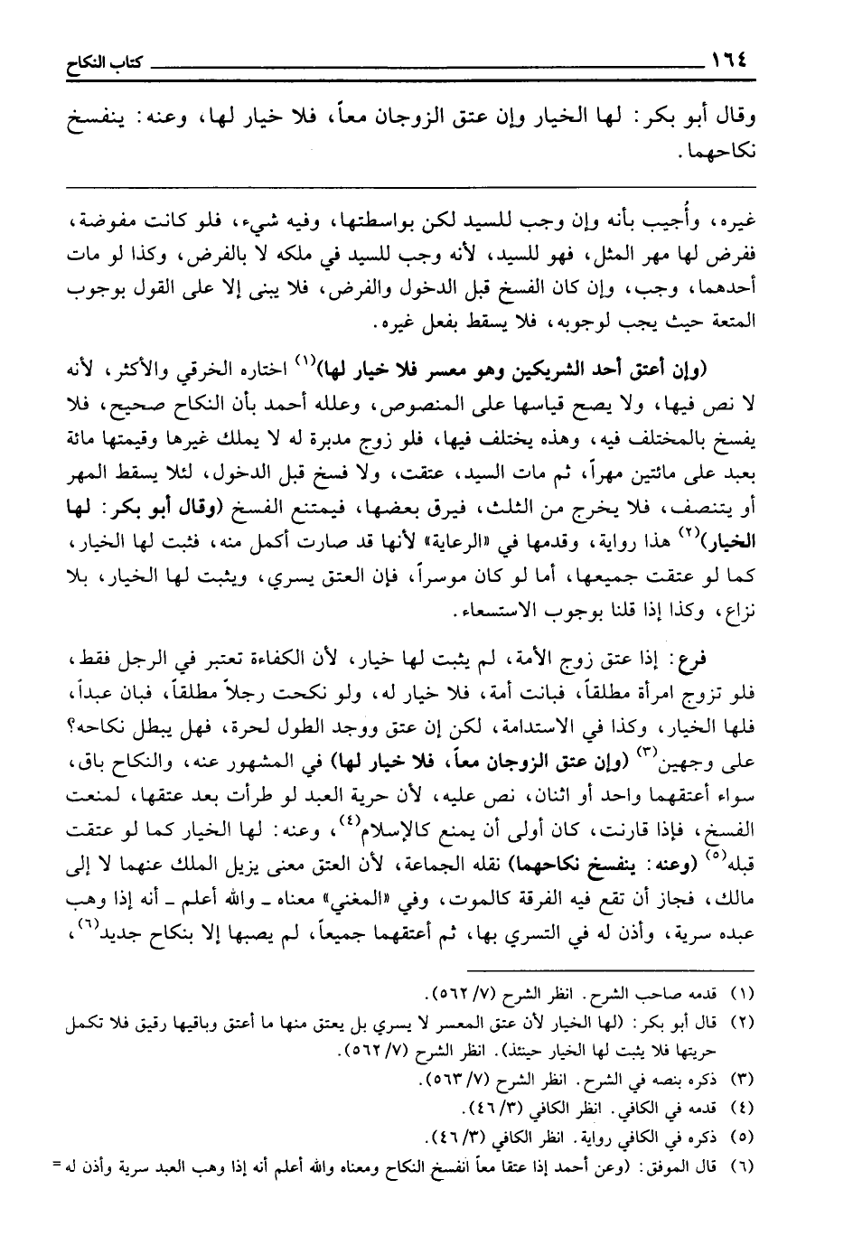 (وَإِنْ أَعْتَقَ أَحَدُ الشَّرِيكَيْنِ وَهُوَ مُعْسِرٌ، فَلَا خِيَارَ لَهَا) اخْتَارَهُ الْخِرَقِيُّ وَالْأَكْثَرُ ; لِأَنَّهُ لَا نَصَّ فِيهَا، وَلَا يَصِحُّ قِيَاسُهَا عَلَى الْمَنْصُوصِ، وَعَلَّلَهُ أَحْمَدُ بِأَنَّ النِّكَاحَ صَحِيحٌ، فَلَا يُفْسَخُ بِالْمُخْتَلَفِ فِيهِ، وَهَذِهِ يُخْتَلَفُ فِيهَا، فَلَوْ زَوَّجَ مُدَبَّرَةً لَهُ لَا يَمْلِكُ غَيْرَهَا وَقِيمَتُهَا مِائَةٌ بِعَبْدٍ عَلَى مِائَتَيْنِ مَهْرًا، ثُمَّ مَاتَ السَّيِّدُ - عُتِقَتْ، وَلَا فَسْخَ قَبْلَ الدُّخُولِ، لِئَلَّا يَسْقُطَ الْمَهْرُ أَوْ يَتَنَصَّفَ، فَلَا يَخْرُجُ مِنَ الثُّلُثِ فَيَرِقُّ بَعْضُهَا فَيَمْتَنِعُ الْفَسْخُ (وَقَالَ أَبُو بَكْرٍ: لَهَا الْخِيَارُ) هَذَا رِوَايَةٌ، وَقَدَّمَهَا فِي " الرِّعَايَةِ " لِأَنَّهَا قَدْ صَارَتْ أَكْمَلَ مِنْهُ، فَثَبَتَ لَهَا الْخِيَارُ، كَمَا لَوْ عَتَقَت جَمِيعًها، أَمَّا لَوْ كَانَ مُوسِرًا، فَإِنَّ الْعِتْقَ يَسْرِي، وَيَثْبُتُ لَهَا الْخِيَارُ بِلَا نِزَاعٍ، وَكَذَا إِذَا قُلْنَا بِوُجُوبِ الِاسْتِسْعَاءِ.