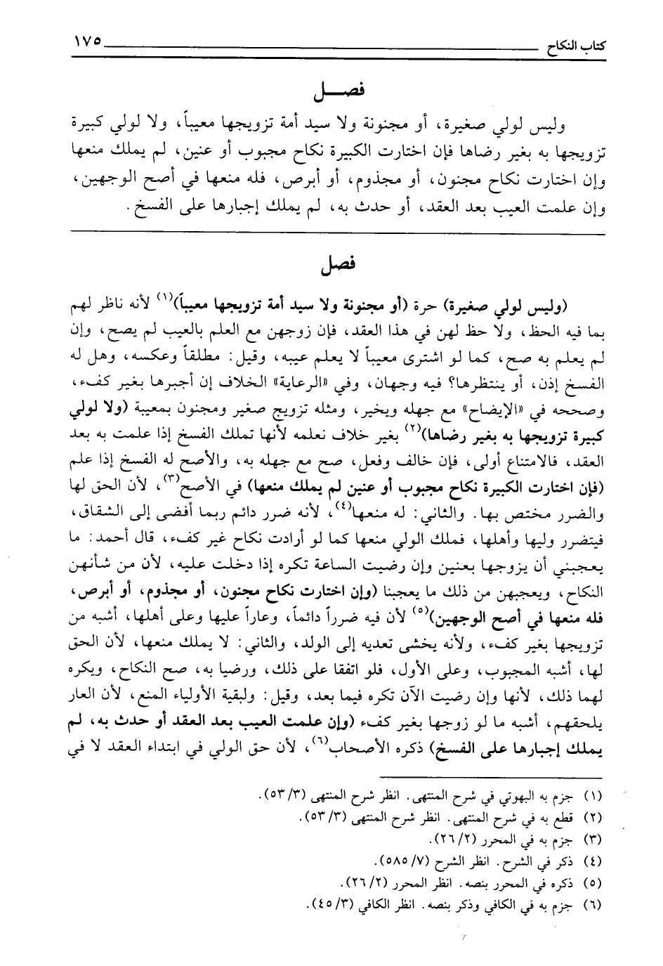 فَصْلٌ وَلَيْسَ لِوَلِيِّ صَغِيرَةٍ، أَوْ مَجْنُونَةٍ، وَلَا سَيِّدِ أَمَةٍ، تَزْوِيجُهَا مَعِيبًا، وَلَا لِوَلِيِّ كَبِيرَةٍ تَزْوِيجُهَا بِهِ بِغَيْرِ رِضَاهَا، فَإِنِ اخْتَارَتِ الْكَبِيرَةُ نِكَاحَ مَجْبُوبٍ أَوْ عِنِّينٍ، لَمْ يَمْلِكْ مَنْعَهَا، وَإِنِ اخْتَارَتْ نِكَاحَ مَجْنُونٍ، أَوْ مَجْذُومٍ، أَوْ أَبْرَصَ فَلَهُ مَنْعُهَا فِي أَصَحِّ الْوَجْهَيْنِ، وَإِنْ عَلِمَتِ الْعَيْبَ بَعْدَ الْعَقْدِ، أَوْ حَدَثَ بِهِ، لَمْ يَمْلِكْ إِجْبَارَهَا عَلَى الْفَسْخِ.