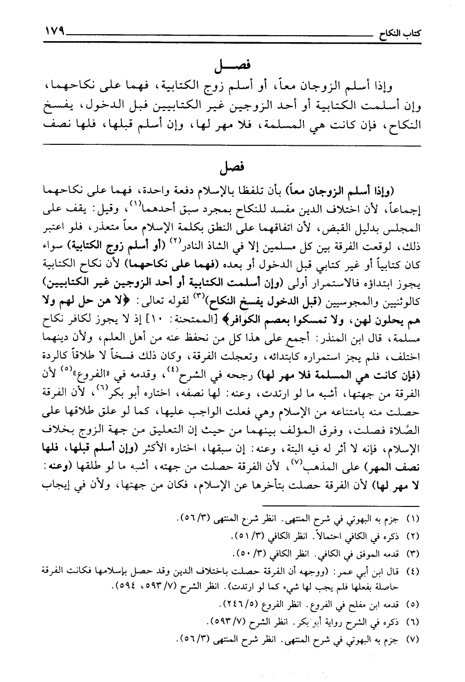 فَصْلٌ (وَإِذَا أَسْلَمَ الزَّوْجَانِ مَعًا) بِأَنْ تَلَفَّظَا بِالْإِسْلَامِ دَفْعَةً وَاحِدَةً، فَهُمَا عَلَى نِكَاحِهِمَا إِجْمَاعًا ; لِأَنَّ اخْتِلَافَ الدِّينِ مُفْسِدٌ لِلنِّكَاحِ بِمُجَرَّدِ سَبْقِ أَحَدِهِمَا، وَقِيلَ: يَقِفُ عَلَى الْمَجْلِسِ بِدَلِيلِ الْقَبْضِ ; لِأَنَّ اتِّفَاقَهُمَا عَلَى النُّطْقِ بِكَلِمَةِ الْإِسْلَامِ مَعًا مُتَعَذِّرٌ، فَلَوِ اعْتُبِرَ ذَلِكَ لَوَقَعَتِ الْفُرْقَةُ بَيْنَ كُلِّ مُسْلِمَيْنِ إِلَّا فِي الشَّاذِّ النَّادِرِ (أَوْ أَسْلَمَ زَوْجُ الْكِتَابِيَّةِ) سَوَاءٌ كَانَ كِتَابِيًّا أَوْ غَيْرَ كِتَابِيٍّ - قَبْلَ الدُّخُولِ أَوْ بَعْدَهُ (فَهُمَا عَلَى نِكَاحِهِمَا) ; لِأَنَّ نِكَاحَ الْكِتَابِيَّةِ يَجُوزُ ابْتِدَاؤُهُ، فَالِاسْتِمْرَارُ أَوْلَى (وَإِنْ أَسْلَمَتِ الْكِتَابِيَّةُ أَوْ أَحَدُ الزَّوْجَيْنِ غَيْرُ الْكِتَابِيِّينَ) كَالْوَثَنِيِّينَ وَالْمَجُوسِيِّينَ (قَبْلَ الدُّخُولِ - يُفْسَخُ النِّكَاحُ) ; لِقَوْلِهِ تَعَالَى: {لا هُنَّ حِلٌّ لَهُمْ وَلا هُمْ يَحِلُّونَ لَهُنَّ} [الممتحنة: 10] {وَلا تُمْسِكُوا بِعِصَمِ الْكَوَافِرِ} [الممتحنة: 10] إِذْ لَا يَجُوزُ لِكَافِرٍ نِكَاحُ مُسْلِمَةٍ، قَالَ ابْنُ الْمُنْذِرِ: أَجْمَعَ عَلَى هَذَا كُلُّ مَنْ نَحْفَظُ عَنْهُ مِنْ أَهْلِ الْعِلْمِ ; وَلِأَنَّ دِينَهَما اخْتَلَفَ، فَلَمْ يَجُزِ اسْتِمْرَارُهُ كَابْتِدَائِهِ، وَتَعَجَّلَتِ الْفُرْقَةَ، وَكَانَ ذَلِكَ فَسْخًا لَا طَلَاقًا كَالرِّدَّةِ (فَإِنْ كَانَتْ هِيَ الْمُسْلِمَةَ فَلَا مَهْرَ لَهَا) رَجَّحَهُ فِي الشَّرْحِ، وَقَدَّمَهُ فِي " الْفُرُوعِ " ; لِأَنَّ الْفُرْقَةَ مِنْ جِهَتِهَا، أَشْبَهَ مَا لَوِ ارْتَدَّتْ، وَعَنْهُ: لَهَا نَصِفُهُ، اخْتَارَهُ أَبُو بَكْرٍ ; لِأَنَّ الْفُرْقَةَ حَصَلَتْ مِنْهُ بِامْتِنَاعِهِ مِنَ الْإِسْلَامِ، وَهِيَ فَعَلَتِ الْوَاجِبَ عَلَيْهَا، كَمَا لَوْ عَلَّقَ طَلَاقَهَا عَلَى الصَّلَاةِ فَصَلَّتْ، وَفَرَّقَ الْمُؤَلِّفُ بَيْنَهُمَا مِنْ حَيْثُ إِنَّ التَّعْلِيقَ مِنْ جِهَةِ الزَّوْجِ بِخِلَافِ الْإِسْلَامِ، فَإِنَّهُ لَا أَثَرَ لَهُ فِيهِ الْبَتَّةَ، وَعَنْهُ: إِنْ سَبَقَهَا، اخْتَارَهُ الْأَكْثَرُ (وَإِنْ أَسْلَمَ قَبْلَهَا، فَلَهَا نِصْفُ الْمَهْرِ) عَلَى الْمَذْهَبِ ; لِأَنَّ الْفُرْقَةَ حَصَلَتْ مِنْ جِهَتِهِ، أَشْبَهَ مَا لَوْ طَلَّقَهَا (وَعَنْهُ: لَا مَهْرَ لَهَا) ; لِأَنَّ الْفُرْقَةَ حَصَلَتْ بِتَأَخُّرِهَا عَنِ الْإِسْلَامِ، فَكَانَ مِنْ جِهَتِهَا ; وَلِأَنَّ فِي إِيجَابِ