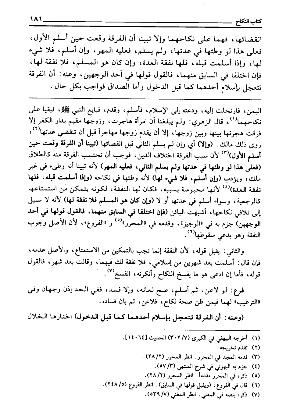 ـــــــــــــــــــــــــــــQالْيَمَنِ، فَارْتَحَلَتْ إِلَيْهِ، وَدَعَتْهُ إِلَى الْإِسْلَامِ، فَأَسْلَمَ، وَقَدِمَ فَبَايَعَ النَّبِيَّ - صَلَّى اللَّهُ عَلَيْهِ وَسَلَّمَ - فَبَقِيَا عَلَى نِكَاحِهِمَا» قَالَ الزُّهْرِيُّ: وَلَمْ يَبْلُغْنَا أَنَّ امْرَأَةً هَاجَرَتْ وَزَوْجُهَا مُقِيمٌ بِدَارِ الْكُفْرِ إِلَّا فَرَّقَتْ هِجْرَتُهَا بَيْنَهَا وَبَيْنَ زَوْجِهَا، إِلَّا أَنْ يَقْدُمَ زَوْجُهَا مُهَاجِرًا قَبْلَ أَنْ تَنْقَضِيَ عِدَّتُهَا، رَوَى ذَلِكَ مَالِكٌ. (وَإِلَّا) أَيْ: وَإِنْ لَمْ يُسْلِمِ الثَّانِي قَبْلَ انْقِضَائِهَا (تَبَيَّنَّا أَنَّ الْفُرْقَةَ وَقَعَتْ حِينَ أَسْلَمَ الْأَوَّلُ) ; لِأَنَّ سَبَبَ الْفُرْقَةِ اخْتِلَافُ الدِّينِ، فَوَجَبَ أَنْ تُحْتَسَبَ الْفُرْقَةُ مِنْهُ كَالطَّلَاقِ (فَعَلَى هَذَا لَوْ وَطِئَهَا فِي عِدَّتِهَا وَلَمْ يُسْلِمْ، فَعَلَيْهِ الْمَهْرُ) ; لِأَنَّهُ تَبَيَّنَّا أَنَّهُ وَطِئَ فِي غَيْرِ مِلْكٍ، وَيُؤَدَّبُ (وَإِنْ أَسْلَمَ، فَلَا شَيْءَ لَهَا) ; لِأَنَّهُ وَطِئَهَا فِي نِكَاحِهِ (وَإِذَا أَسْلَمَتْ قَبْلَهُ، فَلَهَا نَفَقَةُ الْعِدَّةِ) ; لِأَنَّهَا مَحْبُوسَةٌ بِسَبَبِهِ، فَكَانَ لَهَا النَّفَقَةُ ; لِكَوْنِهِ يَتَمَكَّنُ مِنَ اسْتِمْتَاعِهَا كَالرَّجْعِيَّةِ، وَسَوَاءٌ أَسْلَمَ فِي عِدَّتِهَا أَوْ لَا (وَإِنْ كَانَ هُوَ الْمُسْلِمَ، فَلَا نَفَقَةَ لَهَا) ; لِأَنَّهُ لَا سَبِيلَ إِلَى تَلَافِي نِكَاحِهَا، أَشْبَهَتِ الْبَائِنَ (فَإِنِ اخْتَلَفَا فِي السَّابِقِ مِنْهُمَا، فَالْقَوْلُ قَوْلُهَا فِي أَحَدِ الْوَجْهَيْنِ) جَزَمَ بِهِ فِي " الْوَجِيزِ "، وَقَدَّمَهُ فِي " الْمُحَرَّرِ "، و" الْفُرُوعِ " ; لِأَنَّ الْأَصْلَ وُجُوبُ النَّفَقَةِ وَهُوَ يَدَّعِي سُقُوطَهَا.