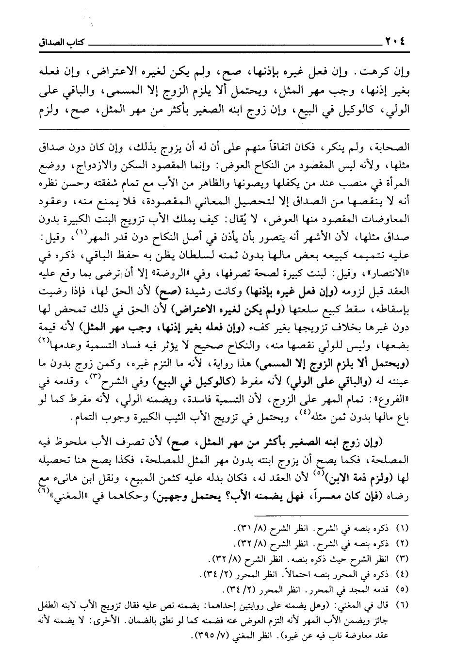 ـــــــــــــــــــــــــــــQالصَّحَابَةِ، وَلَمْ يُنْكَرْ، فَكَانَ اتِّفَاقًا مِنْهُمْ عَلَى أَنَّ لَهُ أَنْ يُزَوِّجَ بِذَلِكَ، وَإِنْ كَانَ دُونَ صَدَاقِ مِثْلِهَا؛ وَلِأَنَّهُ لَيْسَ الْمَقْصُودُ مِنَ النِّكَاحِ الْعِوَضَ، وَإِنَّمَا الْمَقْصُودُ السَّكَنُ وَالِازْدِوَاجُ، وَوَضْعُ الْمَرْأَةِ فِي مَنْصِبٍ عِنْدَ مَنْ يَكْفُلُهَا وَيَصُونُهَا، وَالظَّاهِرُ مِنَ الْأَبِ مَعَ تَمَامِ شَفَقَتِهِ وَحُسْنِ نَظَرِهِ - أَنَّهُ لَا يَنْقُصُهَا مِنَ الصَّدَاقِ إِلَّا لِتَحْصِيلِ الْمَعَانِي الْمَقْصُودَةِ، فَلَا يُمْنَعُ مِنْهُ، وَعُقُودُ الْمُعَاوَضَاتِ الْمَقْصُودُ مِنْهَا الْعِوَضُ، لَا يُقَالُ: كَيْفَ يُمَلَّكُ الْأَبُ تَزْوِيجَ الْبِنْتِ الْكَبِيرَةِ بِدُونِ صَدَاقِ مِثْلِهَا؛ لِأَنَّ الْأَشْهَرَ أَنَّهُ يُتَصَوَّرُ بِأَنْ يَأْذَنَ فِي أَصْلِ النِّكَاحِ دُونَ قَدْرِ الْمَهْرِ، وَقِيلَ: عَلَيْهِ تَتْمِيمُهُ كَبَيْعِهِ بَعْضَ مَالِهَا بِدُونِ ثَمَنِهِ لِسُلْطَانٍ يُظَنُّ بِهِ حِفْظُ الْبَاقِي، ذَكَرَهُ فِي " الِانْتِصَارِ " وَقِيلَ: لِبِنْتٍ كَبِيرَةٍ؛ لِصِحَّةِ تَصَرُّفِهَا، وَفِي " الرَّوْضَةِ " إِلَّا أَنْ تَرْضَى بِمَا وَقَعَ عَلَيْهِ الْعَقْدُ قَبْلَ لُزُومِهِ (وَإِنْ فَعَلَ غَيْرُهُ بِإِذْنِهَا) وَكَانَتْ رَشِيدَةً (صَحَّ) ؛ لِأَنَّ الْحَقَّ لَهَا، فَإِذَا رَضِيَتْ بِإِسْقَاطِهِ، سَقَطَ، كَبَيْعِ سِلْعَتِهَا (وَلَمْ يَكُنْ لِغَيْرِهِ الِاعْتِرَاضُ) ؛ لِأَنَّ الْحَقَّ فِي ذَلِكَ تَمَحَّضَ لَهَا دُونَ غَيْرِهَا، بِخِلَافِ تَزْوِيجِهَا بِغَيْرِ كُفْءٍ (وَإِنْ فَعَلَهُ بِغَيْرِ إِذْنِهَا وَجَبَ مَهْرُ الْمِثْلِ) ؛ لِأَنَّهُ قِيمَةُ بُضْعِهَا، وَلَيْسَ لِلْوَلِيِّ نَقْصُهَا مِنْهُ، وَالنِّكَاحُ صَحِيحٌ لَا يُؤَثِّرُ فِيهِ فَسَادُ التَّسْمِيَةِ وَعَدَمُهَا (وَيَحْتَمِلُ أَلَّا يَلْزَمَ الزَّوْجَ إِلَّا الْمُسَمَّى) هَذَا رِوَايَةٌ؛ لِأَنَّهُ مَا الْتَزَمَ غَيْرُهُ، وَكَمَنَ زُوِّجَ بِدُونِ مَا عَيَّنْتَهُ لَهُ (وَالْبَاقِي عَلَى الْوَلِيِّ) ؛ لِأَنَّهُ مُفَرِّطٌ (كَالْوَكِيلِ فِي الْبَيْعِ) وَفِي " الشَّرْحِ "، وَقَدَّمَهُ فِي الْفُرُوعِ -: تَمَامُ الْمَهْرِ عَلَى الزَّوْجِ؛ لِأَنَّ التَّسْمِيَةَ فَاسِدَةٌ، وَيَضْمَنُهُ الْوَلِيُّ؛ لِأَنَّهُ مُفَرِّطٌ، كَمَا لَوْ بَاعَ مَالَهَا بِدُونِ ثَمَنِ مِثْلِهِ، وَيُحْتَمَلُ فِي تَزْوِيجِ الْأَبِ الثيب الكبيرة وُجُوبُ التَّمَامِ.
