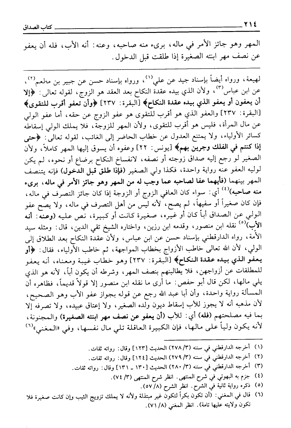 ـــــــــــــــــــــــــــــQلَهِيعَةَ، وَرَوَاهُ أَيْضًا بِإِسْنَادٍ جَيِّدٍ عَنْ عَلِيٍّ، وَرَوَاهُ بِإِسْنَادٍ حَسَنٍ عَنْ جُبَيْرِ بْنِ مُطْعِمٍ، عَنِ ابْنِ عَبَّاسٍ؛ وَلِأَنَّ الَّذِي بِيَدِهِ عُقْدَةُ النِّكَاحِ بَعْدَ الْعَقْدِ هُوَ الزَّوْجُ؛ لِقَوْلِهِ تَعَالَى: {إِلا أَنْ يَعْفُونَ أَوْ يَعْفُوَ الَّذِي بِيَدِهِ عُقْدَةُ النِّكَاحِ} [البقرة: 237] {وَأَنْ تَعْفُوا أَقْرَبُ لِلتَّقْوَى} [البقرة: 237] وَالْعَفْوُ الَّذِي هُوَ أَقْرَبُ لِلتَّقْوَى هُوَ عَفْوُ الزَّوْجِ عَنْ حَقِّهِ، أَمَّا عَفْوُ الْوَلِيِّ عَنْ مَالِ الْمَرْأَةِ، فَلَيْسَ هُوَ أَقْرَبُ لِلتَّقْوَى؛ وَلِأَنَّ الْمَهْرَ لِلزَّوْجَةِ، فَلَا يَمْلِكُ الْوَلِيُّ إِسْقَاطَهُ كَسَائِرِ الْأَوْلِيَاءِ، وَلَا يَمْتَنِعُ الْعُدُولُ عَنِ خطاب الْحَاضِرِ إِلَى الْغَائِبِ؛ لِقَوْلِهِ تَعَالَى: {حَتَّى إِذَا كُنْتُمْ فِي الْفُلْكِ وَجَرَيْنَ بِهِمْ} [يونس: 22] وَعَفْوُهُ أَنْ يَسُوقَ إِلَيْهَا الْمَهْرَ كَامِلًا؛ وَلِأَنَّ الصَّغِيرَ لَوْ رَجَعَ إِلَيْهِ صَدَاقُ زَوْجَتِهِ أَوْ نِصْفُهُ - لِانْفِسَاخِ النِّكَاحِ بِرِضَاعٍ أَوْ نَحْوِهِ - لَمْ يَكُنْ لِوَلِيِّهِ الْعَفُوُ عَنْهُ رِوَايَةً وَاحِدَةً، فَكَذَا وَلِيُّ الصَّغِيرِ (فَإِذَا طَلَّقَ قَبْلَ الدُّخُولِ) فَإِنَّهُ يَتَنَصَّفُ الْمَهْرَ بَيْنَهُمَا (فَأَيُّهُمَا عَفَا لِصَاحِبِهِ عَمَّا وَجَبَ لَهُ مِنَ الْمَهْرِ - وَهُوَ جَائِزُ الْأَمْرِ فِي مَالِهِ - بَرِئَ مِنْهُ صَاحِبُهُ) أَيْ: سَوَاءٌ كَانَ الْعَافِي الزَّوْجَ أَوِ الزَّوْجَةَ إِذَا كَانَ جَائِزَ التَّصَرُّفِ فِي مَالِهِ، فَإِنْ كَانَ صَغِيرًا أَوْ سَفِيهًا لَمْ يَصِحَّ؛ لِأَنَّهُ لَيْسَ مِنْ أَهْلِ التَّصَرُّفِ فِي مَالِهِ، وَلَا يَصِحُّ عَفْوُ الْوَلِيِّ عَنِ الصَّدَاقِ أَبًا كَانَ أَوْ غَيْرَهُ، صَغِيرَةً كَانَتْ أَوْ كَبِيرَةً، نَصَّ عَلَيْهِ (وَعَنْهُ: أَنَّهُ الْأَبُ) نَقَلَهُ ابْنُ مَنْصُورٍ، وَقَدَّمَهُ ابْنُ رَزِينٍ، وَاخْتَارَهُ الشَّيْخُ تَقِيُّ الدِّينِ، قَالَ: وَمَثَّلَهُ سَيِّدُ الْأُمَّةِ، رَوَاهُ الدَّارَقُطْنِيُّ بِإِسْنَادٍ حَسَنٍ عَنِ ابْنِ عَبَّاسٍ؛ وَلِأَنَّ عُقْدَةَ النِّكَاحِ بَعْدَ الطَّلَاقِ إِلَى الْوَلِيِّ؛ لِأَنَّ اللَّهَ تَعَالَى خَاطَبَ الْأَزْوَاجَ بِخِطَابِ الْمُوَاجَهَةِ، ثُمَّ خَاطَبَ الْأَوْلِيَاءَ فَقَالَ: {أَوْ يَعْفُوَ الَّذِي بِيَدِهِ عُقْدَةُ النِّكَاحِ} [البقرة: 237] وَهُوَ خِطَابُ غَيْبَةٍ، وَمَعْنَاهُ: أَنَّهُ يَعْفُو لِلْمُطَلَّقَاتِ عَنْ أَزْوَاجِهِنَّ، فَلَا يُطَالِبْنَهُمْ بِنِصْفِ الْمَهْرِ، وَشَرْطُهُ أَنْ يَكُونَ أَبًا؛ لِأَنَّهُ هُوَ الَّذِي يَلِي مَالَهَا، لَكِنْ قَالَ أَبُو حَفْصٍ: مَا أَرَى مَا نَقَلَهُ ابْنُ مَنْصُورٍ إِلَّا قَوْلًا قَدِيمًا، فَظَاهِرُهُ أَنَّ الْمَسْأَلَةَ رِوَايَةٌ وَاحِدَةٌ، وَأَنَّ أَبَا عَبْدِ اللَّهِ رَجَعَ عَنْ قَوْلِهِ بِجَوَازِ عَفْوِ الْأَبِ، وَهُوَ الصَّحِيحُ؛ لِأَنَّ مَذْهَبَهُ أَنَّهُ لَا يَجُوزُ لِلْأَبِ إِسْقَاطُ دُيُونِ وَلَدِهِ الصَّغِيرِ، وَلَا إِعْتَاقُ عَبِيدِهِ، وَلَا تَصَرُّفِهِ إِلَّا بِمَا فِيهِ مَصْلَحَتُهُمْ (فَلَهُ) أَيْ: لِلْأَبِ (أَنْ يَعْفُوَ عَنْ نِصْفِ مَهْرِ ابْنَتِهِ الصَّغِيرَةِ) وَالْمَجْنُونَةِ؛ لِأَنَّهُ يَكُونُ وَلِيًّا عَلَى مَالِهَا، فَإِنَّ الْكَبِيرَةَ الْعَاقِلَةَ تَلِي مَالَ نَفْسِهَا، وَفِي " الْمُغْنِي "