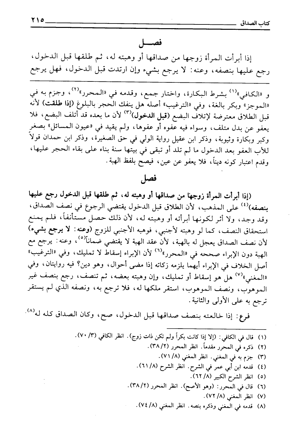 فَصْلٌ (إِذَا أَبْرَأَتِ الْمَرْأَةُ زَوْجَهَا مِنْ صَدَاقِهَا أَوْ وَهَبَتْهُ لَهُ، ثُمَّ طَلَّقَهَا قَبْلَ الدُّخُولِ - رَجَعَ عَلَيْهَا بِنِصْفِهِ) عَلَى الْمَذْهَبِ؛ لِأَنَّ الطَّلَاقَ قَبْلَ الدُّخُولِ يَقْتَضِي الرُّجُوعَ فِي نِصْفِ الصَّدَاقِ، وَقَدْ وُجِدَ، وَلَا أَثَرَ لِكَوْنِهَا أَبْرَأَتْهُ أَوْ وَهَبَتْهُ لَهُ؛ لِأَنَّ ذَلِكَ حَصَلَ مُسْتَأْنَفًا، فَلَمْ يَمْنَعِ اسْتِحْقَاقَ النِّصْفِ، كَمَا لَوْ وَهَبَتْهُ لِأَجْنَبِيٍّ فَوَهَبَهُ الْأَجْنَبِيُّ لِلزَّوْجِ (وَعَنْهُ: لَا يَرْجِعُ بِشَيْءٍ) ؛ لِأَنَّ نِصْفَ الصَّدَاقِ يُعَجَّلُ لَهُ بِالْهِبَةِ؛ لِأَنَّ عَقْدَ الْهِبَةِ لَا يَقْتَضِي ضَمَانًا، وَعَنْهُ: يَرْجِعُ مَعَ الْهِبَةِ دُونَ الْإِبْرَاءِ، صَحَّحَهُ فِي " الْمُحَرَّرِ "؛ لِأَنَّ الْإِبْرَاءَ إِسْقَاطٌ لَا تَمْلِيكٌ، وَفِي " التَّرْغِيبِ ": أَصْلُ الْخِلَافِ فِي الْإِبْرَاءِ أَيُّهُمَا يَلْزَمُهُ زَكَاتُهُ إِذَا مَضَى أَحْوَالٌ، وَهُوَ دَيْنٌ؟ فِيهِ رِوَايَتَانِ، وَفِي " الْمُغْنِي ": هَلْ هُوَ إِسْقَاطٌ أَوْ تَمْلِيكٌ، وَإِنْ وَهَبَتْهُ بَعْضَهُ ثُمَّ تَنَصَّفَ رَجَعَ بِنِصْفِ غَيْرِ الْمَوْهُوبِ، وَنِصْفُ الْمَوْهُوبِ اسْتَقَرَّ مَلِكُهَا لَهُ، فَلَا تَرْجِعُ بِهِ، وَنِصْفُهُ الَّذِي لَمْ يَسْتَقِرَّ تَرْجِعُ بِهِ عَلَى الْأُولَى وَالثَّانِيَةِ.
