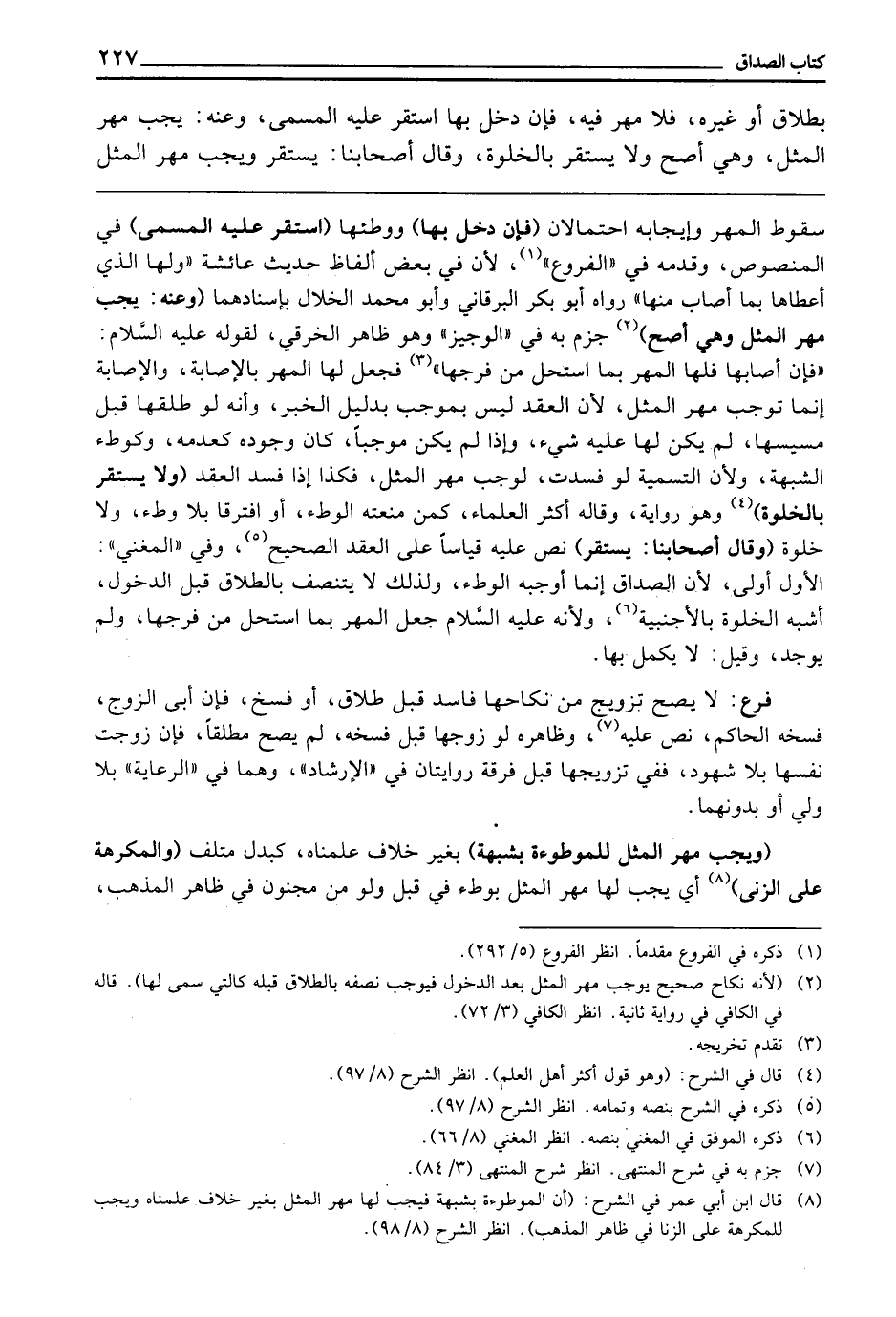 ـــــــــــــــــــــــــــــQسُقُوطِ الْمَهْرِ وَإِيجَابِهِ احْتِمَالَانِ (فَإِنْ دَخَلَ بِهَا) وَوَطِئَهَا (اسْتَقَرَّ عَلَيْهِ الْمُسَمَّى) فِي الْمَنْصُوصِ، وَقَدَّمَهُ فِي الْفُرُوعِ؛ لِأَنَّ فِي بَعْضِ أَلْفَاظِ حَدِيثِ عَائِشَةَ: «وَلَهَا الَّذِي أَعْطَاهَا بِمَا أَصَابَ مِنْهَا» رَوَاهُ أَبُو بَكْرٍ الْبَرْقَانِيُّ، وَأَبُو مُحَمَّدٍ الْخَلَّالُ بِإِسْنَادِهِمَا (وَعَنْهُ: يَجِبُ مَهْرُ الْمِثْلِ، وَهِيَ أَصَحُّ) جَزَمَ بِهِ فِي " الْوَجِيزِ "، وَهُوَ ظَاهِرُ الْخِرَقِيِّ؛ لِقَوْلِهِ - عَلَيْهِ السَّلَامُ -: «فَإِنْ أَصَابَهَا فَلَهَا الْمَهْرُ بِمَا اسْتَحَلَّ مِنْ فَرْجِهَا» فَجُعِلَ لَهَا الْمَهْرُ بِالْإِصَابَةِ، وَالْإِصَابَةُ إِنَّمَا تُوجِبُ مَهْرَ الْمِثْلِ؛ لِأَنَّ الْعَقْدَ لَيْسَ بِمُوجِبٍ، بِدَلِيلِ الْخَبَرِ، وَأَنَّهُ لَوْ طَلَّقَهَا قَبْلَ مَسِيسِهَا لَمْ يَكُنْ لَهَا عَلَيْهِ شَيْءٌ، وَإِذَا لَمْ يَكُنْ مُوجِبًا كَانَ وُجُودُهُ كَعَدَمِهِ، وَكَوَطْءِ الشُّبْهَةِ؛ وَلِأَنَّ التَّسْمِيَةَ لَوْ فَسَدَتْ لَوَجَبَ مَهْرُ الْمِثْلِ، فَكَذَا إِذَا فَسَدَ الْعَقْدُ (وَلَا يَسْتَقِرُّ بِالْخَلْوَةِ) وَهُوَ رِوَايَةٌ، وَقَالَهُ أَكْثَرُ الْعُلَمَاءِ، كَمَنْ مَنَعَتْهُ الْوَطْءَ أَوِ افْتَرَقَا بِلَا وَطْءٍ وَلَا خَلْوَةٍ (وَقَالَ أَصْحَابُنَا يَسْتَقِرُّ) نَصَّ عَلَيْهِ قِيَاسًا عَلَى الْعَقْدِ الصَّحِيحِ، وَفِي " الْمُغْنِي ": الْأَوَّلُ أَوْلَى؛ لِأَنَّ الصَّدَاقَ إِنَّمَا أَوْجَبَهُ الْوَطْءُ، وَلِذَلِكَ لَا يَتَنَصَّفُ بِالطَّلَاقِ قَبْلَ الدُّخُولِ، أَشْبَهَ الْخَلْوَةَ بِالْأَجْنَبِيَّةِ؛ وَلِأَنَّهُ - عَلَيْهِ السَّلَامُ - جَعَلَ الْمَهْرَ بِمَا اسْتَحَلَّ مِنْ فَرْجِهَا، وَلَمْ يُوجَدْ، وَقِيلَ: لَا يَكْمُلُ بِهَا.