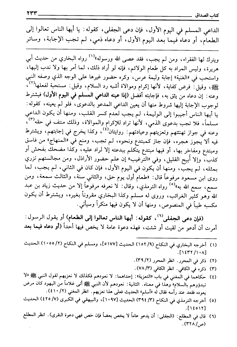 ـــــــــــــــــــــــــــــQوَيُتْرَكُ لَهَا الْفُقَرَاءُ، وَمَنْ لَمْ يُجِبْ فَقَدْ عَصَى اللَّهَ وَرَسُولَهُ» رَوَاهُ الْبُخَارِيُّ مِنْ حَدِيثِ أَبِي هُرَيْرَةَ وَلَيْسَ الْمُرَادُ بِهِ كُلَّ طَعَامِ الْوَلَائِمِ، فَإِنَّهُ لَوْ أَرَادَ ذَلِكَ لَمَا أَمَرَ بِهَا وَلَا نَدَبَ إِلَيْهَا، وَاسْتَحَبَّ فِي " الْغُنْيَةِ " إِجَابَةَ وَلِيمَةِ عُرْسٍ، وَكَرِهَ حُضُورَ غَيْرِهَا عَلَى الْوَجْهِ الَّذِي وَصَفَهُ النَّبِيُّ - صَلَّى اللَّهُ عَلَيْهِ وَسَلَّمَ - وَقِيلَ: فَرْضُ كِفَايَةٍ؛ لِأَنَّهَا إِكْرَامٌ وَمُوَالَاةٌ، أَشْبَهَ رَدَّ السَّلَامِ، وَقِيلَ: مُسْتَحَبَّةٌ لِفِعْلِهَا، وَعَنْهُ: إِنْ دَعَاهُ مَنْ يَثِقُ بِهِ فَإِجَابَتُهُ أَفْضَلُ (إِذَا عَيَّنَهُ الدَّاعِي الْمُسْلِمُ فِي الْيَوْمِ الْأَوَّلِ) فَيُشْتَرَطُ لِوُجُوبِ الْإِجَابَةِ إِلَيْهَا شُرُوطٌ مِنْهَا: أَنْ يُعَيِّنَ الدَّاعِي الْمَدْعُوَّ بِالدَّعْوَى، فَلَوْ لَمْ يُعَيِّنْهُ كَقَوْلِهِ: يَا أَيُّهَا النَّاسُ أَجِيبُوا إِلَى الْوَلِيمَةِ لَمْ يُجِبْ؛ لِعَدَمِ كَسْرِ الْقَلْبِ، وَمِنْهَا: أَنْ يَكُونَ الدَّاعِي مُسْلِمًا، فَلَا تَجِبُ بِدَعْوَى الذِّمِّيِّ؛ لِأَنَّهَا تُرَادُ لِلْإِكْرَامِ وَالْمُوَالَاةِ، وَذَلِكَ مُنْتَفٍ فِي حَقِّهِ، وَعَنْهُ: فِي جَوَازِ تَهْنِئَتِهِمْ وَتَعْزِيَتِهِمْ وَعِيَادَتِهِمْ رِوَايَتَانِ، وَكَذَا يُخَرَّجُ فِي إِجَابَتِهِمْ، وَيُشْتَرَطُ فِيهِ أَلَّا يَجُوزَ هَجْرُهُ، فَإِنْ جَازَ كَمُبْتَدِعٍ وَنَحْوِهِ لَمْ تَجِبْ، وَمَنَعَ فِي " الْمِنْهَاجِ " مِنْ فَاسِقٍ وَمُبْتَدَعٍ وَمُفَاخِرٍ بِهَا، أَوْ فِيهَا مُبْتَدِعٌ يَتَكَلَّمُ بِبِدْعَتِهِ إِلَّا لِرَادٍّ عَلَيْهِ، وَكَذَا مُضْحِكٌ بِفُحْشٍ أَوْ كَذِبٍ، وَإِلَّا أُبِيحَ الْقَلِيلُ، وَفِي " التَّرْغِيبِ ": إِنْ عَلِمَ حُضُورَ الْأَرَاذِلِ، وَمَنْ مُجَالَسَتُهُمْ تُزْرِي بِمِثْلِهِ لَمْ يُجِبْ، وَمِنْهَا أَنْ يَكُونَ فِي الْيَوْمِ الْأَوَّلِ، فَإِنْ كَانَ فِي الثَّانِي لَمْ يُجِبْ؛ لِمَا رَوَى ابْنُ مَسْعُودٍ مَرْفُوعًا، قَالَ: «طَعَامُ أَوَّلِ يَوْمٍ حَقٌّ، وَالثَّانِي سُنَّةٌ، وَالثَّالِثُ سُمْعَةٌ، وَمَنْ سَمَّعَ سَمَّعَ اللَّهُ بِهِ» رَوَاهُ التِّرْمِذِيُّ، وَقَالَ: مَرْفُوعًا إِلَّا مِنْ حَدِيثِ زِيَادِ بْنِ عَبْدِ اللَّهِ، وَهُوَ كَثِيرُ الْغَرَائِبِ، وَرَوَى لَهُ مُسْلِمٌ، وَكَذَا الْبُخَارِيُّ مَقْرُونًا بِغَيْرِهِ، وَيُشْتَرَطُ أَنْ يَكُونَ مَكْسَبُهُ طَيِّبًا فِي الْمَنْصُوصِ، وَمِنْهَا أَنْ لَا يَكُونَ فِيهَا مُنْكَرًا، وَسَيَأْتِي.
