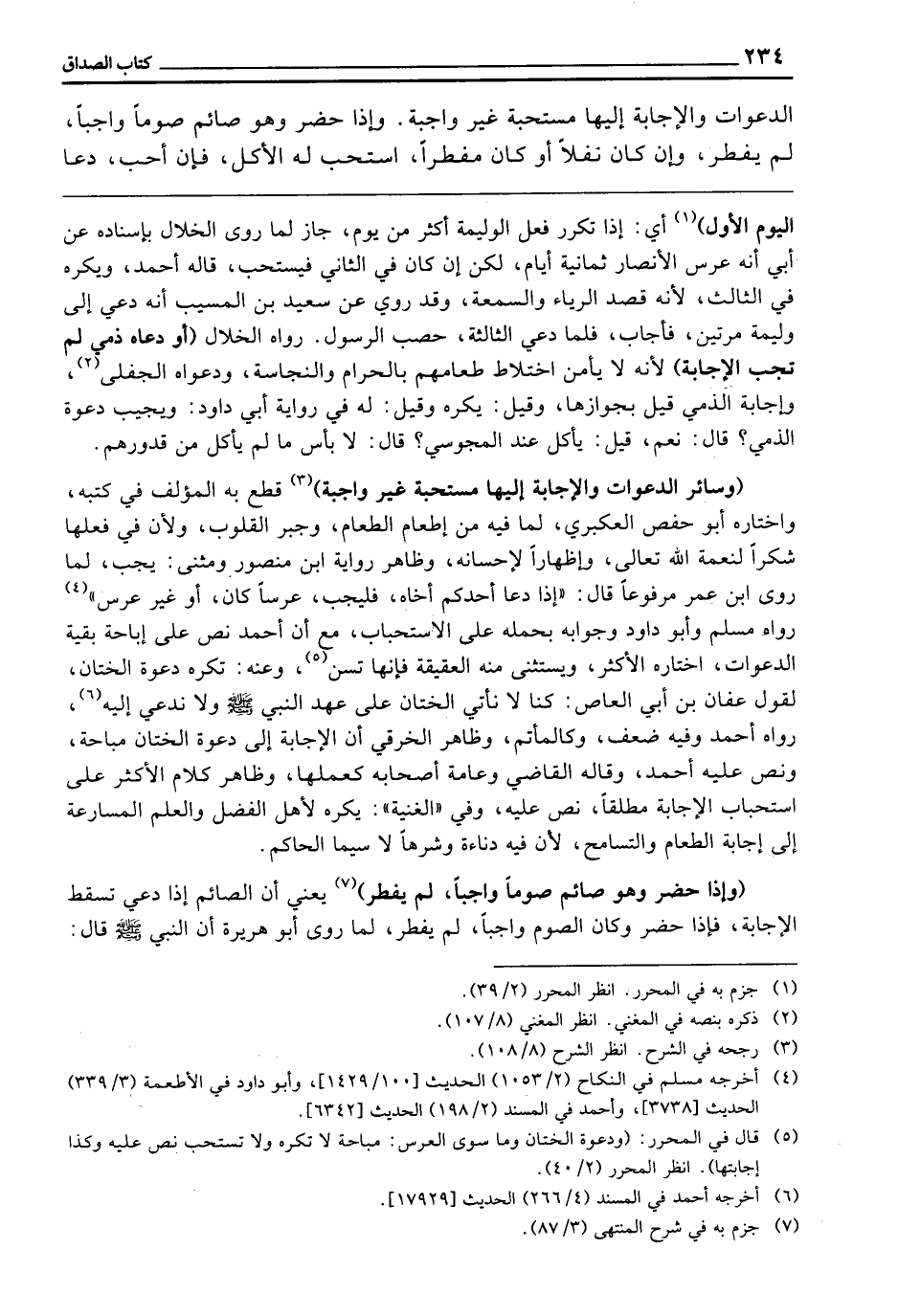 (وَسَائِرُ الدَّعَوَاتِ وَالْإِجَابَةِ إِلَيْهَا مُسْتَحَبَّةٌ غَيْرُ وَاجِبَةٍ) قَطَعَ بِهِ الْمُؤَلِّفُ فِي كُتُبِهِ، وَاخْتَارَهُ أَبُو حَفْصٍ الْعُكْبَرِيُّ؛ لِمَا فِيهِ مِنْ إِطْعَامِ الطَّعَامِ، وَجَبْرِ الْقُلُوبِ؛ وَلِأَنَّ فِي فِعْلِهَا شُكْرًا لِنِعْمَةِ اللَّهِ تَعَالَى، وَإِظْهَارًا لِإِحْسَانِهِ، وَظَاهِرُ رِوَايَةِ ابْنِ مَنْصُورٍ وَمُثَنَّى: يَجِبُ؛ لِمَا رَوَى ابْنُ عُمَرَ مَرْفُوعًا قَالَ: «إِذَا دَعَا أَحَدُكُمْ أَخَاهُ فَلْيُجِبْ، عُرْسًا كَانَ أَوْ غَيْرَ عُرْسٍ» رَوَاهُ مُسْلِمٌ وَأَبُو دَاوُدَ وَجَوَابُهُ بِحَمْلِهِ عَلَى الِاسْتِحْبَابِ، مَعَ أَنَّ أَحْمَدَ نَصَّ عَلَى إِبَاحَةِ بَقِيَّةِ الدَّعَوَاتِ، اخْتَارَهُ الْأَكْثَرُ، وَيُسْتَثْنَى مِنْهُ الْعَقِيقَةُ، فَإِنَّهَا تُسَنُّ، وَعَنْهُ: تُكْرَهُ دَعْوَةُ الْخِتَانِ؛ لِقَوْلِ عَفَّانَ بْنِ أَبِي الْعَاصِ: «كُنَّا لَا نَأْتِي الْخِتَانَ عَلَى عَهْدِ النَّبِيِّ - صَلَّى اللَّهُ عَلَيْهِ وَسَلَّمَ - وَلَا نُدْعَى إِلَيْهِ» رَوَاهُ أَحْمَدُ، وَفِيهِ ضَعْفٌ، وَكَالْمَأْتَمِ، وَظَاهِرُ الْخِرَقِيِّ: أَنَّ الْإِجَابَةَ إِلَى دَعْوَةِ الْخِتَانِ مُبَاحَةٌ، وَنَصَّ عَلَيْهِ أَحْمَدُ، وَقَالَهُ الْقَاضِي، وَعَامَّةُ أَصْحَابِهِ كَعَمَلِهَا، وَظَاهِرُ كَلَامِ الْأَكْثَرِ عَلَى اسْتِحْبَابِ الْإِجَابَةِ مُطْلَقًا، نَصَّ عَلَيْهِ، وَفِي " الْغُنْيَةِ ": يُكْرَهُ لِأَهْلِ الْفَضْلِ وَالْعِلْمِ الْمُسَارَعَةُ إِلَى إِجَابَةِ الطَّعَامِ وَالتَّسَامُحِ؛ لِأَنَّ فِيهِ دَنَاءَةً وَشَرَهًا لَا سِيَّمَا الْحَاكِمُ.