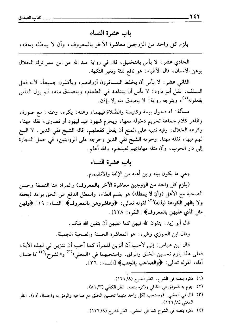 عِشْرَةِ النِّسَاءِ يَلْزَمُ كُلَّ وَاحِدٍ مِنَ الزَّوْجَيْنِ مُعَاشَرَةُ الْآخَرِ بِالْمَعْرُوفِ، وَأَنْ لَا يَمْطُلَهُ بِحَقِّهِ،