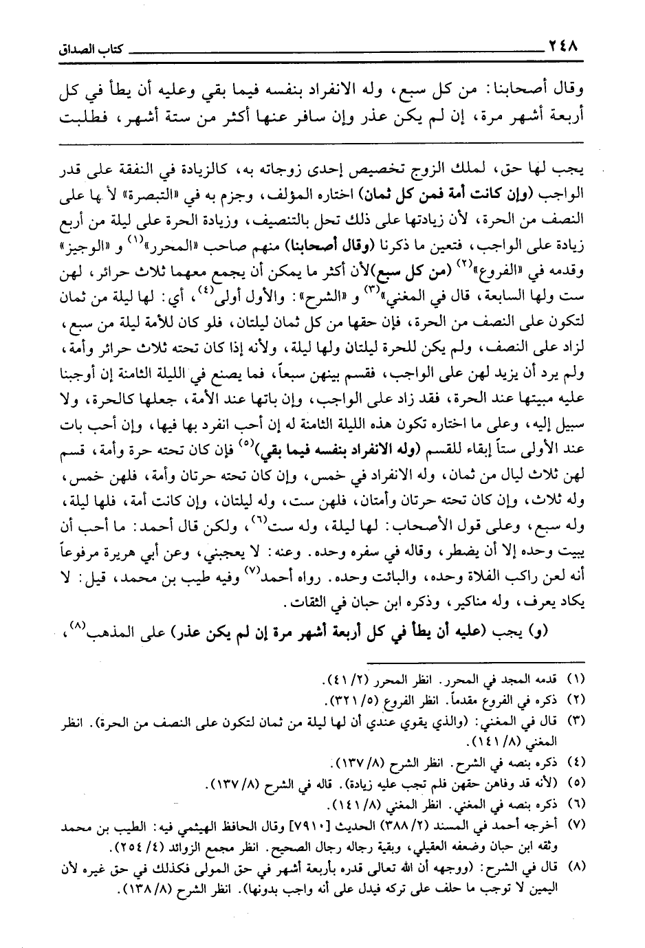 ـــــــــــــــــــــــــــــQيَجِبْ لَهَا حَقٌّ لَمَلَكَ الزَّوْجُ تَخْصِيصَ إِحْدَى زَوْجَاتِهِ بِهِ، كَالزِّيَادَةِ فِي النَّفَقَةِ عَلَى قَدْرِ الْوَاجِبِ (وَإِنْ كَانَتْ أَمَةً فَمِنْ كُلِّ ثَمَانٍ) اخْتَارَهُ الْمُؤَلِّفُ، وَجَزَمَ بِهِ فِي " التَّبْصِرَةِ "؛ لِأَنَّهَا عَلَى النِّصْفِ مِنَ الْحُرَّةِ؛ لِأَنَّ زِيَادَتَهَا عَلَى ذَلِكَ تَحِلُّ بِالتَّنْصِيفِ، وَزِيَادَةَ الْحُرَّةِ عَلَى لَيْلَةٍ مِنْ أَرْبَعٍ زِيَادَةٌ عَلَى الْوَاجِبِ، فَتَعَيَّنَ مَا ذَكَرْنَا (وَقَالَ أَصْحَابُنَا) مِنْهُمْ صَاحِبُ " الْمُحَرَّرِ " و" الْوَجِيزِ " وَقَدَّمَهُ فِي " الْفُرُوعِ " (مِنْ كُلِّ سَبْعٍ) ؛ لِأَنَّ أَكْثَرَ مَا يُمْكِنُ أَنْ يَجْمَعَ مَعَهَا ثَلَاثَ حَرَائِرَ لَهُنَّ سِتٌّ، وَلَهَا السَّابِعَةُ، قَالَ فِي " الْمُغْنِي " و" الشَّرْحِ ": وَالْأَوَّلُ أَوْلَى، أَيْ: لَهَا لَيْلَةٌ مِنْ ثَمَانٍ لِتَكُونَ عَلَى النِّصْفِ مِنَ الْحُرَّةِ، فَإِنَّ حَقَّهَا مِنْ كُلِّ ثَمَانٍ لَيْلَتَانِ، فَلَوْ كَانَ لِلْأَمَةِ لَيْلَةٌ مِنْ سَبْعٍ لَزَادَ عَلَى النِّصْفِ، وَلَمْ يَكُنْ لِلْحُرَّةِ لَيْلَتَانِ، وَلَهَا لَيْلَةٌ؛ وَلِأَنَّهُ إِذَا كَانَ تَحْتَهُ ثَلَاثُ حَرَائِرَ وَأَمَةٌ، وَلَمْ يُرِدْ أَنْ يَزِيدَ لَهُنَّ عَلَى الْوَاجِبِ فَقَسَّمَ بَيْنَهُنَّ سَبْعًا، فَمَا يَصْنَعُ فِي اللَّيْلَةِ الثَّامِنَةِ إِنْ أَوْجَبْنَا عَلَيْهِ مَبِيتَهَا عِنْدَ الْحُرَّةِ، فَقَدْ زَادَ عَلَى الْوَاجِبِ، وَإِنْ بَاتَهَا عِنْدَ الْأَمَةِ جَعَلَهَا كَالْحُرَّةِ، وَلَا سَبِيلَ إِلَيْهِ، وَعَلَى مَا اخْتَارَهُ تَكُونُ هَذِهِ اللَّيْلَةُ الثَّامِنَةُ لَهُ، إِنْ أَحَبَّ انْفَرَدَ بِهَا فِيهَا، وَإِنْ أَحَبَّ بَاتَ عِنْدَ الْأُولَى سِتًّا إِبْقَاءً لِلْقَسْمِ (وَلَهُ الِانْفِرَادُ بِنَفْسِهِ فِيمَا بَقِيَ) فَإِنْ كَانَ تَحْتَهُ حُرَّةٌ وَأَمَةٌ، قَسَّمَ لَهُنَّ ثَلَاثَ لَيَالٍ مِنْ ثَمَانٍ، وَلَهُ الِانْفِرَادُ فِي خَمْسٍ، وَإِنْ كَانَ تَحْتَهُ حُرَّتَانِ وَأَمَةٌ فَلَهُنَّ خَمْسٌ وَلَهُ ثَلَاثٌ، وَإِنْ كَانَ تَحْتَهُ حُرَّتَانِ وَأَمَتَانِ، فَلَهُنَّ سِتٌّ وَلَهُ لَيْلَتَانِ، وَإِنْ كَانَتْ أَمَةً فَلَهَا لَيْلَةٌ وَلَهُ سَبْعٌ، وَعَلَى قَوْلِ الْأَصْحَابِ: لَهَا لَيْلَةٌ وَلَهُ سِتٌّ، وَلَكِنْ قَالَ أَحْمَدُ: مَا أُحِبُّ أَنْ يَبِيتَ وَحْدَهُ إِلَّا أَنْ يُضْطَرَّ، وَقَالَهُ فِي سَفَرِهِ وَحْدَهُ، وَعَنْهُ: لَا يُعْجِبُنِي، «وَعَنْ أَبِي هُرَيْرَةَ مَرْفُوعًا أَنَّهُ لُعِنَ رَاكِبُ الْفَلَاةِ وَحْدَهُ وَالْبَائِتُ وَحْدَهُ» . رَوَاهُ أَحْمَدُ، وَفِيهِ طَيِّبُ بْنُ مُحَمَّدٍ، قِيلَ: لَا يَكَادُ يُعْرَفُ، وَلَهُ مَنَاكِيرُ، وَذَكَرَهُ ابْنُ حِبَّانٍ فِي الثِّقَاتِ.