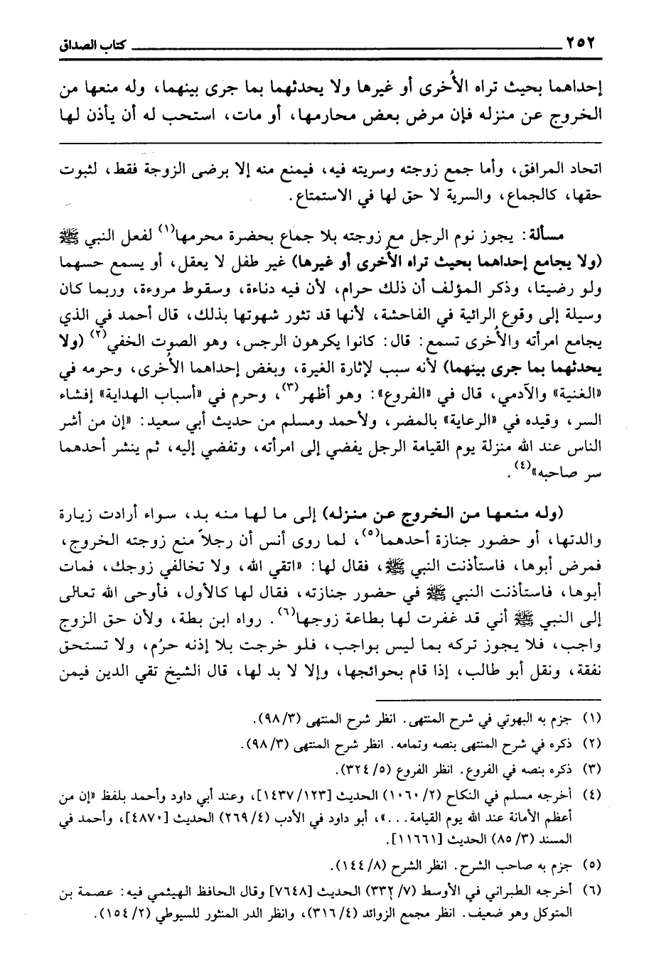 مَسْأَلَةٌ: يَجُوزُ نَوْمُ الرَّجُلِ مَعَ زَوْجَتِهِ بِلَا جِمَاعٍ بِحَضْرَةِ مَحْرَمِهَا؛ لِفِعْلِ النَّبِيِّ - صَلَّى اللَّهُ عَلَيْهِ وَسَلَّمَ - (وَلَا يُجَامِعُ إِحْدَاهُمَا بِحَيْثُ تَرَاهُ الْأُخْرَى أَوْ غَيْرِهَا) غَيْرَ طِفْلٍ لَا يَعْقِلُ أَوْ يَسْمَعُ حِسَّهُمَا، وَلَوْ رَضِيَتَا، وَذَكَرَ الْمُؤَلِّفُ أَنَّ ذَلِكَ حَرَامٌ؛ لِأَنَّ فِيهِ دَنَاءَةً وَسُقُوطَ مُرُوءَةٍ، وَرُبَّمَا كَانَ وَسِيلَةً إِلَى وُقُوعِ الرَّائِيَةِ فِي الْفَاحِشَةِ؛ لِأَنَّهَا قَدْ تَثُورُ شَهْوَتُهَا بِذَلِكَ، قَالَ أَحْمَدُ فِي الَّذِي يُجَامِعُ امْرَأَتَهُ وَالْأُخْرَى تَسْمَعُ، قَالَ: كَانُوا يَكْرَهُونَ الرِّجْسَ، وَهُوَ الصَّوْتُ الْخَفِيُّ (وَلَا يُحَدِّثُهُمَا بِمَا جَرَى بَيْنَهُمَا) ؛ لِأَنَّهُ سَبَبٌ لِإِثَارَةِ الْغَيْرَةِ وَبُغْضِ إِحْدَاهُمَا الْأُخْرَى، وَحَرَّمَهُ فِي " الْغُنْيَةِ " وَالْآدَمِيُّ، قَالَ فِي " الْفُرُوعِ ": وَهُوَ أَظْهَرُ وَحُرِّمَ فِي " أَسْبَابِ الْهِدَايَةِ " إِفْشَاءُ السِّرِّ، وَقَيَّدَهُ فِي " الرِّعَايَةِ " بِالْمُضِرِّ، وَلِأَحْمَدَ وَمُسْلِمٍ مِنْ حَدِيثِ أَبِي سَعِيدٍ: «إِنَّ مِنْ أَشَرِّ النَّاسِ عِنْدَ اللَّهِ مَنْزِلَةً يَوْمَ الْقِيَامَةِ الرَّجُلُ يُفْضِي إِلَى امْرَأَتِهِ وَتُفْضِي إِلَيْهِ، ثُمَّ يَنْشُرُ أَحَدُهُمَا سِرَّ صَاحِبِهِ» .