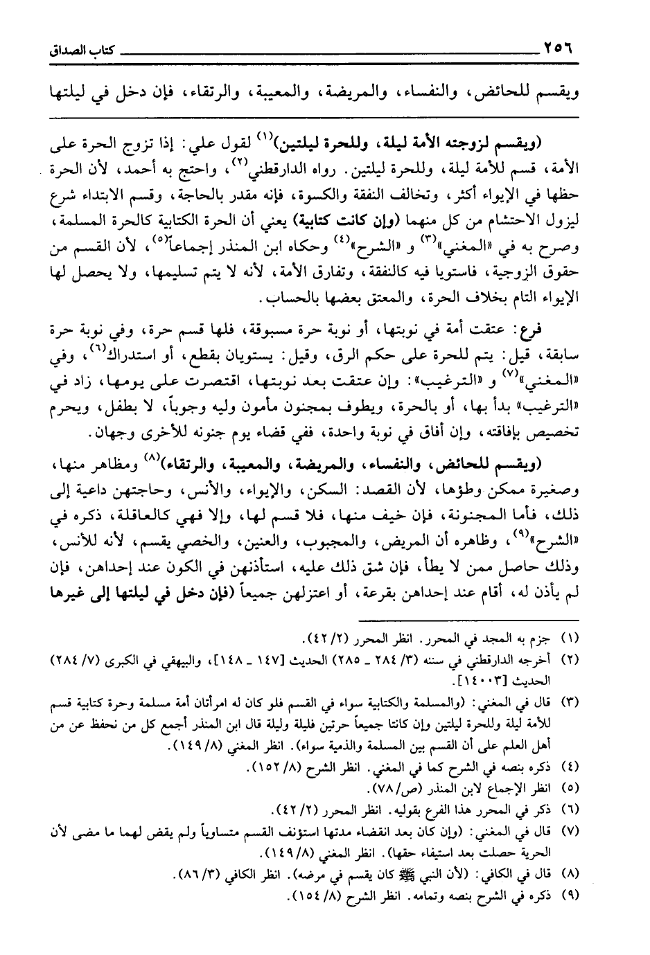 ـــــــــــــــــــــــــــــQ (وَيَقْسِمُ لِزَوْجَتِهِ الْأَمَةِ لَيْلَةً وَلِلْحُرَّةِ لَيْلَتَيْنِ) ؛ لِقَوْلِ عَلِيٍّ: إِذَا تَزَوَّجَ الْحُرَّةَ عَلَى الْأَمَةِ، قَسَمَ لِلْأَمَةِ لَيْلَةً وَلِلْحُرَّةِ لَيْلَتَيْنِ رَوَاهُ الدَّارَقُطْنِيُّ، وَاحْتَجَّ بِهِ أَحْمَدُ؛ لِأَنَّ الْحُرَّةَ حَظُّهَا فِي الْإِيوَاءِ أَكْثَرُ، وَتُخَالِفُ النَّفَقَةُ وَالْكُسْوَةُ، فَإِنَّهُ مُقَدَّرٌ بِالْحَاجَةِ، وَقَسْمُ الِابْتِدَاءِ شُرِعَ لِيَزُولَ الِاحْتِشَامُ مِنْ كُلٍّ مِنْهَا (وَإِنْ كَانَتْ كِتَابِيَّةً) يَعْنِي: أَنَّ الْحُرَّةَ الْكِتَابِيَّةَ كَالْحُرَّةِ الْمُسْلِمَةِ، وَصَرَّحَ بِهِ فِي " الْمُغْنِي " و" الشَّرْحِ "، وَحَكَاهُ ابْنُ الْمُنْذِرِ إِجْمَاعًا؛ لِأَنَّ الْقَسْمَ مِنْ حُقُوقِ الزَّوْجِيَّةِ، فَاسْتَوَيَا فِيهِ كَالنَّفَقَةِ وَتُفَارِقُ الْأَمَةُ؛ لِأَنَّهُ لَا يَتِمُّ تَسْلِيمُهَا وَلَا يَحْصُلُ لَهَا الْإِيوَاءُ التَّامُّ، بِخِلَافِ الْحُرَّةِ وَالْمُعْتَقِ بَعْضُهَا بِالْحِسَابِ.