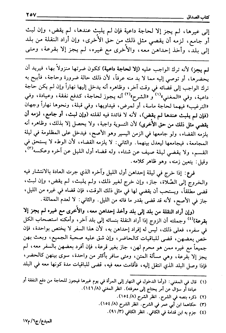 (وَإِنْ أَرَادَ النُّقْلَةَ مِنْ بَلَدٍ إِلَى بَلَدٍ وَأَخَذَ إِحْدَاهُنَّ مَعَهُ وَالْأُخْرَى مَعَ غَيْرِهِ، لَمْ يَجُزْ إِلَّا بِقُرْعَةٍ) وَجُمْلَتُهُ أَنَّ الزَّوْجَ إِذَا أَرَادَ النُّقْلَةَ بِنِسَائِهِ إِلَى بَلَدٍ آخَرَ وَأَمْكَنَهُ اسْتِصْحَابُ الْكُلِّ فِي سَفَرِهِ، فَعَلَى ذَلِكَ لَيْسَ لَهُ إِفْرَادُ إِحْدَاهُنَّ بِهِ؛ لِأَنَّ هَذَا السَّفَرَ لَا يَخْتَصُّ بِوَاحِدَةٍ، فَإِنْ خَصَّ بَعْضَهُنَّ قَضَى لِلْبَاقِيَاتِ كَالْحَاضِرِ، وَإِنْ شَقَّ عَلَيْهِ صُحْبَةُ الْجَمِيعِ، وَبَعَثَ بِهِنَّ جَمِيعًا مَعَ غَيْرِهِ مِمَّنْ هُوَ مُحَرَّمٌ لَهُنَّ - جَازَ بِغَيْرِ قُرْعَةٍ، فَإِنْ أَفْرَدَ بِعْضَهُنَّ بِالسَّفَرِ مَعَهُ لَمْ يَجُزْ إِلَّا بِقُرْعَةٍ، وَهِيَ مَسْأَلَةُ الْمَتْنِ، وَمَتَى سَافَرَ بِأَكْثَرَ مِنْ وَاحِدَةٍ سَوَّى بَيْنَهُنَّ كَالْحَضَرِ، فَإِذَا وَصَلَ الْبَلَدَ الَّذِي انْتَقَلَ إِلَيْهِ، فَأَقَامَتْ مَعَهُ فِيهِ قَضَى لِلْبَاقِيَاتِ مُدَّةَ كَوْنِهَا مَعَهُ فِي الْبَلَدِ