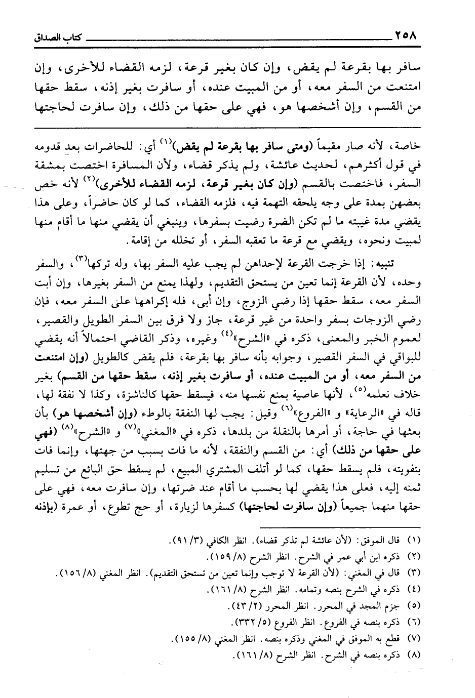 ـــــــــــــــــــــــــــــQخَاصَّةً؛ لِأَنَّهُ صَارَ مُقِيمًا (وَمَتَى سَافَرَ بِهَا بِقُرْعَةٍ لَمْ يَقْضِ) أَيْ: لِلْحَاضِرَاتِ بَعْدَ قُدُومِهِ فِي قَوْلِ أَكْثَرِهِمْ؛ لِحَدِيثِ عَائِشَةَ، وَلَمْ يَذْكُرْ قَضَاءً؛ وَلِأَنَّ الْمُسَافِرَةَ اخْتُصَّتْ بِمَشَقَّةِ السَّفَرِ، فَاخْتُصَّتْ بِالْقَسْمِ (وَإِنْ كَانَ بِغَيْرِ قُرْعَةٍ لَزِمَهُ الْقَضَاءُ لِلْأُخْرَى) ؛ لِأَنَّهُ خَصَّ بَعْضَهُنَّ بِمُدَّةٍ عَلَى وَجْهٍ يَلْحَقُهُ التُّهْمَةُ فِيهِ، فَلَزِمَهُ الْقَضَاءُ كَمَا لَوْ كَانَ حَاضِرًا، وَعَلَى هَذَا يَقْضِي مُدَّةَ غَيْبَتِهِ مَا لَمْ تَكُنِ الضَّرَّةُ رَضِيَتْ بِسَفَرِهَا، وَيَنْبَغِي أَنْ يَقْضِيَ مِنْهَا مَا أَقَامَ مِنْهَا لِمَبِيتٍ وَنَحْوِهِ، وَيَقْضِي مَعَ قُرْعَةِ مَا تَعَقَّبَهُ السَّفَرُ أَوْ تَخَلَّلَهُ مِنْ إِقَامَةٍ.