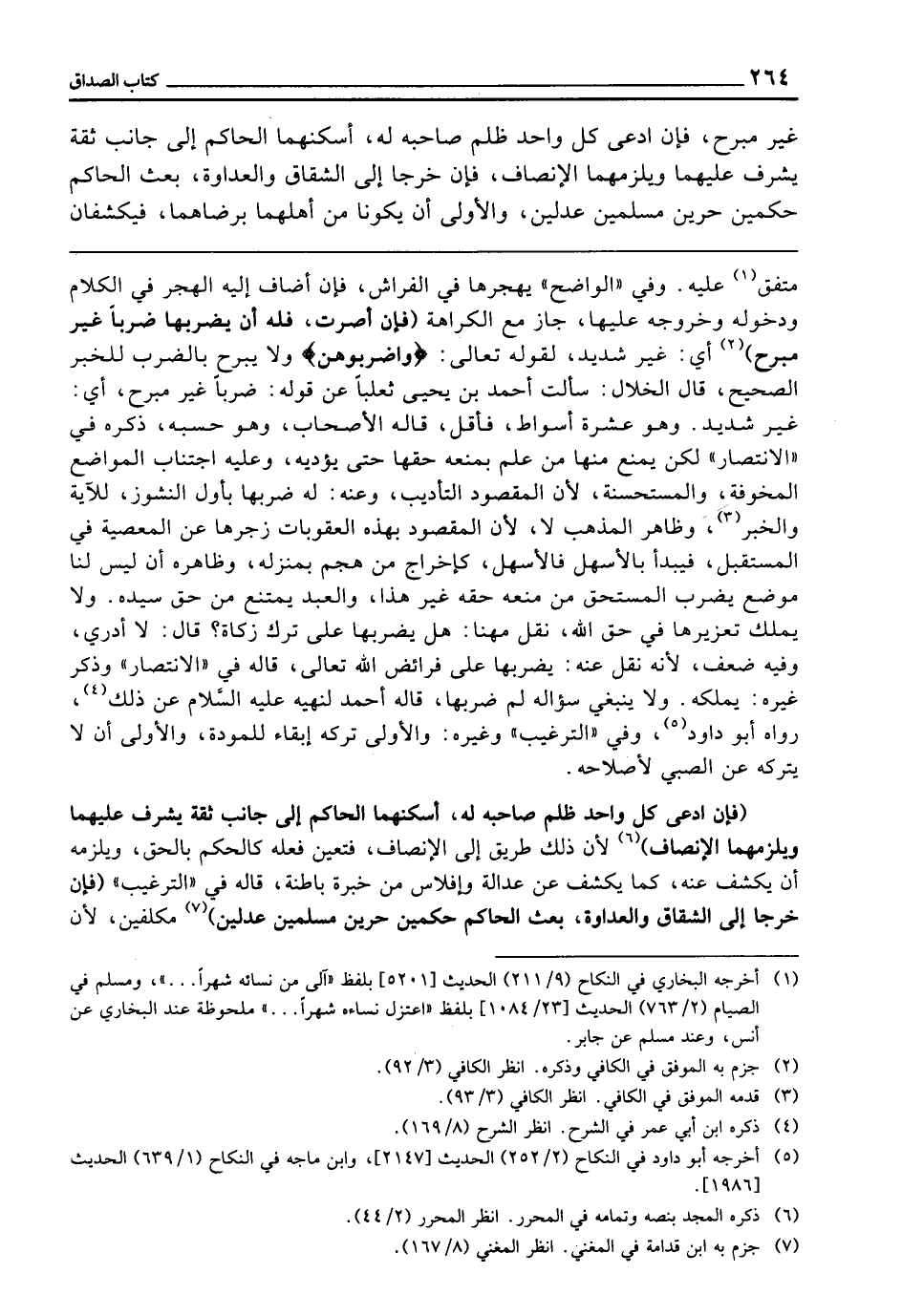 غَيْرَ مُبَرِّحٍ، فَإِنِ ادَّعَى كُلُّ وَاحِدٍ ظُلْمَ صَاحِبِهِ لَهُ، أَسْكَنَهُمَا الْحَاكِمُ إِلَى جَانِبِ ثِقَةٍ، يُشْرِفُ عَلَيْهِمَا، وَيُلْزِمْهُمَا الْإِنْصَافَ، فَإِنْ خَرَجَا إِلَى الشِّقَاقِ وَالْعَدَاوَةِ، بَعَثَ الْحَاكِمُ حَكَمَيْنِ حُرَّيْنِ مُسْلِمَيْنِ عَدْلَيْنِ، وَالْأَوْلَى أَنْ يَكُونَا مِنْ أَهْلِهِمَا بِرِضَاهُمَا، فَيَكْشِفَانِ
