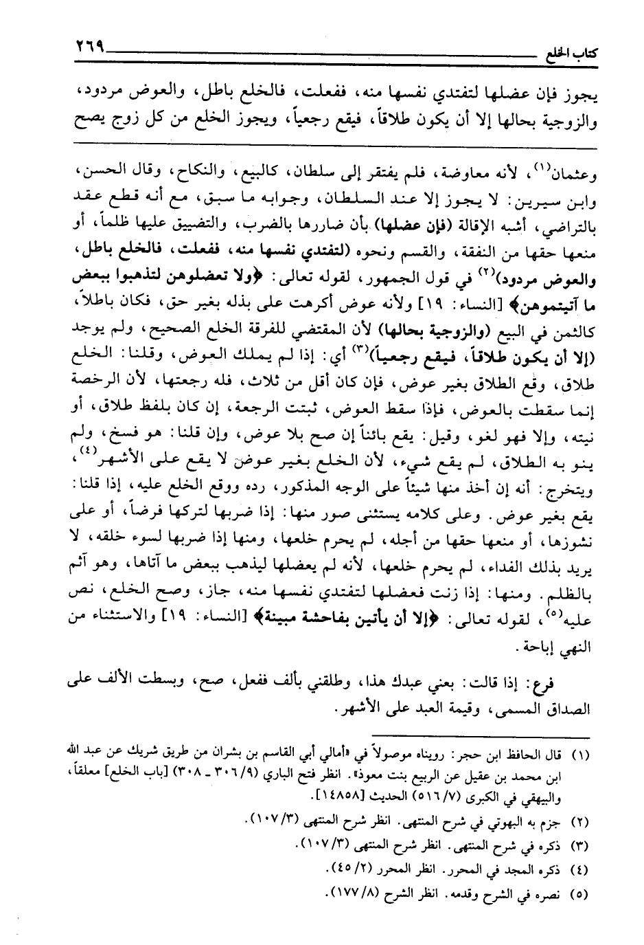 ـــــــــــــــــــــــــــــQوَعُثْمَانَ؛ لِأَنَّهُ مُعَاوَضَةٌ، فَلَمْ يَفْتَقِرْ إِلَى سُلْطَانٍ كَالْبَيْعِ وَالنِّكَاحِ، وَقَالَ الْحَسَنُ وَابْنُ سِيرِينَ: لَا يَجُوزُ إِلَّا عِنْدَ السُّلْطَانِ، وَجَوَابُهُ مَا سَبَقَ مَعَ أَنَّهُ قَطْعُ عَقْدٍ بِالتَّرَاضِي أَشْبَهَ الْإِقَالَةَ (فَإِنْ عَضَلَهَا) بِأَنْ ضَارَرَهَا بِالضَّرْبِ وَالتَّضْيِيقِ عَلَيْهَا ظُلْمًا، أَوْ مَنَعَهَا حَقَّهَا مِنَ النَّفَقَةِ وَالْقَسْمِ وَنَحْوِهِ (لِتَفْتَدِيَ نَفْسَهَا مِنْهُ، فَفَعَلَتْ، فَالْخُلْعُ بَاطِلٌ، وَالْعِوَضُ مَرْدُودٌ) فِي قَوْلِ الْجُمْهُورِ؛ لِقَوْلِهِ تَعَالَى: {وَلا تَعْضُلُوهُنَّ لِتَذْهَبُوا بِبَعْضِ مَا آتَيْتُمُوهُنَّ} [النساء: 19] ؛ وَلِأَنَّهُ عِوَضٌ أُكْرِهَتْ عَلَى بَذْلِهِ بِغَيْرِ حَقٍّ، فَكَانَ بَاطِلًا كَالثَّمَنِ فِي الْبَيْعِ (وَالزَّوْجِيَّةُ بِحَالِهَا) ؛ لِأَنَّ الْمُقْتَضِيَ لِلْفُرْقَةِ الْخُلْعُ الصَّحِيحُ وَلَمْ يُوجَدْ (إِلَّا أَنْ يَكُونَ طَلَاقًا فَيَقَعَ رَجْعِيًّا) أَيْ: إِذَا لَمْ يَمْلِكِ الْعِوَضَ، وَقُلْنَا: الْخُلْعُ طَلَاقٌ، وَقَعَ الطَّلَاقُ بِغَيْرِ عِوَضٍ، فَإِنْ كَانَ أَقَلَّ مِنْ ثَلَاثٍ فَلَهُ رَجْعَتُهَا؛ لِأَنَّ الرُّخْصَةَ إِنَّمَا سَقَطَتْ بِالْعِوَضِ، فَإِذَا سَقَطَ الْعِوَضُ ثَبَتَتِ الرَّجْعَةُ - إِنْ كَانَ بِلَفْظِ طَلَاقٍ أَوْ نِيَّتِهِ - وَإِلَّا فَهُوَ لَغْوٌ، وَقِيلَ: يَقَعُ بَائِنًا إِنْ صَحَّ بِلَا عِوَضٍ، وَإِنْ قُلْنَا: هُوَ فَسْخٌ وَلَمْ يَنْوِ بِهِ الطَّلَاقَ لَمْ يَقَعْ شَيْءٌ؛ لِأَنَّ الْخُلْعَ بِغَيْرِ عِوَضٍ لَا يَقَعُ عَلَى الْأَشْهَرِ، وَيَتَخَرَّجُ أَنَّهُ إِنْ أَخَذَ مِنْهَا شَيْئًا عَلَى الْوَجْهِ الْمَذْكُورِ رَدَّهُ وَوَقَعَ الْخُلْعُ عَلَيْهِ، إِذَا قُلْنَا: يَقَعُ بِغَيْرِ عِوَضٍ.