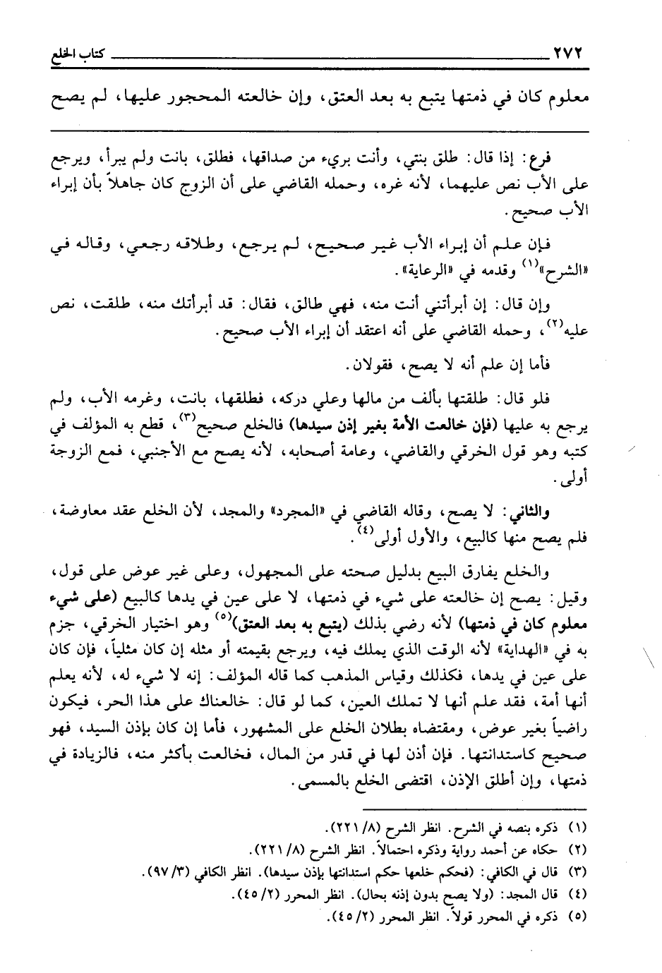 فَأَمَّا إِنْ عَلِمَ أَنَّهُ لَا يَصِحُّ فَقَوْلَانِ: فَلَوْ قَالَ: طَلَّقْتُهَا بِأَلْفٍ مِنْ مَالِهَا، وَعَلَيَّ دَرْكُهُ فَطَلَّقَهَا - بَانَتْ، وَغَرَّمَهُ الْأَبُ، وَلَمْ يَرْجِعْ بِهِ عَلَيْهَا (فَإِنْ خَالَعَتِ الْأَمَةُ بِغَيْرِ إِذْنِ سَيِّدِهَا) فَالْخُلْعُ صَحِيحٌ، قَطَعَ بِهِ الْمُؤَلِّفُ فِي كُتُبِهِ، وَهُوَ قَوْلُ الْخِرَقِيِّ، وَالْقَاضِي وَعَامَّةِ أَصْحَابِهِ؛ لِأَنَّهُ يَصِحُّ مَعَ الْأَجْنَبِيِّ، فَمَعَ الزَّوْجَةِ أَوْلَى.
