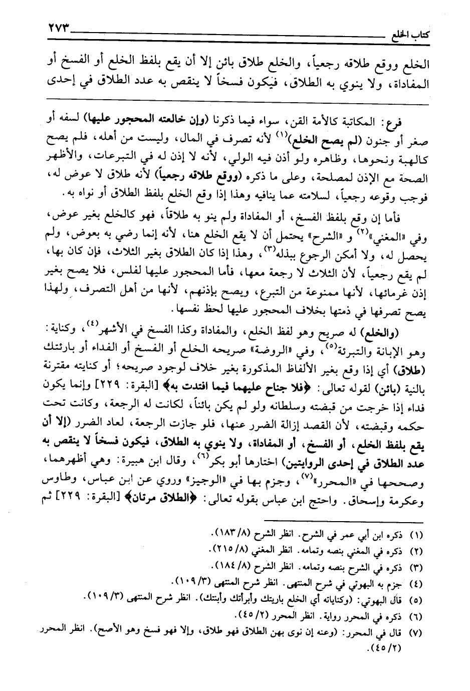 (وَالْخُلْعُ) لَهُ صَرِيحٌ، وَهُوَ لَفْظُ الْخُلْعِ، وَالْمُفَادَاةِ وَكَذَا الْفَسْخُ فِي الْأَشْهَرِ، وَكِنَايَةٌ: وَهُوَ الْإِبَانَةُ وَالتَّبْرِئَةُ، وَفِي " الرَّوْضَةِ ": صَرِيحَهُ الْخُلْعُ، أَوِ الْفَسْخُ، أَوِ الْفِدَاءُ، أَوْ بَارَئْتُكِ (طَلَاقٌ) أَيْ: إِذَا وَقَعَ بِغَيْرِ الْأَلْفَاظِ الْمَذْكُورَةِ بِغَيْرِ خِلَافٍ لِوُجُودِ صَرِيحِهِ أَوْ كِنَايَتِهِ مُقْتَرِنَةً بِالنِّيَّةِ (بَائِنٌ) ؛ لِقَوْلِهِ تَعَالَى: {فَلا جُنَاحَ عَلَيْهِمَا فِيمَا افْتَدَتْ بِهِ} [البقرة: 229] وَإِنَّمَا يَكُونُ فِدَاءً إِذَا خَرَجَتْ مِنْ قَبْضَتِهِ وَسُلْطَانِهِ، وَلَوْ لَمْ يَكُنْ بَائِنًا لَكَانَتْ لَهُ الرَّجْعَةُ، وَكَانَتْ تَحْتَ حُكْمِهِ وَقَبْضَتِهِ؛ لِأَنَّ الْقَصْدَ إِزَالَةُ الضَّرَرِ عَنْهَا، فَلَوْ جَازَتِ الرَّجْعَةُ لَعَادَ الضَّرَرُ (إِلَّا أَنْ يَقَعَ بِلَفْظِ الْخُلْعِ أَوِ الْفَسْخِ أَوِ الْمُفَادَاةِ، وَلَا يَنْوِي بِهِ الطَّلَاقَ فَيَكُونُ فَسْخًا لَا يَنْقُصُ بِهِ عَدَدُ الطَّلَاقِ فِي إِحْدَى الرِّوَايَتَيْنِ) اخْتَارَهَا أَبُو بَكْرٍ، وَقَالَ ابْنُ هُبَيْرَةَ: وَهِيَ أَظْهَرُهُمَا، وَصَحَّحَهَا فِي " الْمُحَرَّرِ "، وَجَزَمَ بِهَا فِي " الْوَجِيزِ "، وَرُوِيَ عَنِ ابْنِ عَبَّاسٍ، وَطَاوُسٍ، وَعِكْرِمَةَ، وَإِسْحَاقَ، وَاحْتَجَّ ابْنُ عَبَّاسٍ بِقَوْلِهِ تَعَالَى: {الطَّلاقُ مَرَّتَانِ} [البقرة: 229] ثُمَّ