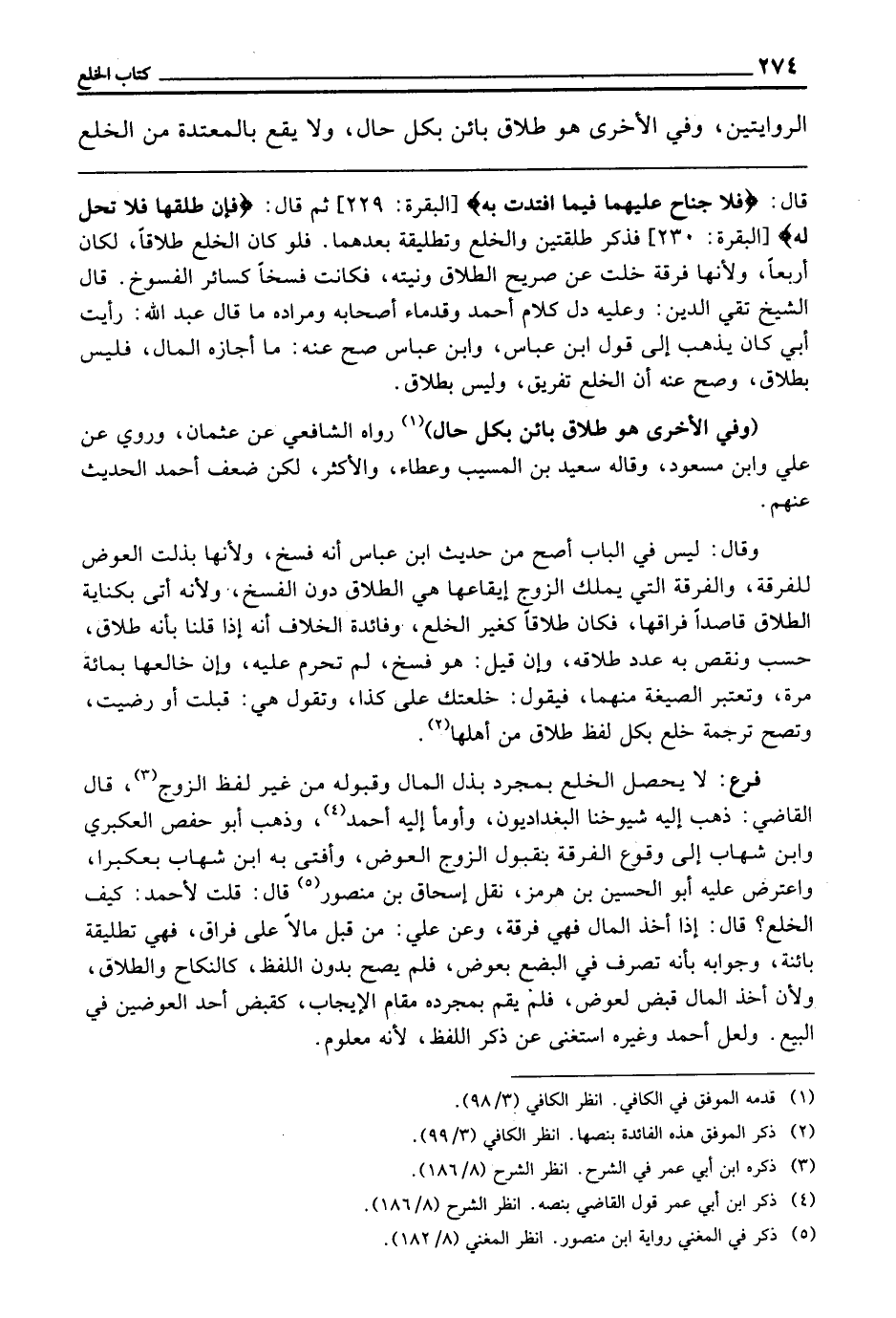 ـــــــــــــــــــــــــــــQقَالَ: {فَلا جُنَاحَ عَلَيْهِمَا فِيمَا افْتَدَتْ بِهِ} [البقرة: 229] ثُمَّ قَالَ: {فَإِنْ طَلَّقَهَا فَلا تَحِلُّ لَهُ} [البقرة: 230] فَذَكَرَ طَلْقَتَيْنِ، وَالْخُلْعَ، وَتَطْلِيقَهُ بَعْدَهُمَا، فَلَوْ كَانَ الْخُلْعُ طَلَاقًا لَكَانَ أَرْبَعًا؛ وَلِأَنَّهَا فُرْقَةٌ خَلَتْ عَنْ صَرِيحِ الطَّلَاقِ وَنِيَّتِهِ، فَكَانَتْ فَسْخًا كَسَائِرِ الْفُسُوخِ، قَالَ الشَّيْخُ تَقِيُّ الدِّينِ: وَعَلَيْهِ دَلَّ كَلَامُ أَحْمَدَ وَقُدَمَاءِ أَصْحَابِهِ، وَمُرَادُهُ: مَا قَالَ عَبْدُ اللَّهِ: رَأَيْتُ أَبِي كَانَ يَذْهَبُ إِلَى قَوْلِ ابْنِ عَبَّاسٍ، وَابْنُ عَبَّاسٍ صَحَّ عَنْهُ: مَا أَجَازَهُ الْمَالُ فَلَيْسَ بِطَلَاقٍ، وَصَحَّ عَنْهُ أَنَّ الْخُلْعَ تَفْرِيقٌ وَلَيْسَ بِطَلَاقٍ.