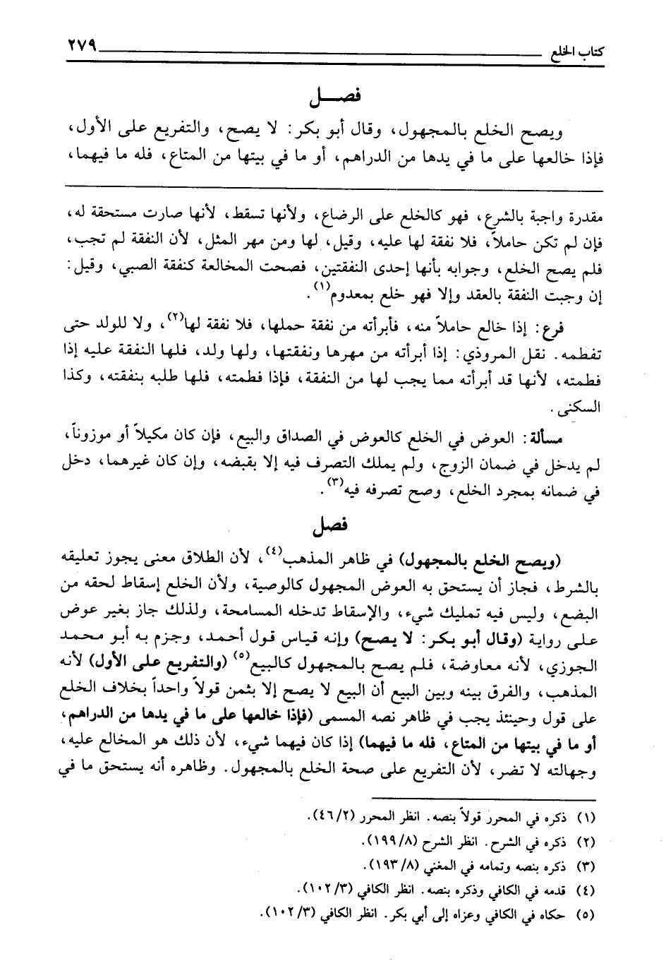 فَصْلٌ (وَيَصِحُّ الْخُلْعُ بِالْمَجْهُولِ) فِي ظَاهِرِ الْمَذْهَبِ؛ لِأَنَّ الطَّلَاقَ مَعْنًى يَجُوزُ تَعْلِيقُهُ بِالشَّرْطِ، فَجَازَ أَنْ يَسْتَحِقَّ بِهِ الْعِوَضَ الْمَجْهُولَ كَالْوَصِيَّةِ؛ وَلِأَنَّ الْخُلْعَ إِسْقَاطٌ لِحَقِّهِ مِنِ الْبُضْعِ، وَلَيْسَ فِيهِ تَمْلِيكُ شَيْءٍ، وَالْإِسْقَاطُ تَدْخُلُهُ الْمُسَامَحَةُ؛ وَلِذَلِكَ جَازَ بِغَيْرِ عِوَضٍ - عَلَى رِوَايَةٍ، (وَقَالَ أَبُو بَكْرٍ: لَا يَصِحُّ) وَإِنَّهُ قِيَاسُ قَوْلِ أَحْمَدَ، وَجَزَمَ بِهِ أَبُو مُحَمَّدٍ الْجَوْزِيُّ؛ لِأَنَّهُ مُعَاوَضَةٌ، فَلَمْ يَصِحَّ بِالْمَجْهُولِ كَالْبَيْعِ (وَالتَّفْرِيعِ عَلَى الْأَوَّلِ) ؛ لِأَنَّهُ الْمَذْهَبُ، وَالْفَرْقُ بَيْنَهُ وَبَيْنَ الْبَيْعِ أَنَّ الْبَيْعَ لَا يَصِحُّ إِلَّا بِثَمَنٍ - قَوْلًا وَاحِدًا، بِخِلَافِ الْخُلْعِ عَلَى قَوْلٍ، وَحِينَئِذٍ يَجِبُ فِي ظَاهِرِ نَصِّهِ الْمُسَمَّى (فَإِذَا خَالَعَهَا عَلَى مَا فِي يَدِهَا مِنَ الدَّرَاهِمِ أَوْ مَا فِي بَيْتِهَا مِنَ الْمَتَاعِ، فَلَهُ مَا فِيهِمَا) إِذَا كَانَ فِيهِمَا شَيْءٌ؛ لِأَنَّ ذَلِكَ هُوَ الْمُخَالَعُ عَلَيْهِ، وَجَهَالَتُهُ لَا تَضُرُّ؛ لِأَنَّ التَّفْرِيعَ عَلَى صِحَّةِ الْخُلْعِ بِالْمَجْهُولِ، وَظَاهِرُهُ: أَنَّهُ يَسْتَحِقُّ مَا فِي