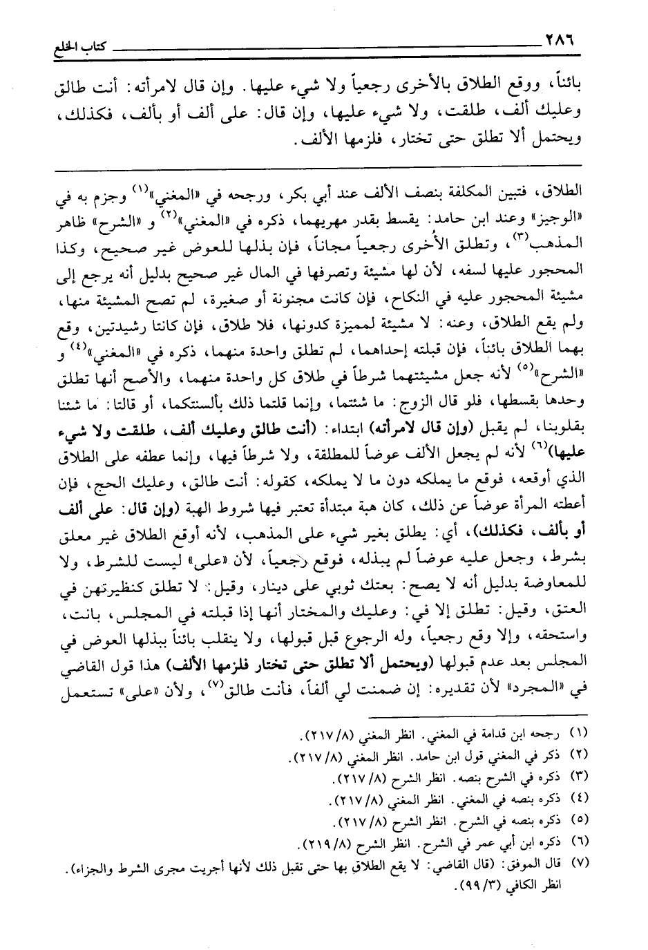 ـــــــــــــــــــــــــــــQالطَّلَاقُ، فَتَبِينُ الْمُكَلَّفَةُ بِنِصْفِ الْأَلْفِ عِنْدَ أَبِي بَكْرٍ، وَرَجَّحَهُ فِي " الْمُغْنِي "، وَجَزَمَ بِهِ فِي " الْوَجِيزِ " وَعِنْدَ ابْنِ حَامِدٍ: يَسْقُطُ بِقَدْرِ مَهْرَيْهِمَا، ذَكَرَهُ فِي " الْمُغْنِي " و" الشَّرْحِ " ظَاهِرُ الْمَذْهَبِ، وَتُطَلَّقُ الْأُخْرَى رَجْعِيًّا مَجَّانًا، فَإِنَّ بَذْلَهَا لِلْعِوَضِ غَيْرُ صَحِيحٍ، وَكَذَا الْمَحْجُورُ عَلَيْهَا لِسَفَهٍ؛ لِأَنَّ لَهَا مَشِيئَةً، وَتَصَرُّفُهَا فِي الْمَالِ غَيْرُ صَحِيحٍ، بِدَلِيلِ أَنَّهُ يَرْجِعُ إِلَى مَشِيئَةِ الْمَحْجُورِ عَلَيْهِ فِي النِّكَاحِ، فَإِنْ كَانَتْ مَجْنُونَةً أَوْ صَغِيرَةً، لَمْ تَصِحَّ الْمَشِيئَةُ مِنْهَا، وَلَمْ يَقَعِ الطَّلَاقُ، وَعَنْهُ: لَا مَشِيئَةَ لِمُمَيِّزَةٍ كَدُونِهَا، فَلَا طَلَاقَ، فَإِنْ كَانَتَا رَشِيدَتَيْنِ وَقَعَ بِهِمَا الطَّلَاقُ بَائِنًا، فَإِنْ قَبِلَتْهُ إِحْدَاهُمَا لَمْ تُطَلَّقْ وَاحِدَةٌ مِنْهُمَا، ذَكَرَهُ فِي " الْمُغْنِي " و" الشَّرْحِ "؛ لِأَنَّهُ جَعَلَ مَشِيئَتَهُمَا شَرْطًا فِي طَلَاقِ كُلِّ وَاحِدَةٍ مِنْهُمَا، وَالْأَصَحُّ أَنَّهَا تُطَلَّقُ وَحْدَهَا بِقِسْطِهَا، فَلَوْ قَالَ الزَّوْجُ: مَا شِئْتُمَا، وَإِنَّمَا قُلْتُمَا ذَلِكَ بِأَلْسِنَتِكُمَا، أَوْ قَالَتَا: مَا شِئْنَا بِقُلُوبِنَا - لَمْ يَقْبَلْ (وَإِنْ قَالَ لِامْرَأَتِهِ) ابْتِدَاءً: (أَنْتِ طَالِقٌ وَعَلَيْكِ أَلْفٌ، طُلِّقَتْ وَلَا شَيْءَ عَلَيْهَا) ؛ لِأَنَّهُ لَمْ يَجْعَلِ الْأَلْفَ عِوَضًا لِلْمُطَلَّقَةِ، وَلَا شَرْطًا فِيهَا، وَإِنَّمَا عَطَفَهُ عَلَى الطَّلَاقِ الَّذِي أَوْقَعَهُ، فَوَقَعَ مَا يَمْلِكُهُ دُونَ مَا لَا يَمْلِكُهُ، كَقَوْلِهِ: أَنْتِ طَالِقٌ وَعَلَيْكِ الْحَجُّ، فَإِنْ أَعْطَتْهُ الْمَرْأَةُ عِوَضًا عَنْ ذَلِكَ كَانَ هِبَةً مُبْتَدَأَةً تُعْتَبَرُ فِيهَا شُرُوطُ الْهِبَةِ (وَإِنْ قَالَ: عَلَى أَلْفٍ أَوْ بِأَلْفٍ، فَكَذَلِكَ) أَيْ: يُطَلِّقُ بِغَيْرِ شَيْءٍ عَلَى الْمَذْهَبِ؛ لِأَنَّهُ أَوْقَعَ الطَّلَاقَ غَيْرَ مُعَلَّقٍ بِشَرْطٍ، وَجَعَلَ عَلَيْهِ عِوَضًا لَمْ يَبْذُلْهُ، فَوَقَعَ رَجْعِيًّا؛ لِأَنَّ " عَلَى " لَيْسَتْ لِلشَّرْطِ وَلَا لِلْمُعَاوَضَةِ، بِدَلِيلِ أَنَّهُ لَا يَصِحُّ: بِعْتُكَ ثَوْبِي عَلَى دِينَارٍ، وَقِيلَ: لَا تُطَلَّقُ كَنَظِيرَتِهِنَّ فِي الْعِتْقِ، وَقِيلَ: تُطَلَّقُ إِلَّا فِي: وَعَلَيْكِ، وَالْمُخْتَارُ أَنَّهَا إِذَا قَبِلَتْهُ فِي الْمَجْلِسِ بَانَتْ وَاسْتَحَقَّهُ، وَإِلَّا وَقَعَ رَجْعِيًّا، وَلَهُ الرُّجُوعُ قَبْلَ قَبُولِهَا، وَلَا يَنْقَلِبُ بَائِنًا بِبَذْلِهَا الْعِوَضَ فِي الْمَجْلِسِ بَعْدَ عَدَمِ قَبُولِهَا (وَيُحْتَمَلُ أَلَّا تُطَلَّقَ حَتَّى تَخْتَارَ، فَلَزِمَهَا الْأَلْفُ) هَذَا قَوْلُ الْقَاضِي فِي " الْمُجَرَّدِ "؛ لِأَنَّ تَقْدِيرَهُ: إِنْ ضَمِنْتِ لِي أَلْفًا فَأَنْتِ طَالِقٌ؛ وَلِأَنَّ " عَلَى " تُسْتَعْمَلُ