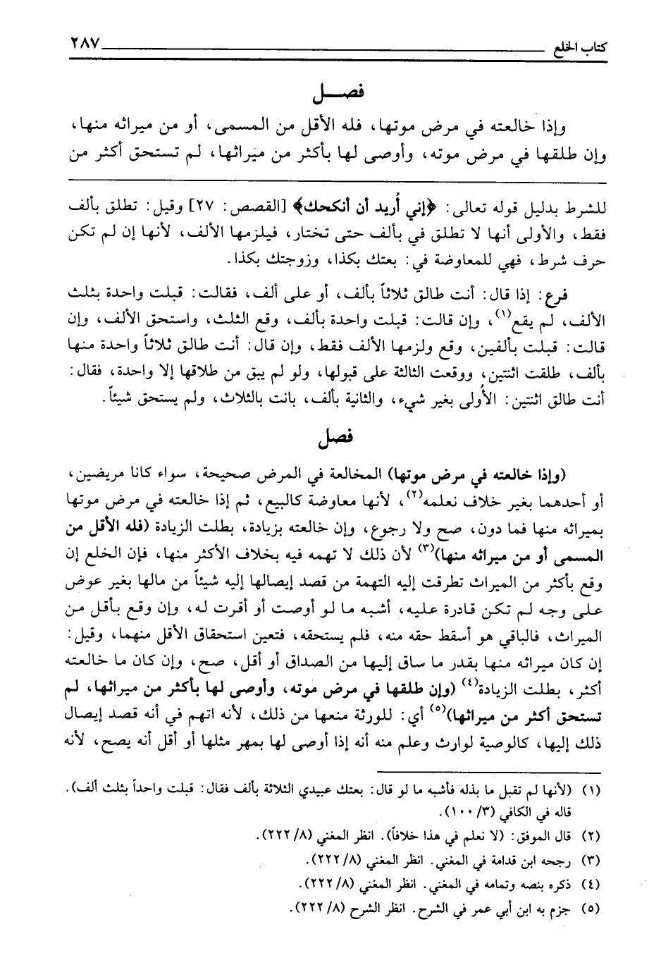 فَصْلٌ (وَإِذَا خَالَعَتْهُ فِي مَرَضِ مَوْتِهَا) الْمُخَالَعَةُ فِي الْمَرَضِ صَحِيحَةٌ، سَوَاءً كَانَا مَرِيضَيْنِ أَوْ أَحَدُهُمَا - بِغَيْرِ خِلَافٍ نَعْلَمُهُ؛ لِأَنَّهَا مُعَاوَضَةٌ كَالْبَيْعِ، ثُمَّ إِذَا خَالَعَتْهُ فِي مَرَضِ مَوْتِهَا بِمِيرَاثِهِ مِنْهَا فَمَا دُونَ - صَحَّ وَلَا رُجُوعَ، وَإِنْ خَالَعَتْهُ بِزِيَادَةٍ بَطَلَتِ الزِّيَادَةُ (فَلَهُ الْأَقَلُّ مِنَ الْمُسَمَّى أَوْ مِنْ مِيرَاثِهِ مِنْهَا) ؛ لِأَنَّ ذَلِكَ لَا تُهْمَةَ فِيهِ - بِخِلَافِ الْأَكْثَرِ مِنْهَا - فَإِنَّ الْخُلْعَ إِنْ وَقَعَ بِأَكْثَرَ مِنَ الْمِيرَاثِ تَطَرَّقَتْ إِلَيْهِ التُّهْمَةُ مِنْ قَصْدِ إِيصَالِهَا إِلَيْهِ شَيْئًا مِنْ مَالِهَا بِغَيْرِ عِوَضٍ عَلَى وَجْهٍ لَمْ تَكُنْ قَادِرَةً عَلَيْهِ، أَشْبَهَ مَا لَوْ أَوْصَتْ أَوْ أَقَرَّتْ لَهُ، وَإِنْ وَقَّعَ بِأَقَلَّ مِنَ الْمِيرَاثِ، فَالْبَاقِي هُوَ أَسْقَطَ حَقَّهُ مِنْهُ، فَلَمْ يَسْتَحِقُّهُ، فَتَعَيَّنَ اسْتِحْقَاقُ الْأَقَلِّ مِنْهُمَا، وَقِيلَ: إِنْ كَانَ مِيرَاثُهُ مِنْهَا بِقَدْرِ مَا سَاقَ إِلَيْهَا مِنَ الصَّدَاقِ أَوْ أَقَلَّ، صَحَّ، وَإِنْ كَانَ مَا خَالَعَتْهُ أَكْثَرَ، بَطَلَتِ الزِّيَادَةُ (وَإِنْ طَلَّقَهَا فِي مَرَضِ مَوْتِهِ، وَأَوْصَى لَهَا بِأَكْثَرَ مِنْ مِيرَاثِهَا، لَمْ تَسْتَحِقَّ أَكْثَرَ مِنْ مِيرَاثِهَا) أَيْ: لِلْوَرَثَةِ مَنْعُهَا مِنْ ذَلِكَ؛ لِأَنَّهُ اتُّهِمَ فِي أَنَّهُ قَصَدَ إِيصَالَ ذَلِكَ إِلَيْهَا، كَالْوَصِيَّةِ لِوَارِثٍ، وَعُلِمَ مِنْهُ أَنَّهُ إِذَا أَوْصَى لَهَا بِمَهْرِ مِثْلِهَا أَوْ أَقَلَّ أَنَّهُ يَصِحُّ؛ لِأَنَّهُ