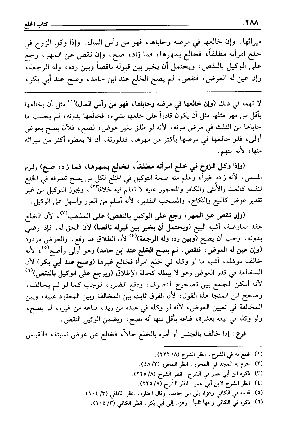 مِيرَاثِهَا، وَإِنْ خَالَعَهَا فِي مَرَضِهِ وَحَابَاهَا، فَهُوَ مِنْ رَأْسِ الْمَالِ. وَإِذَا وَكَّلَ الزوج فِي خَلْعِ امْرَأَتِهِ مُطْلَقًا، فَخَالَعَ بِمَهْرِهَا، فَمَا زَادَ صَحَّ، وَإِنْ نَقَصَ عَنِ الْمَهْرِ، رَجَعَ عَلَى الْوَكِيلِ بِالنَّقْصِ، وَيُحْتَمَلُ أَنْ يُخَيَّرَ بَيْنَ قَبُولِهِ نَاقِصًا، وَبَيْنَ رَدِّهِ، وَلَهُ الرَّجْعَةُ، وَإِنْ عَيَّنَ لَهُ الْعِوَضَ، فَنَقُصَ لَمْ يَصِحَّ الْخُلْعُ عِنْدَ ابْنِ حَامِدٍ، وَصَحَّ عِنْدَ أَبِي بَكْرٍ،
