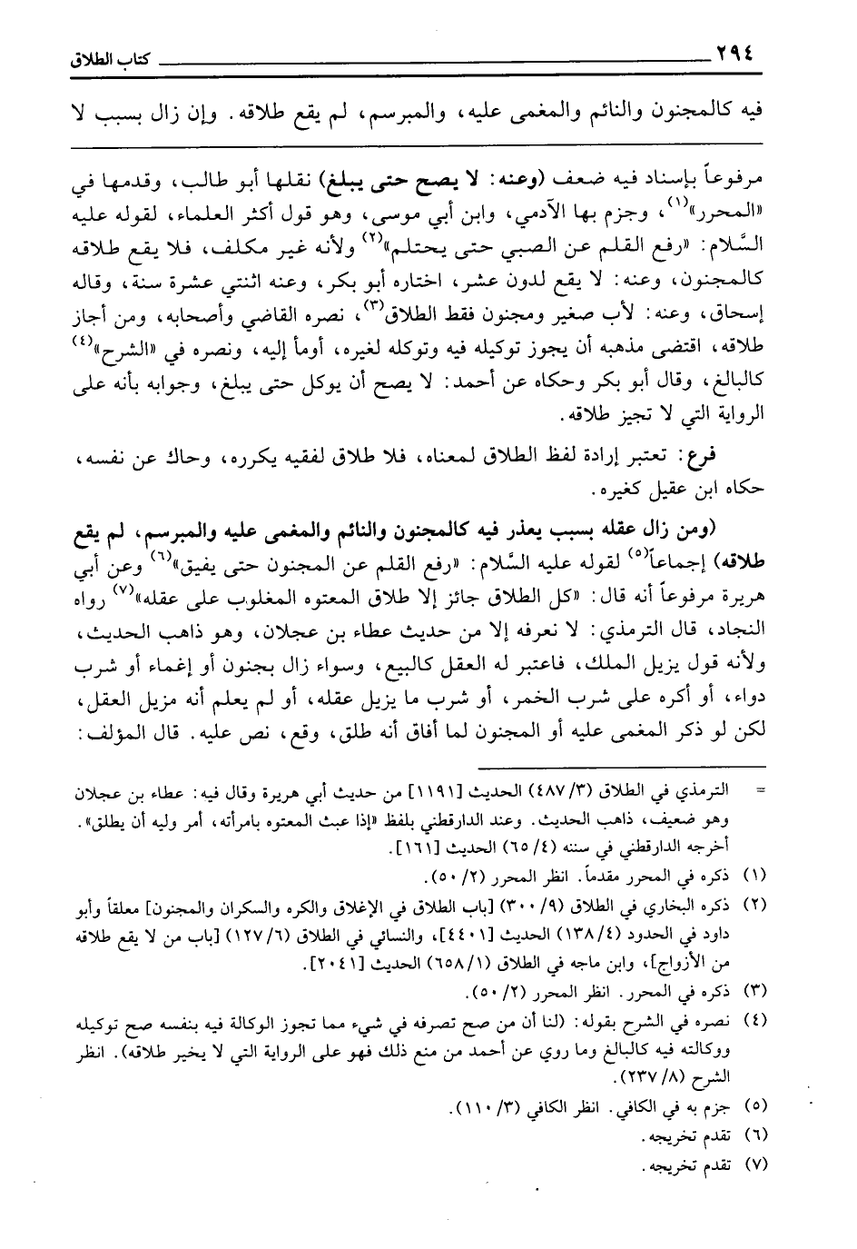 (وَمَنْ زَالَ عَقْلُهُ بِسَبَبٍ يُعْذَرُ فِيهِ كَالْمَجْنُونِ، وَالنَّائِمِ، وَالْمُغْمَى عَلَيْهِ، وَالْمُبَرْسَمِ - لَمْ يَقَعْ طَلَاقُهُ) إِجْمَاعًا؛ لِقَوْلِهِ - عَلَيْهِ السَّلَامُ -: «رُفِعَ الْقَلَمُ عَنِ الْمَجْنُونِ حَتَّى يُفِيقَ» وَعَنْ أَبِي هُرَيْرَةَ مَرْفُوعًا أَنَّهُ قَالَ: «كُلُّ الطَّلَاقِ جَائِزٌ، إِلَّا طَلَاقَ الْمَعْتُوهِ الْمَغْلُوبِ عَلَى عَقْلِهِ» رَوَاهُ النِّجَادُ، قَالَ التِّرْمِذِيُّ: لَا نَعْرِفُهُ إِلَّا مِنْ حَدِيثِ عَطَاءِ بْنِ عَجْلَانِ، وَهُوَ ذَاهِبُ الْحَدِيثِ؛ وَلِأَنَّهُ قَوْلٌ يُزِيلُ الْمِلْكَ، فَاعْتُبِرَ لَهُ الْعَقْلُ كَالْبَيْعِ، وَسَوَاءٌ زَالَ بِجُنُونٍ، أَوْ إِغْمَاءٍ، أَوْ شُرْبِ دَوَاءٍ، أَوْ أُكْرِهَ عَلَى شُرْبِ الْخَمْرِ، أَوْ شُرْبِ مَا يُزِيلُ عَقْلَهُ، أَوْ لَمْ يَعْلَمْ أَنَّهُ مُزِيلُ الْعَقْلِ، لَكِنْ لَوْ ذَكَرَ الْمُغْمَى عَلَيْهِ أَوِ الْمَجْنُونُ لَمَّا أَفَاقَ أَنَّهُ طَلَّقَ - وَقَعَ - نَصَّ عَلَيْهِ، قَالَ الْمُؤَلِّفُ:
