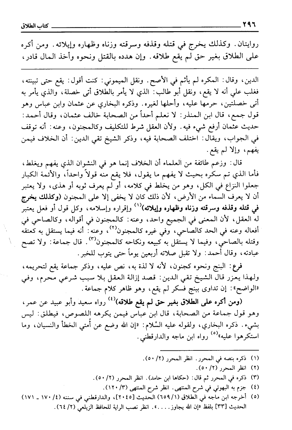 (وَمَنْ أُكْرِهَ عَلَى الطَّلَاقِ بِغَيْرِ حَقٍّ لَمْ يَقَعْ طَلَاقُهُ) رَوَاهُ سَعِيدٌ، وَأَبُو عُبَيْدٍ عَنْ عُمَرَ، وَهُوَ قَوْلُ جَمَاعَةٍ مِنَ الصَّحَابَةِ، قَالَ ابْنُ عَبَّاسٍ فِيمَنْ يُكْرِهُهُ اللُّصُوصُ فَيُطَلِّقُ: لَيْسَ بِشَيْءٍ. ذَكَرَهُ الْبُخَارِيُّ؛ وَلِقَوْلِهِ - عَلَيْهِ السَّلَامُ -: «إِنَّ اللَّهَ وَضَعَ عَنْ أُمَّتِي الْخَطَأَ، وَالنِّسْيَانَ، وَمَا اسْتُكْرِهُوا عَلَيْهِ» رَوَاهُ ابْنُ مَاجَهْ وَالدَّارَقُطْنِيُّ،