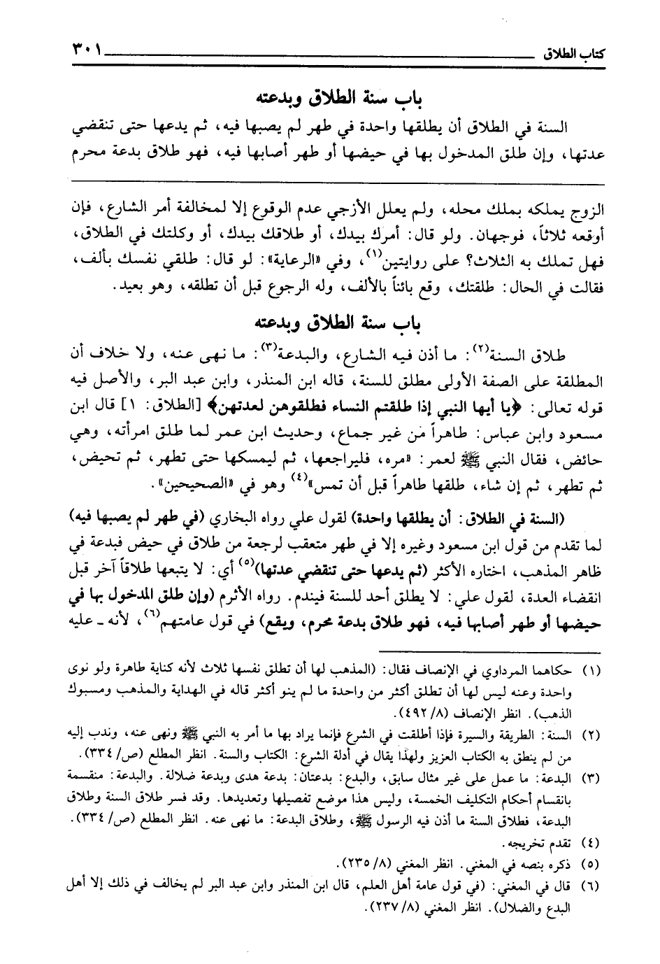 سُنَّةِ الطَّلَاقِ وَبِدْعَتِهِ طَلَاقُ السُّنَّةِ: مَا أَذِنَ فِيهِ الشَّارِعُ، وَالْبِدْعَةِ: مَا نَهَى عَنْهُ، وَلَا خِلَافَ أَنَّ الْمُطَلَّقَةَ عَلَى الصِّفَةِ الْأُولَى مُطْلَقٌ لِلسُّنَّةِ، قَالَهُ ابْنُ الْمُنْذِرِ وَابْنُ عَبْدِ الْبَرِّ، وَالْأَصْلُ فِيهِ قَوْله تَعَالَى: {يَا أَيُّهَا النَّبِيُّ إِذَا طَلَّقْتُمُ النِّسَاءَ فَطَلِّقُوهُنَّ لِعِدَّتِهِنَّ} [الطلاق: 1] قَالَ ابْنُ مَسْعُودٍ وَابْنُ عَبَّاسٍ: طَاهِرًا مِنْ غَيْرِ جِمَاعٍ، وَحَدِيثُ «ابْنِ عُمَرَ لَمَّا طَلَّقَ امْرَأَتَهُ وَهِيَ حَائِضٌ فَقَالَ النَّبِيُّ - صَلَّى اللَّهُ عَلَيْهِ وَسَلَّمَ - لِعُمَرَ: مُرْهُ فَلْيُرَاجِعْهَا، ثُمَّ لِيُمْسِكْهَا حَتَّى تَطْهُرَ، ثُمَّ تَحِيضَ، ثُمَّ تَطْهُرَ، ثُمَّ إِنْ شَاءَ طَلَّقَهَا طَاهِرًا قَبْلَ أَنْ تَمَسَّ» وَهُوَ فِي " الصَّحِيحَيْنِ ".