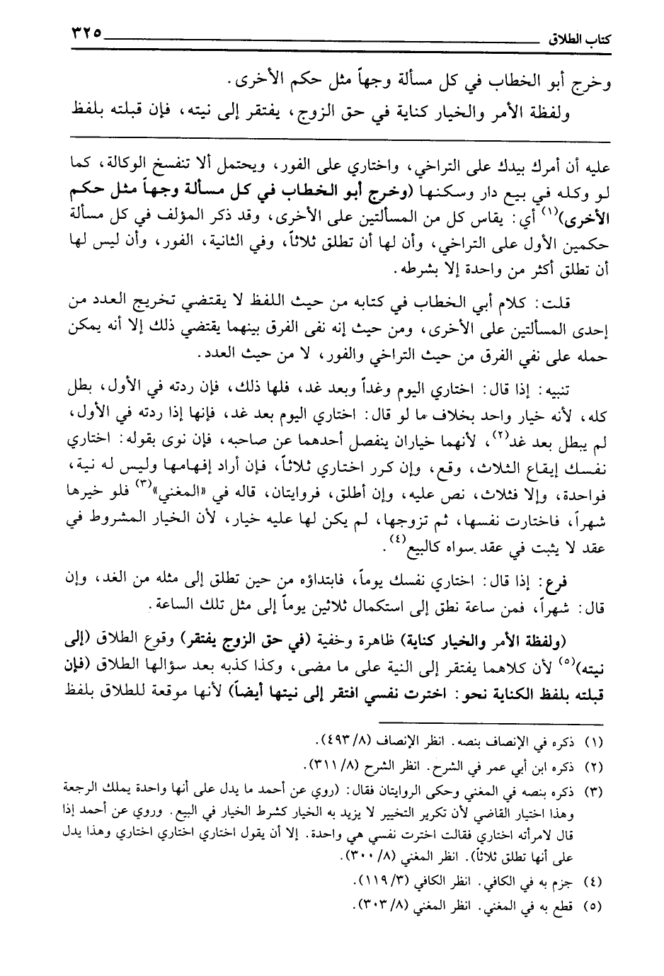 وَخَرَّجَ أَبُو الْخَطَّابِ فِي كُلِّ مَسْأَلَةٍ وَجْهًا مِثْلَ حُكْمِ الْأُخْرَى، وَلَفْظُهُ الْأَمْرُ، وَالْخِيَارُ كِنَايَةٌ فِي حَقِّ الزَّوْجِ، يَفْتَقِرُ إِلَى نِيَّتِهِ، فَإِنْ قَبِلَتْهُ بِلَفْظِ