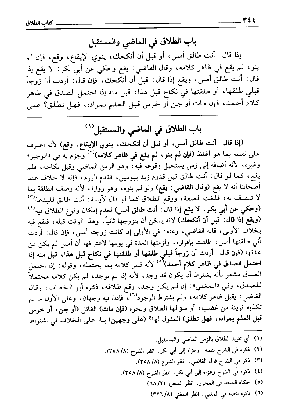 الطَّلَاقُ فِي الْمَاضِي وَالْمُسْتَقْبَلِ إِذَا قَالَ: أَنْتِ طَالِقٌ أَمْسُ، أَوْ قَبْلَ أَنْ أَنْكِحَكِ، يَنْوِي الْإِيقَاعَ - وَقَعَ، فَإِنْ لَمْ يَنْوِ، لَمْ يَقَعْ فِي ظَاهِرِ كَلَامِهِ وَقَالَ الْقَاضِي: يَقَعُ، وَحُكِيَ عَنْ أَبِي بَكْرٍ: لَا يَقَعُ إِذَا قَالَ: أَنْتِ طَالِقٌ أَمْسُ، وَيَقَعُ إِذَا قَالَ: قَبْلَ أَنْ أَنْكِحَكِ، فَإِنْ قَالَ: أَرَدْتُ أَنَّ زَوْجًا قَبْلِي طَلَّقَهَا، أَوْ طَلَّقْتُهَا فِي نِكَاحٍ قَبْلَ هَذَا - قُبِلَ مِنْهُ، إِذَا احْتَمَلَ الصِّدْقَ فِي ظَاهِرِ كَلَامِ أَحْمَدَ، فَإِنْ مَاتَ، أَوْ جُنَّ، أَوْ خَرِسَ قَبْلَ الْعِلْمِ بِمُرَادِهِ، فَهَلْ تُطَلَّقُ؟ عَلَى