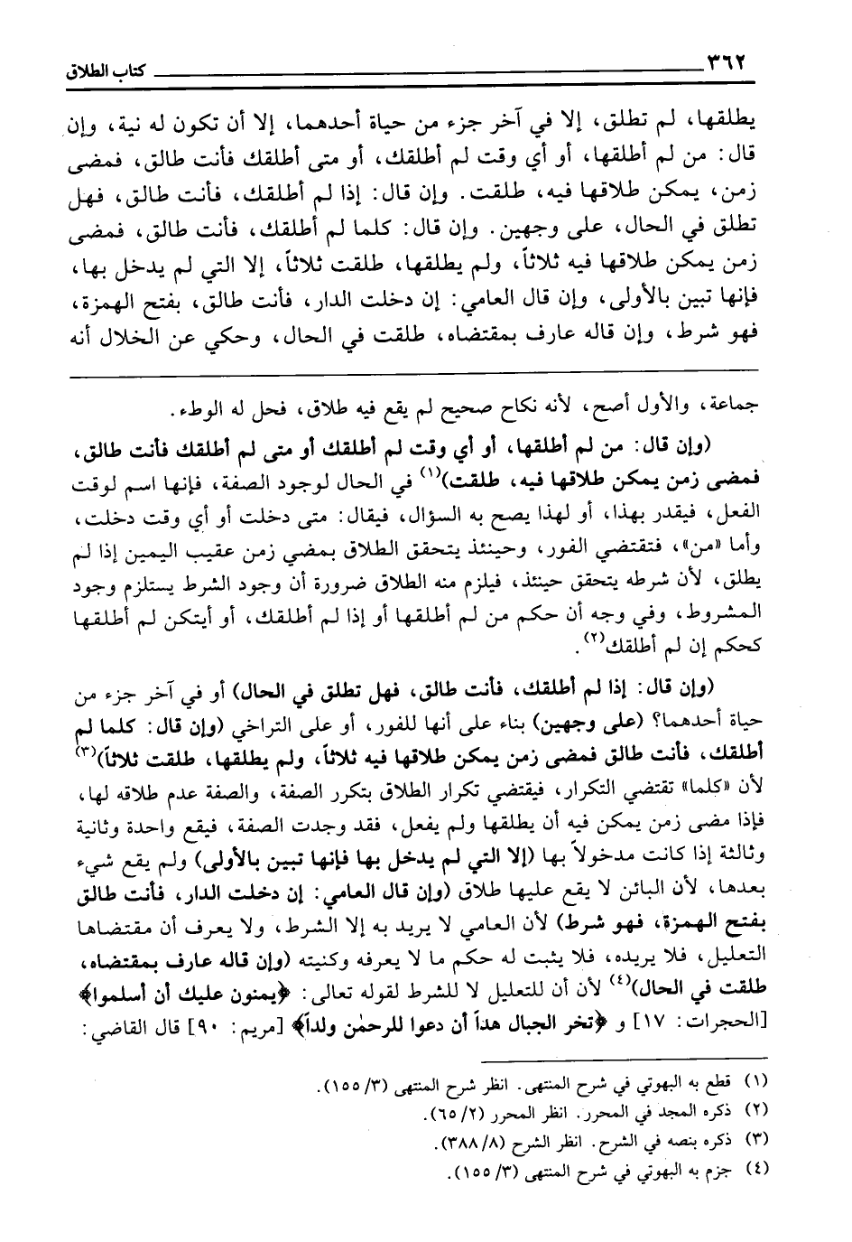 يُطَلِّقْهَا لَمْ تُطَلَّقْ إِلَّا فِي آخِرِ جُزْءٍ مِنْ حَيَاةِ أَحَدِهِمَا، إِلَّا أَنْ تَكُونَ لَهُ نِيَّةٌ، وَإِنْ قَالَ: مَنْ لَمْ أُطَلِّقْهَا، أَوْ أَيَّ وَقْتٍ لَمْ أُطَلِّقْكِ، أو متى أُطَلِّقْكِ فَأَنْتِ طَالِقٌ، فَمَضَى زَمَنٌ يُمْكِنُ طَلَاقُهَا فِيهِ - طُلِّقَتْ، وَإِنْ قَالَ: إِذَا لَمْ أُطَلِّقْكِ فَأَنْتِ طَالِقٌ، فَهَلْ تُطَلَّقُ فِي الْحَالِ؟ عَلَى وَجْهَيْنِ، وَإِنْ قَالَ: كُلَّمَا لَمْ أُطَلِّقْكِ فَأَنْتِ طَالِقٌ، فَمَضَى زَمَنٌ يُمْكِنُ طَلَاقُهَا فِيهِ ثَلَاثًا وَلَمْ يُطَلِّقْهَا - طُلِّقَتَ ثَلَاثًا، إِلَّا الَّتِي لَمْ يَدْخُلْ بِهَا، فَإِنَّهَا تَبِينُ بِالْأُولَى، وَإِنْ قَالَ الْعَامِّيُّ: إنْ دَخَلْتِ الدَّارَ فَأَنْتِ طَالِقٌ - بِفْتَحِ الْهَمْزَةِ - فَهُوَ شَرْطٌ، وَإِنْ قَالَهُ عَارِفٌ بِمُقْتَضَاهُ، طُلِّقَتْ فِي الْحَالِ، وَحُكِيَ عَنِ الْخَلَّالِ أَنَّهُ