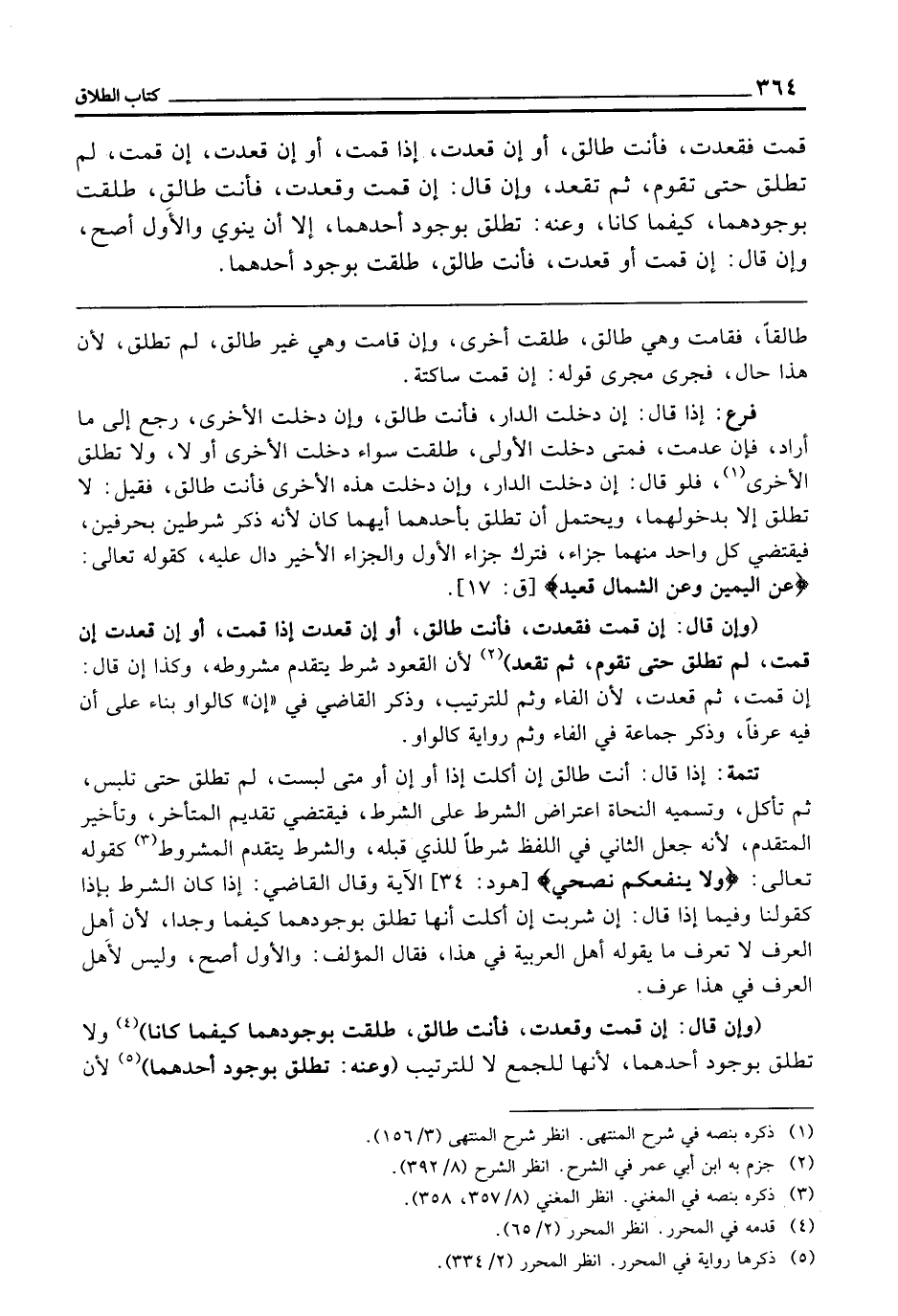 (وَإِنْ قَالَ: إِنْ قُمْتِ وَقَعَدْتِ فَأَنْتِ طَالِقٌ - طُلِّقَتْ بِوُجُودِهِمَا كَيْفَمَا كَانَا) وَلَا تُطَلَّقُ بِوُجُودِ أَحَدِهِمَا؛ لِأَنَّهَا لِلْجَمْعِ لَا لِلتَّرْتِيبِ (وَعَنْهُ: تُطَلَّقُ بِوُجُودِ أَحَدِهِمَا) ؛ لِأَنَّ