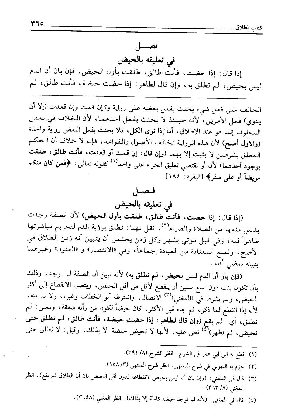 فِي تَعْلِيقِهِ بِالْحَيْضِ (إِذَا قَالَ: إِذَا حِضْتِ، فَأَنْتِ طَالِقٌ، طُلِّقَتْ بِأَوَّلِ الْحَيْضِ) ؛ لِأَنَّ الصِّفَةَ وُجِدَتْ بِدَلِيلِ مَنْعِهَا مِنَ الصَّلَاةِ وَالصِّيَامِ، نَقَلَ مُهَنَّا: تُطَلَّقُ بِرُؤْيَةِ الدَّمِ؛ لِتَحْرِيمِ مُبَاشَرَتِهَا طَاهِرًا فِيهِ، وَفِي قَبْلِ مَوْتِي بِشَهْرٍ، وَكُلُّ زَمَنٍ يُحْتَمَلُ أَنْ يَتَبَيَّنَ أَنَّهُ زَمَنُ الطَّلَاقِ فِي الْأَصَحِّ، وَلِمَنْعِ الْمُعْتَادَةِ مِنَ الْعِبَادَةِ إِجْمَاعًا، وَفِي " الِانْتِصَارِ " و" الْفُنُونِ " وَغَيْرِهِمَا بِتَبَيُّنِهِ بِمُضِيِّ أَقَلِّهِ.