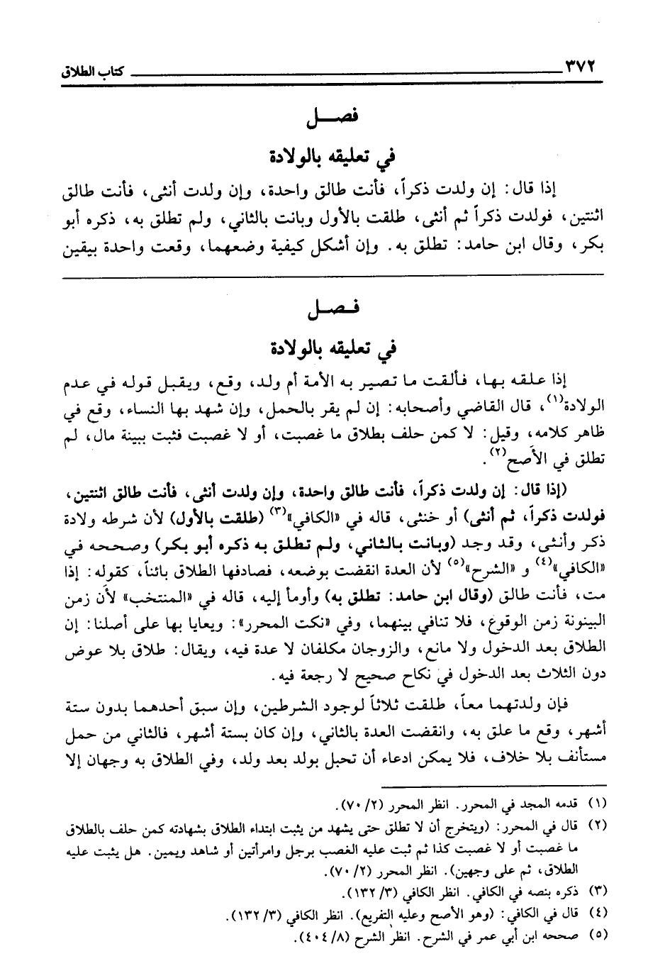 فِي تَعْلِيقِهِ بِالْوِلَادَةِ إِذَا قَالَ: إِنْ وَلَدْتِ ذَكَرًا فَأَنْتِ طَالِقٌ وَاحِدَةً، وَإِنْ وَلَدْتِ أُنْثَى فَأَنْتِ طَالِقٌ اثْنَتَيْنِ، فَوَلَدَتْ ذَكَرًا ثُمَّ أُنْثَى، طُلِّقَتْ بِالْأَوَّلِ، وَبَانَتْ بِالثَّانِي، وَلَمْ تُطَلَّقْ بِهِ، ذَكَرَهُ أَبُو بَكْرٍ، وَقَالَ ابْنُ حَامِدٍ: تُطَلَّقُ بِهِ، وَإِنْ أُشْكِلَ كَيْفِيَّةُ وَضْعِهِمَا، وَقَعَتْ وَاحِدَةٌ بِيَقِينٍ