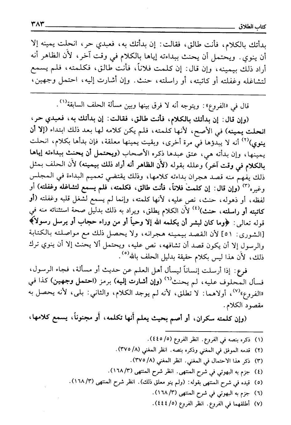 بَدَأْتُكِ بِالْكَلَامِ فَأَنْتِ طَالِقٌ، فَقَالَتْ: إِنْ بَدَأْتُكَ بِهِ فَعَبْدِي حُرٌّ - انْحَلَّتْ يَمِينُهُ، إِلَّا أَنْ يَنْوِيَ، وَيُحْتَمَلُ أَنْ يَحْنَثَ بِبَدَاءَتِهِ إِيَّاهَا بِالْكَلَامِ فِي وَقْتٍ آخَرَ؛ لِأَنَّ الظَّاهِرَ أَنَّهُ أَرَادَ ذَلِكَ بِيَمِينِهِ، وَإِنْ قَالَ: إِنْ كَلَّمْتِ فُلَانًا، فَأَنْتِ طَالِقٌ، فَكَلَّمَتْهُ، فَلَمْ يَسْمَعْ لِتَشَاغُلِهِ وغَفْلَتِهِ، أَوْ كَاتَبَتْهُ، أَوْ رَاسَلَتْهُ - حَنِثَ، وَإِنْ أَشَارَتْ إِلَيْهِ، احْتَمَلَ وَجْهَيْنِ،