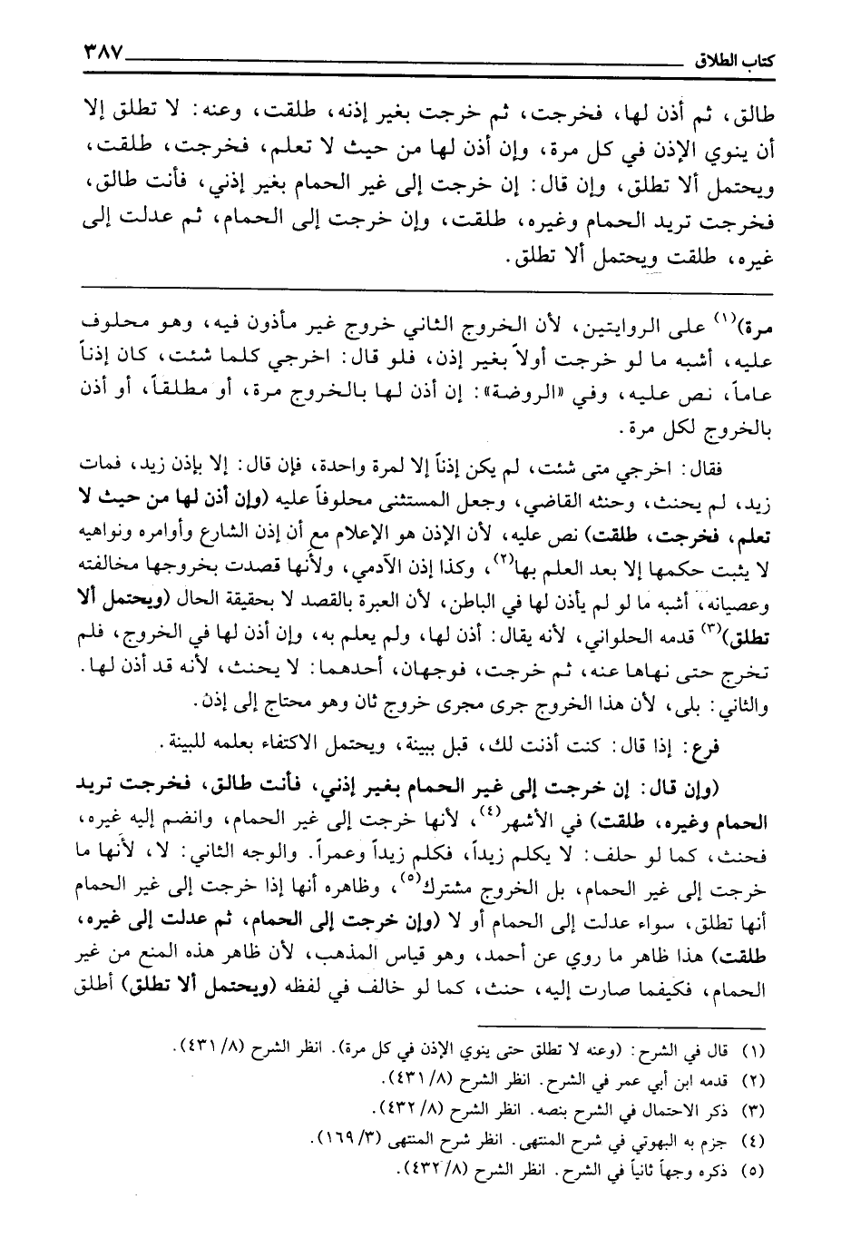 (وَإِنْ قَالَ: إِنْ خَرَجْتِ إِلَى غَيْرِ الْحَمَّامِ بِغَيْرِ إِذْنِي فَأَنْتِ طَالِقٌ، فَخَرَجَتْ تُرِيدُ الْحَمَّامَ وَغَيْرَهُ - طُلِّقَتْ) فِي الْأَشْهَرِ؛ لِأَنَّهَا خَرَجَتْ إِلَى غَيْرِ الْحَمَّامِ، وَانْضَمَّ إِلَيْهِ غَيْرُهُ، فَحَنِثَ، كَمَا لَوْ حَلَفَ لَا يُكَلِّمُ زَيْدًا، فَكَلَّمَ زَيْدًا وَعَمْرًا، وَالْوَجْهُ الثَّانِي: لَا؛ لِأَنَّهَا مَا خَرَجَتْ إِلَى غَيْرِ الْحَمَّامِ، بَلِ الْخُرُوجُ مُشْتَرَكٌ، وَظَاهِرُهُ: أَنَّهَا إِذَا خَرَجَتْ إِلَى غَيْرِ الْحَمَّامِ أَنَّهَا تُطَلَّقُ، سَوَاءٌ عَدَلَتْ إِلَى الْحَمَّامِ أَوْ لَا (وَإِنْ خَرَجَتْ إِلَى الْحَمَّامِ، ثُمَّ عَدَلَتْ إِلَى غَيْرِهِ - طُلِّقَتْ) هَذَا ظَاهِرُ مَا رُوِيَ عَنْ أَحْمَدَ، وَهُوَ قِيَاسُ الْمَذْهَبِ؛ لِأَنَّ ظَاهِرَ هَذِهِ الْمَنْعُ مِنْ غَيْرِ الْحَمَّامِ، فَكَيْفَمَا صَارَتْ إِلَيْهِ حَنِثَ، كَمَا لَوْ خَالَفَ فِي لَفْظِهِ (وَيُحْتَمَلُ أَلَّا تُطَلَّقَ) أَطْلَقَ
